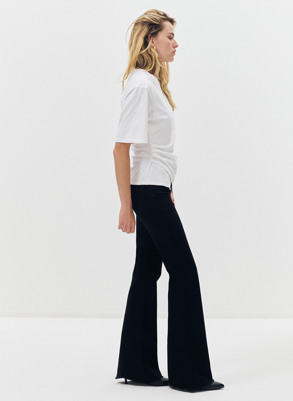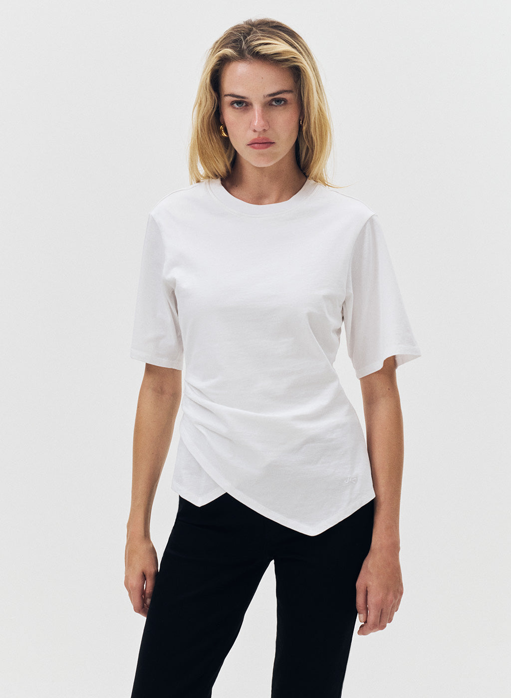 Le t-shirt Oshi, confectionné en jersey de coton organique doux et respirant, offre un tombé fluide mais structuré qui épouse délicatement la silhouette. Sa coupe ajustée à la taille met en valeur la ligne du corps, tandis que l’ourlet asymétrique, détail signature, apporte une note moderne et sophistiquée.