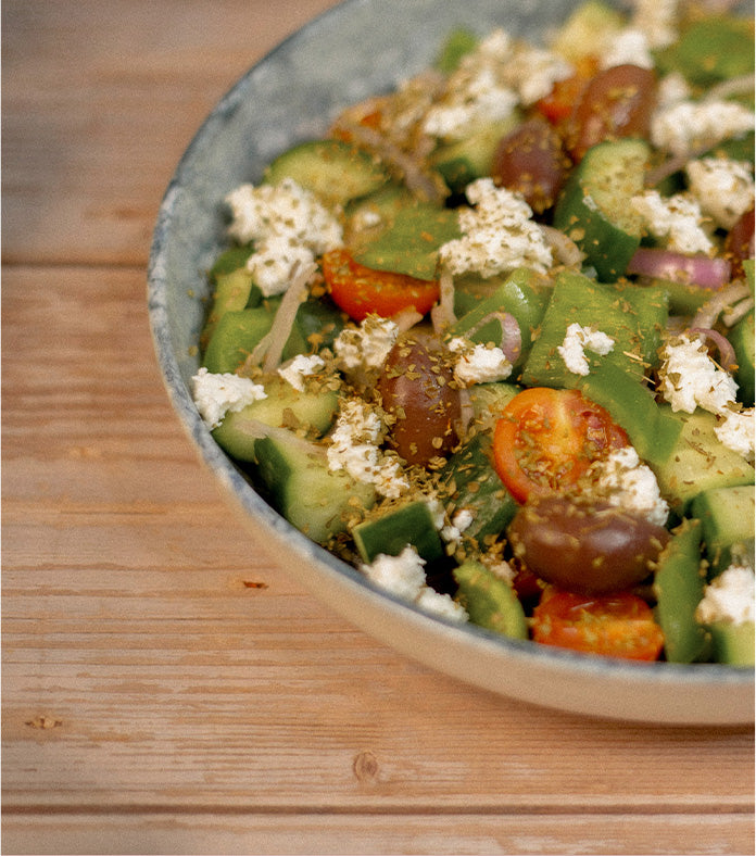 Mon plat incontournable de l’été : la véritable salade grecque, avec de la feta émiettée, des oignons, des tomates juteuses, des croûtons crétois et de savoureuses olives noires grecques.