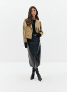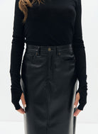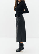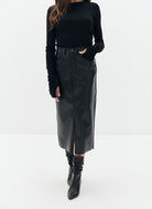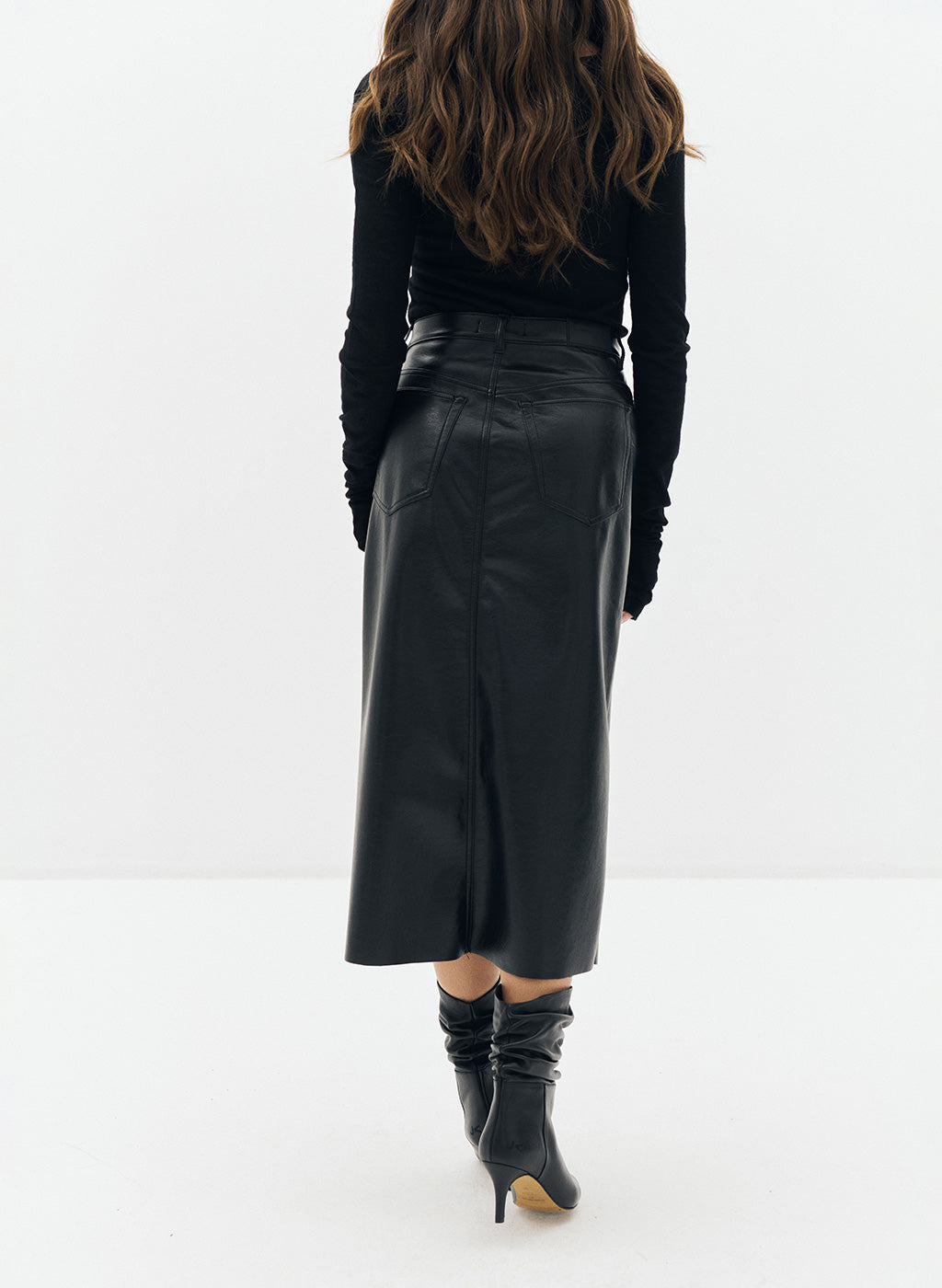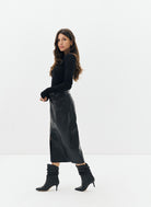 La jupe Calla en simili cuir noir s'impose par son mélange d’audace et d’élégance. Sa coupe droite fendue sur le devant élance la silhouette tout en offrant confort et liberté de mouvement. Les passants pour ceinture, la fermeture zippée et boutonnée ornée de boutons siglés "JV", ainsi que le jacron en cuir embossé au dos, soulignent l’attention portée aux détails. Non doublée et légère, elle se prête aussi bien à des looks de jour qu’à des tenues plus habillées.