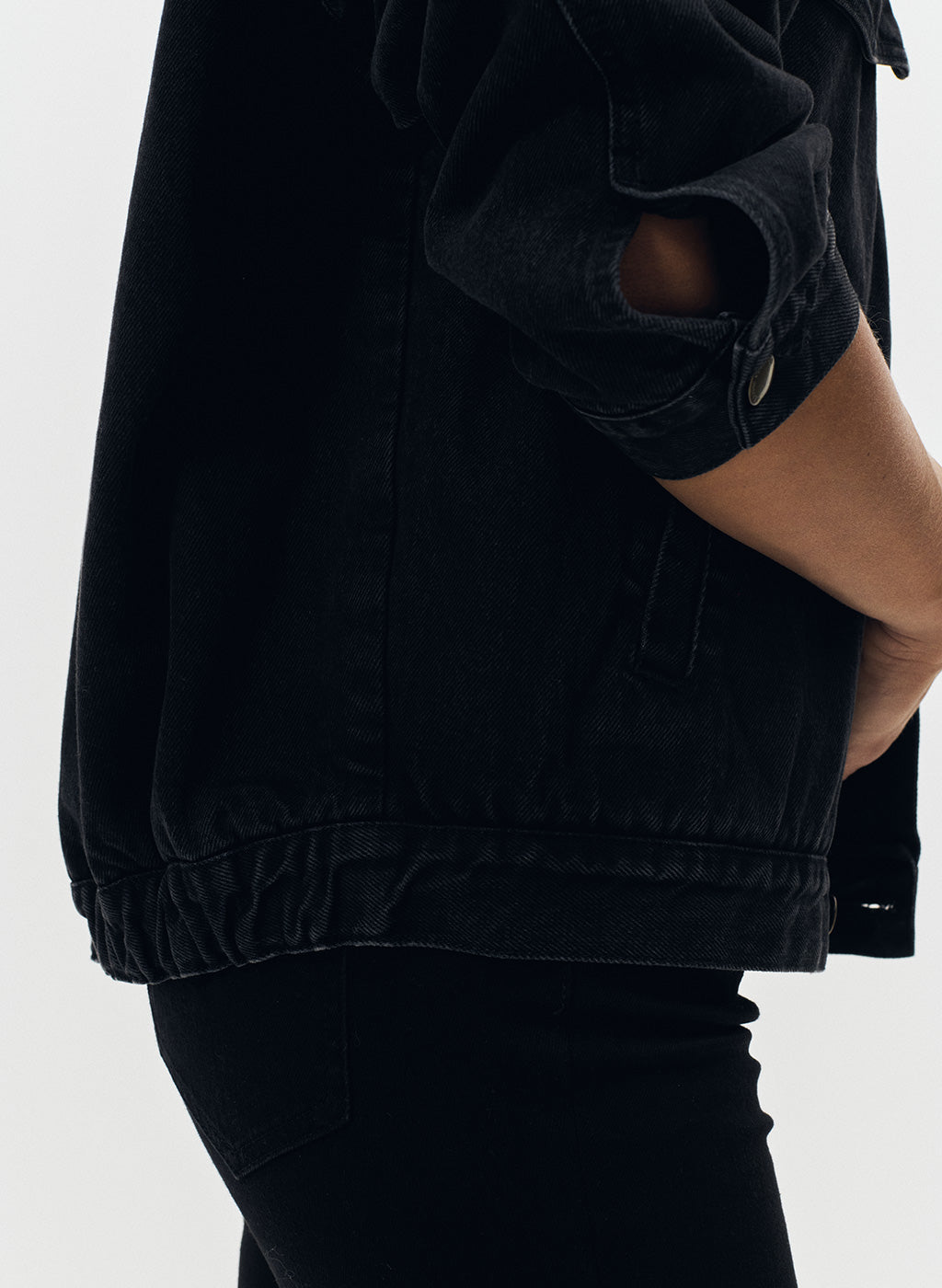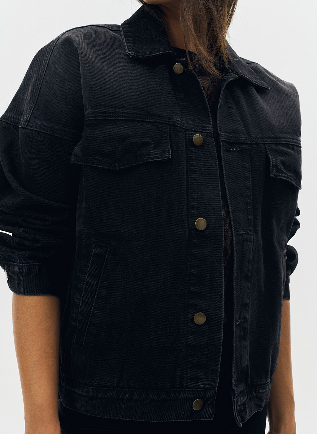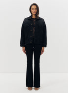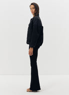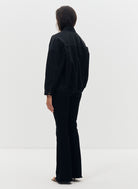 Le blouson Dana sera votre allié pour la demi-saison. Réalisé dans une toile de denim délavé noir, sa coupe ample aviateur et son style décontracté permettent de porter facilement ce bombers au dessus d'un pull ou même un sweat. Ce modèle dispose de quatre poches dont deux poches à rabats sur la poitrine et l'emblématique broderie "JV" ton sur ton sur le rabat d'une des poches. Sa fermeture se fait par boutons en métal gravés "Jeanne Vouland". Sa forme "boule" resserrée sur le bas est élastiquée au dos pour renforcer le look aviateur. Blouson non doublé.