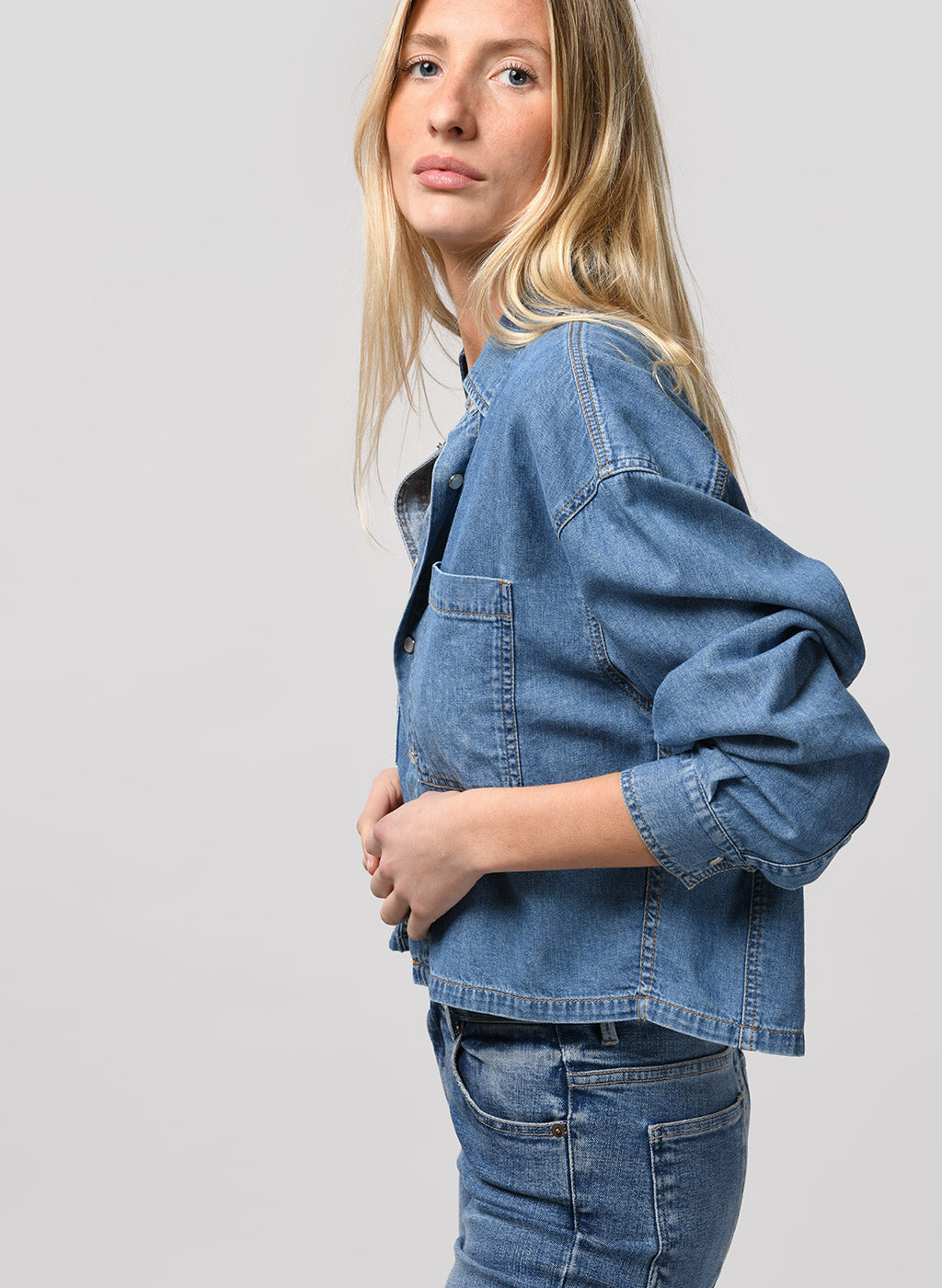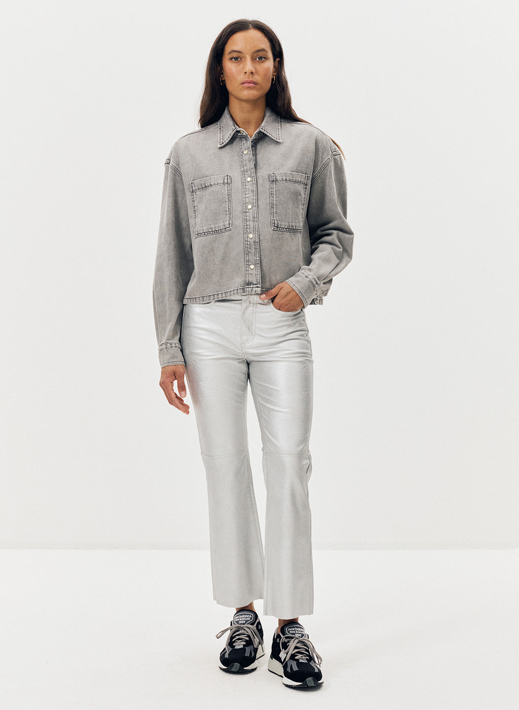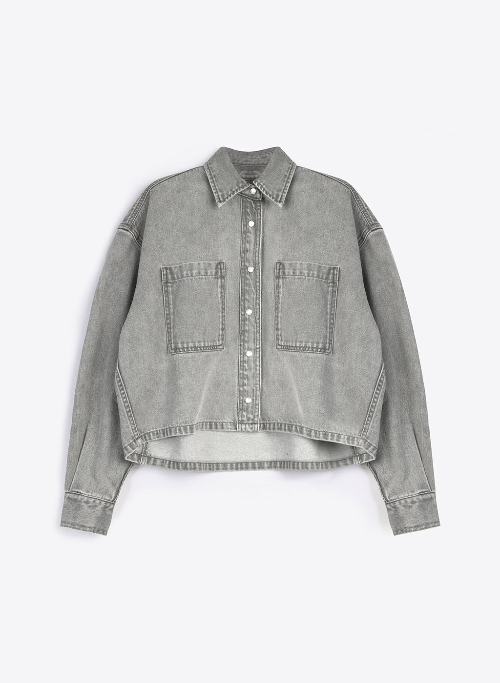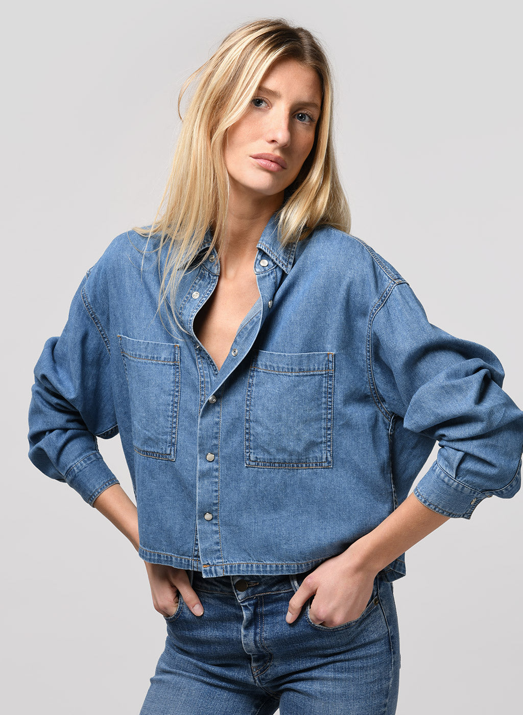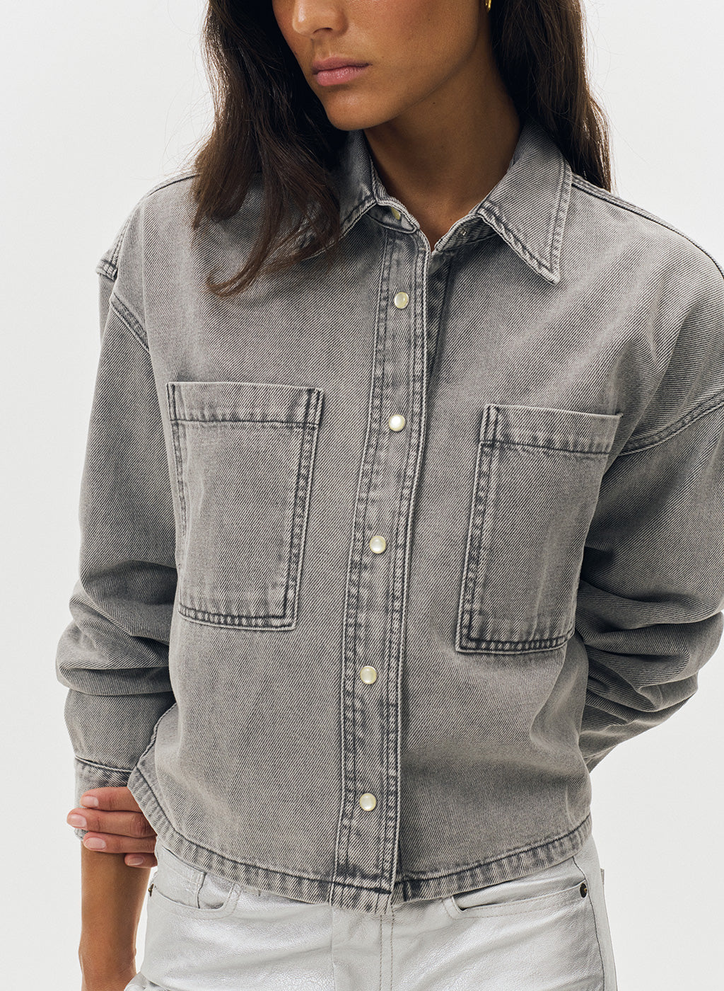 La chemise crop Jorgi en denim gris revisite l’esprit vintage avec une allure moderne et minimaliste. Sa coupe carrée et légèrement loose lui confère une attitude décontractée, parfaite pour être portée fermée avec un pantalon taille haute ou ouverte en surchemise. Confectionnée en coton brut, elle séduit par ses détails subtils : surpiqûres contrastées et boutons-pression nacrés à l’avant et aux poignets. Une pièce forte et intemporelle à associer facilement à votre vestiaire.