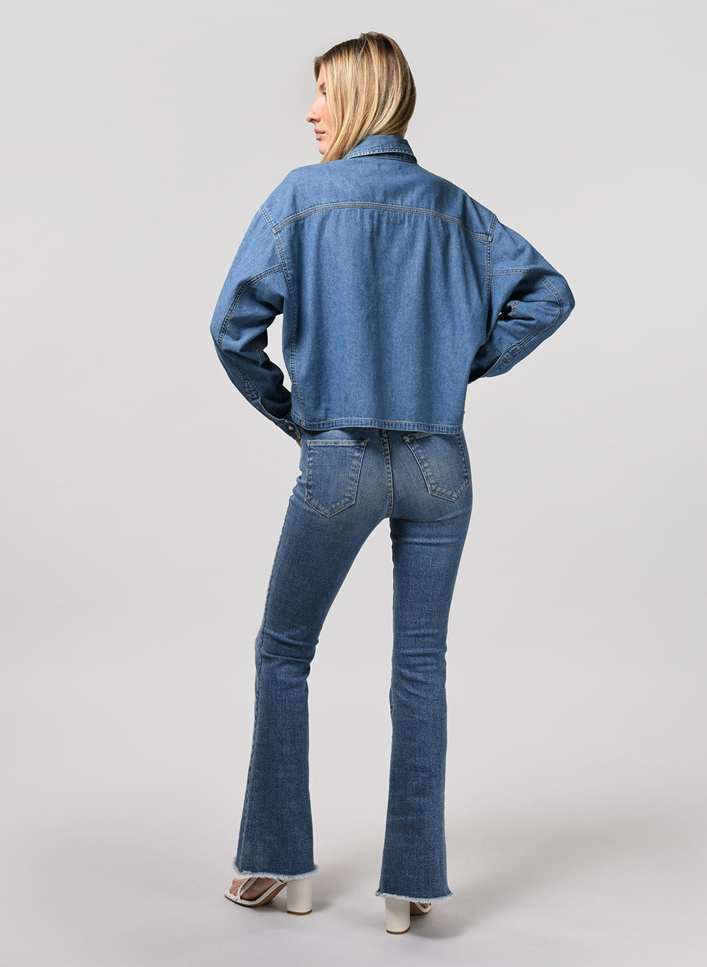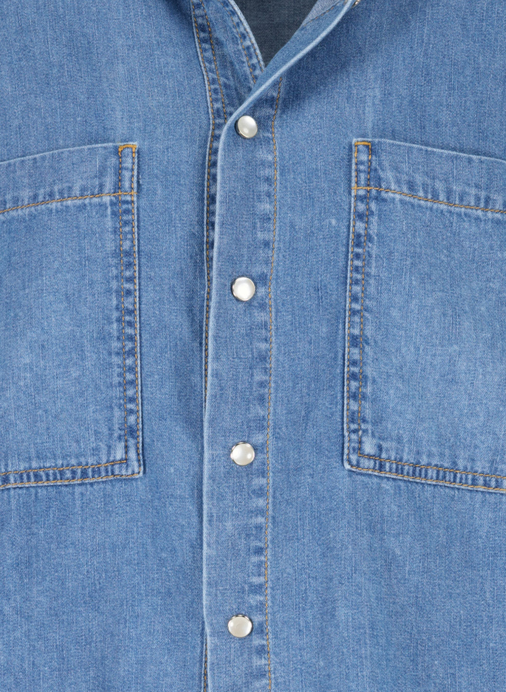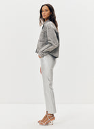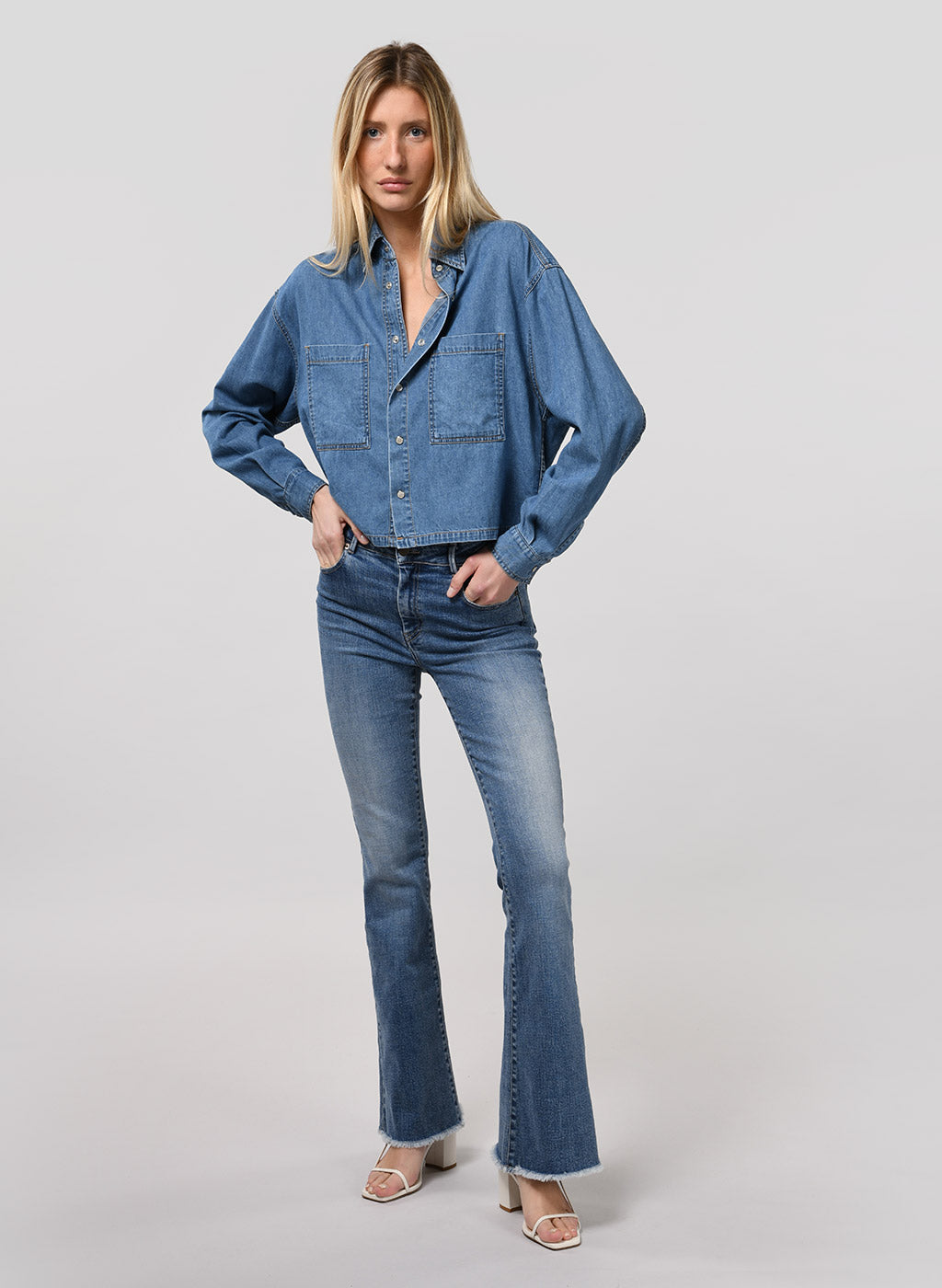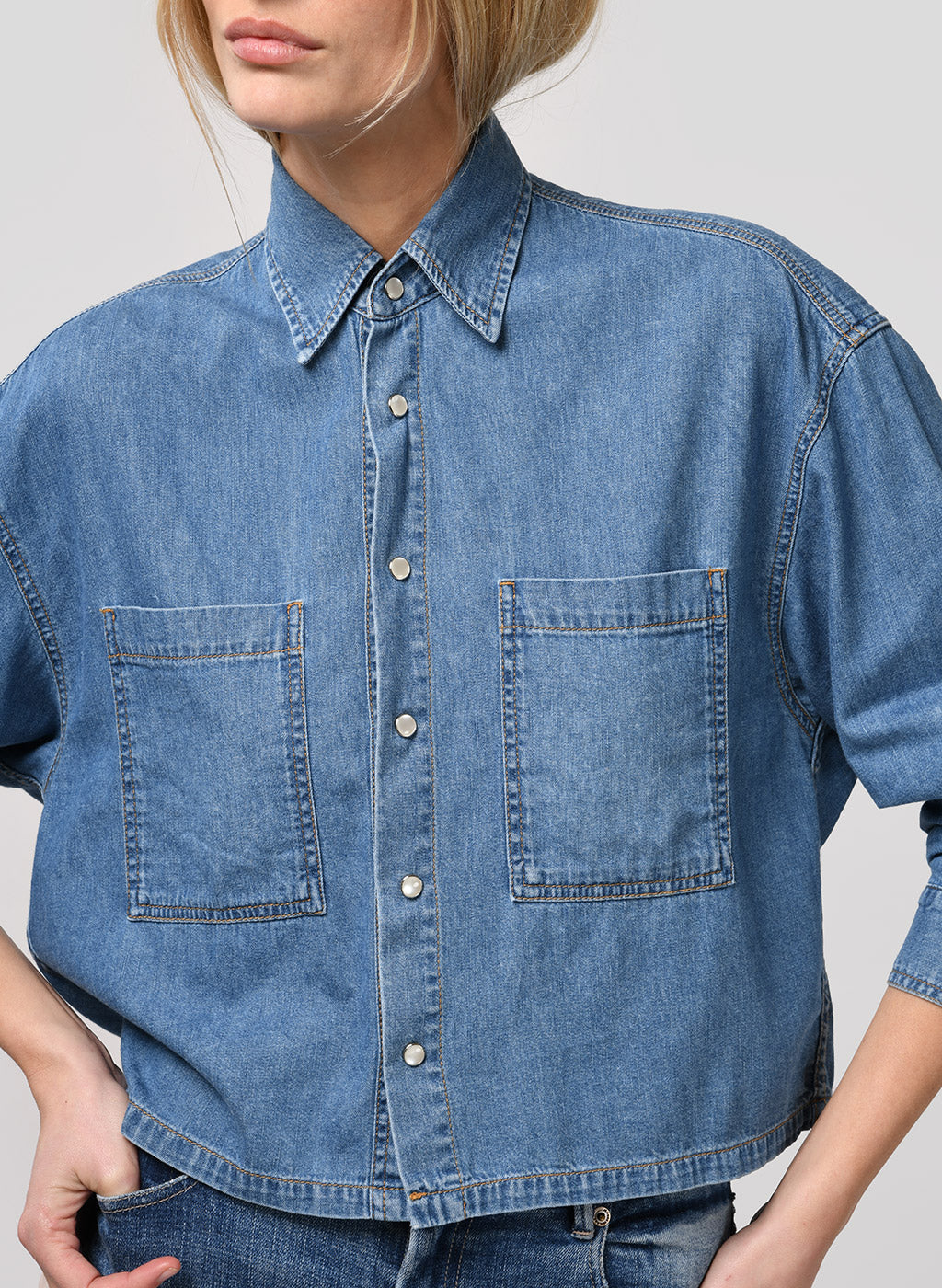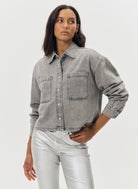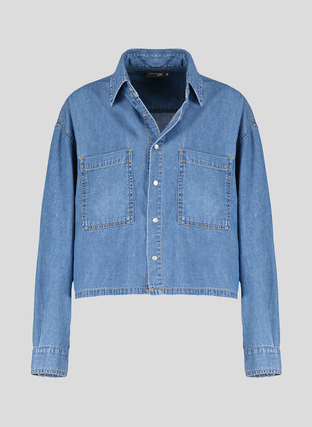 La chemise crop Jorgi en denim gris revisite l’esprit vintage avec une allure moderne et minimaliste. Sa coupe carrée et légèrement loose lui confère une attitude décontractée, parfaite pour être portée fermée avec un pantalon taille haute ou ouverte en surchemise. Confectionnée en coton brut, elle séduit par ses détails subtils : surpiqûres contrastées et boutons-pression nacrés à l’avant et aux poignets. Une pièce forte et intemporelle à associer facilement à votre vestiaire.