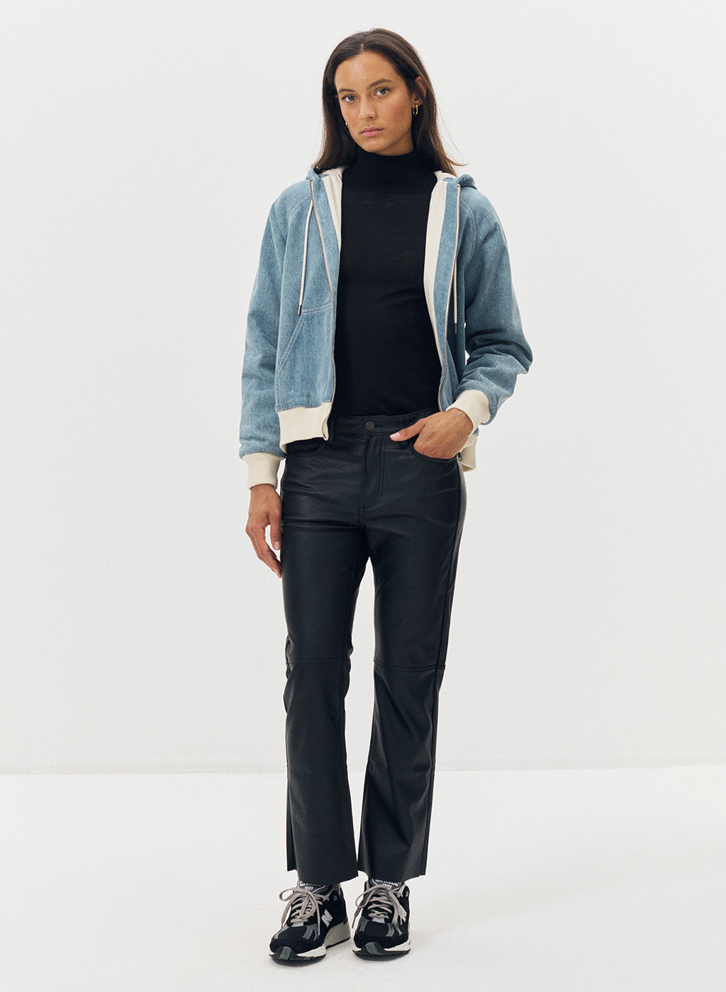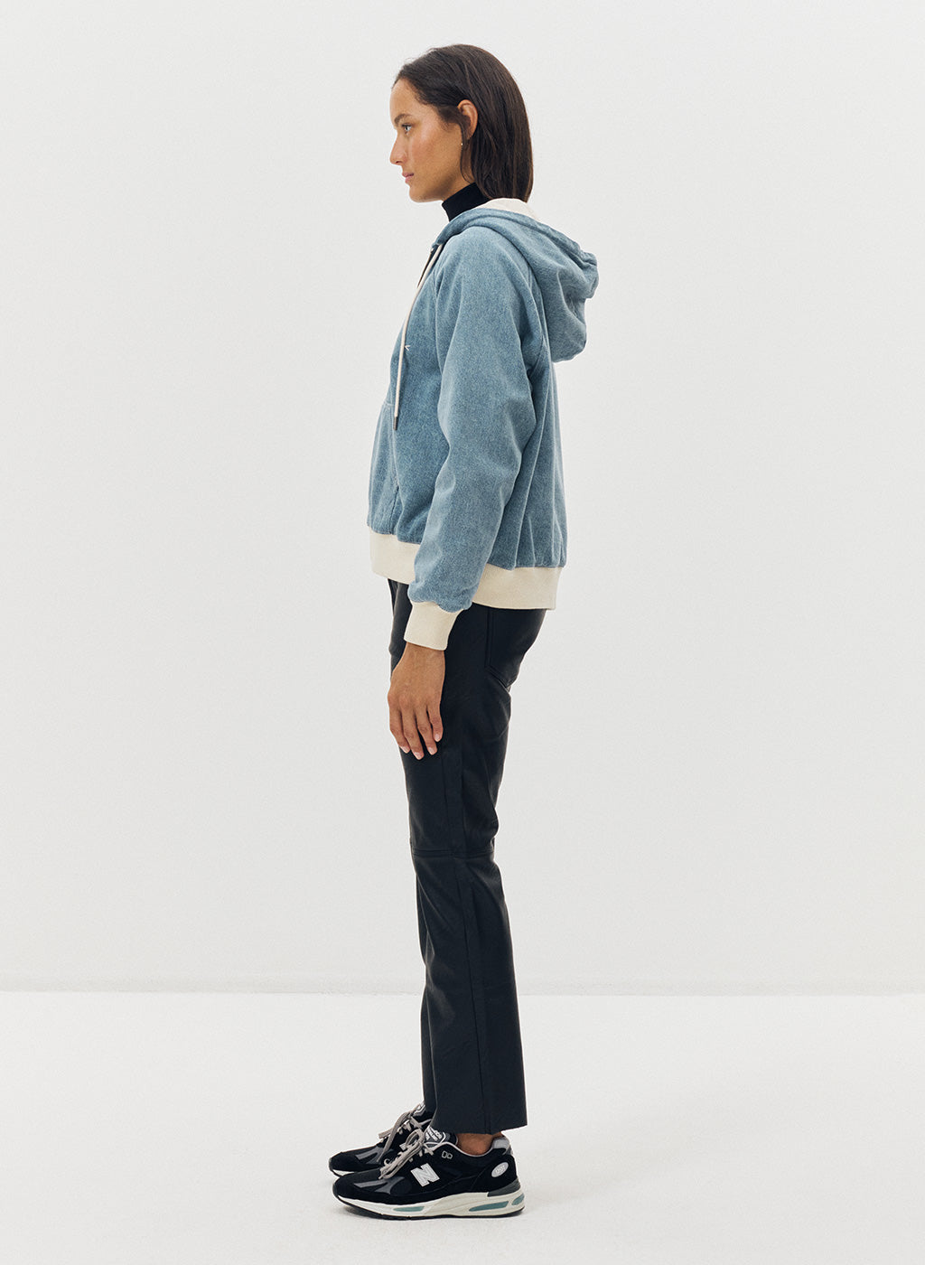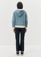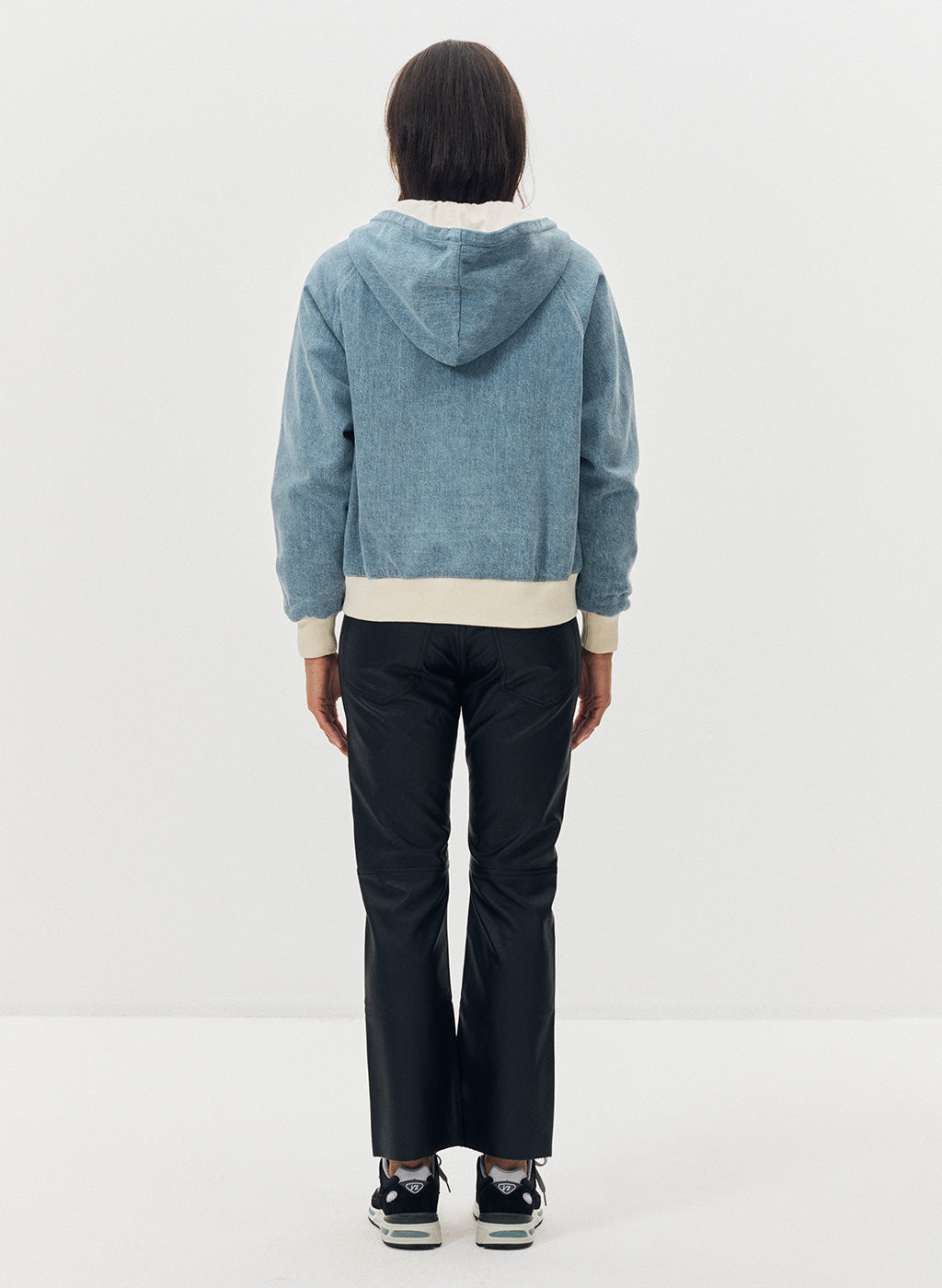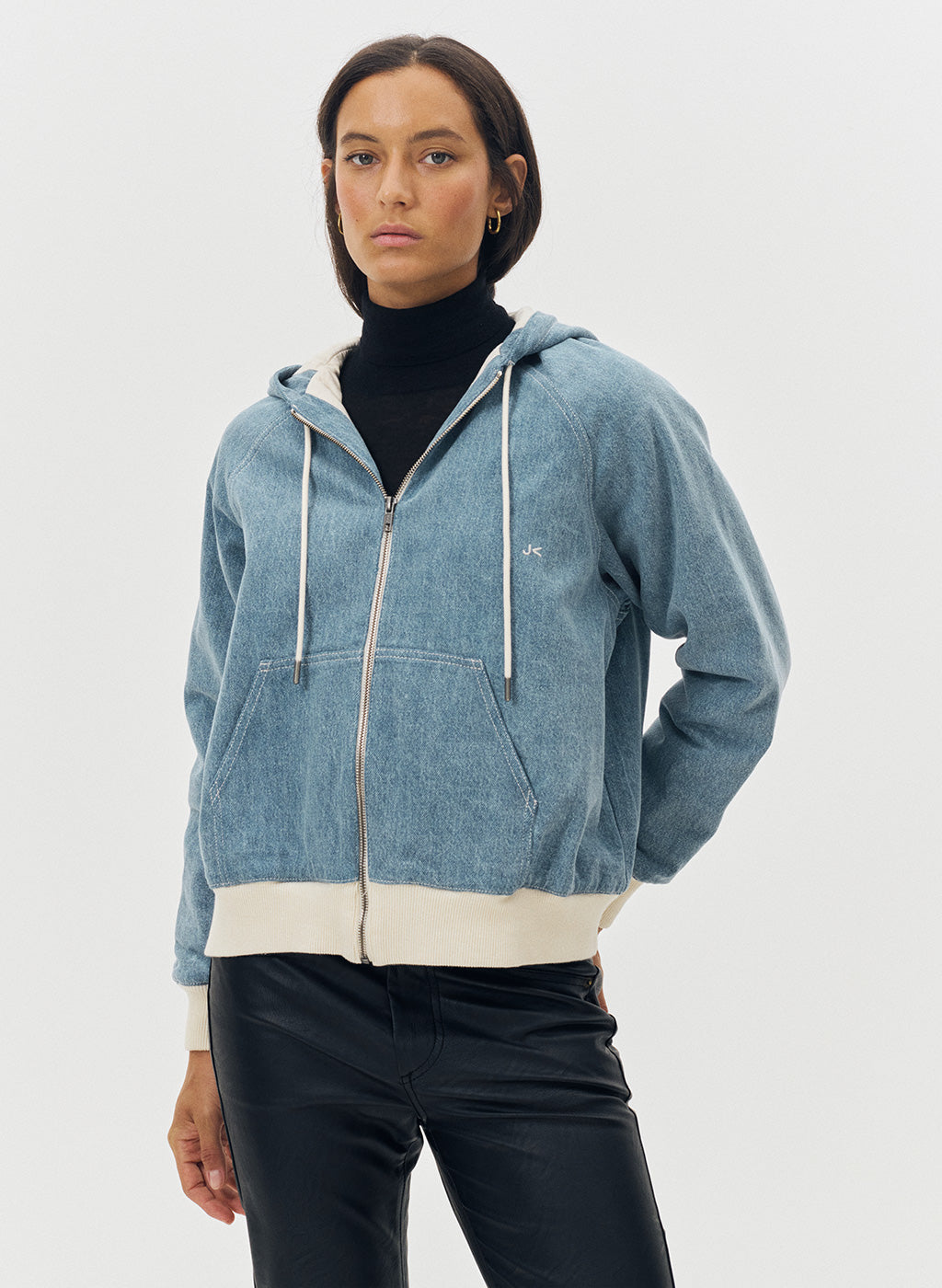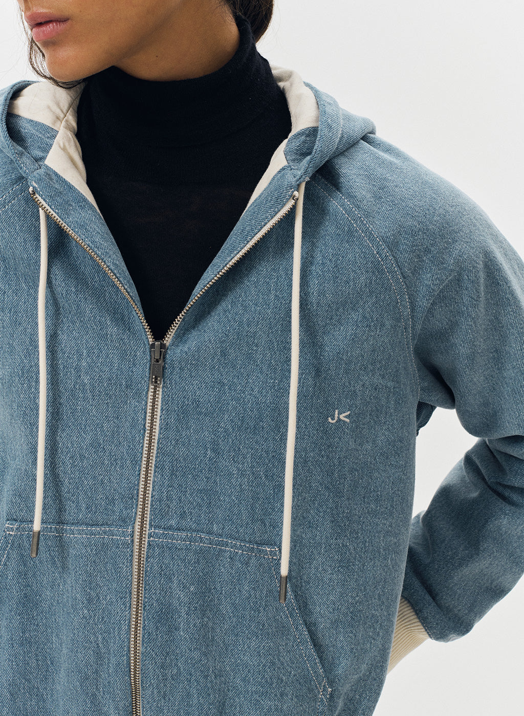 La veste Nanou en denim de coton bleu est un essentiel revisité, alliant confort et modernité. Sa coupe droite et oversize, ses manches longues à poignets côtelés blancs et sa base droite côtelée offrent une silhouette structurée et confortable. Le col montant zippé apporte une touche contemporaine, tandis que le logo JV brodé blanc sur la poitrine signe la pièce avec subtilité.