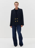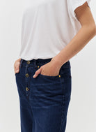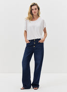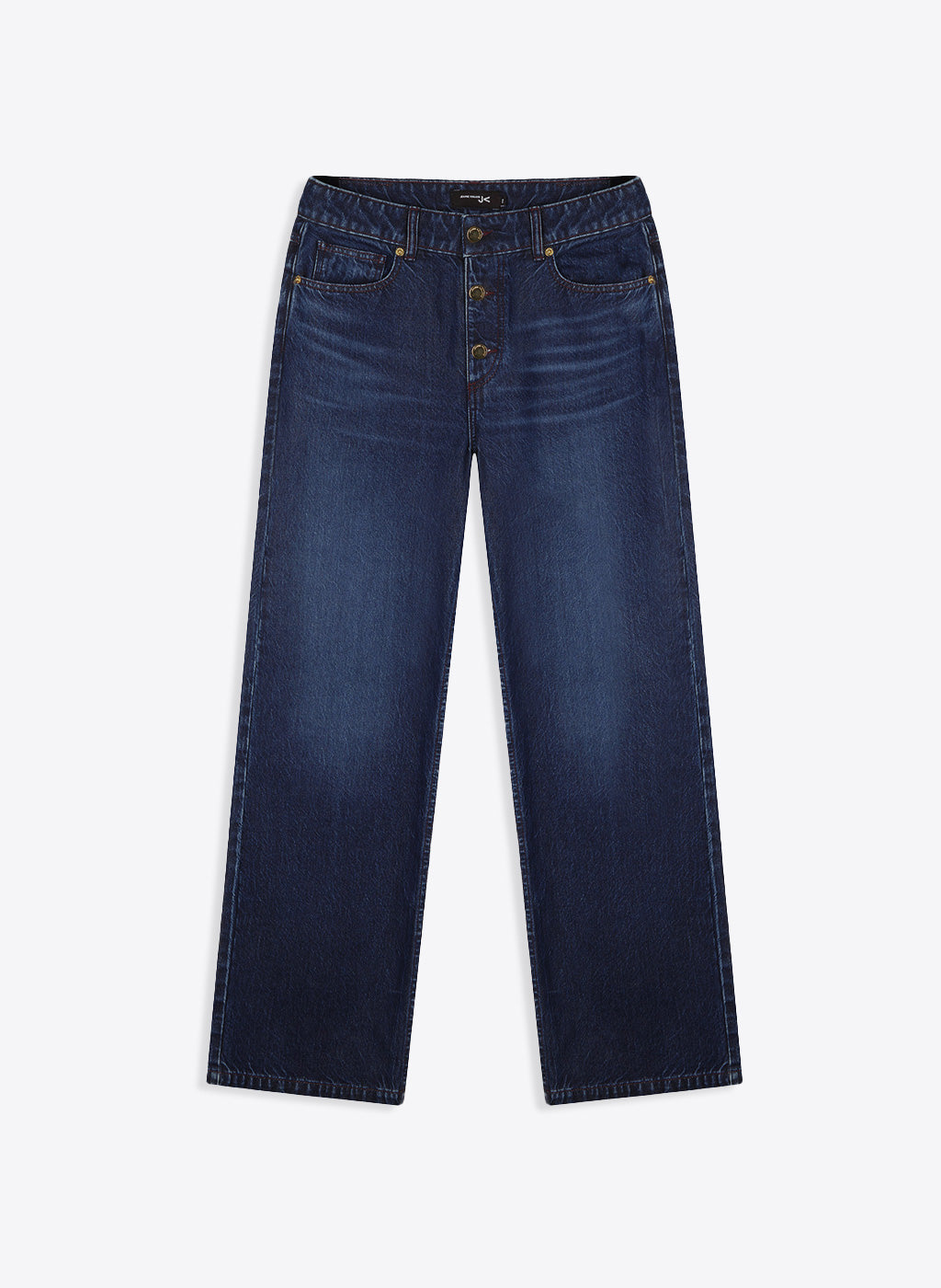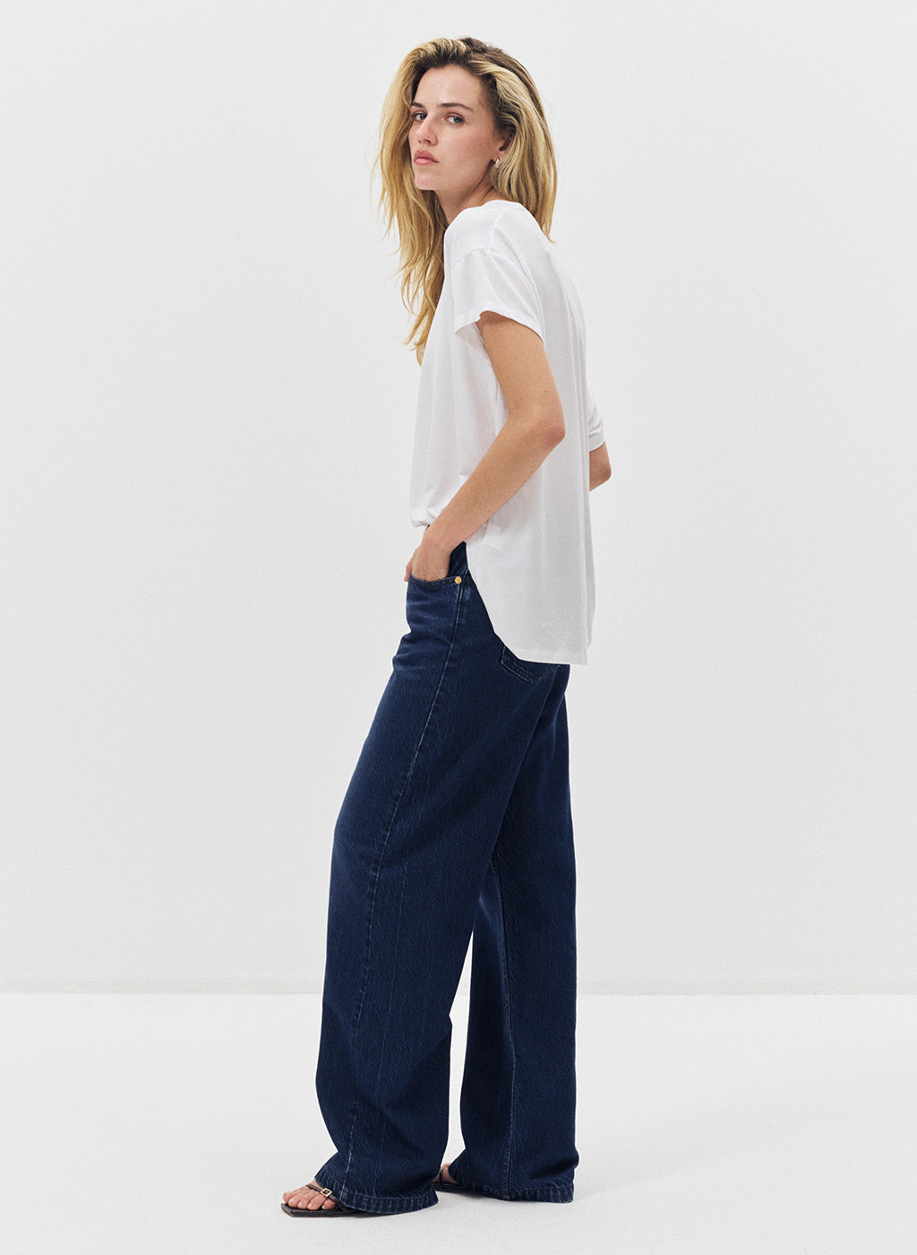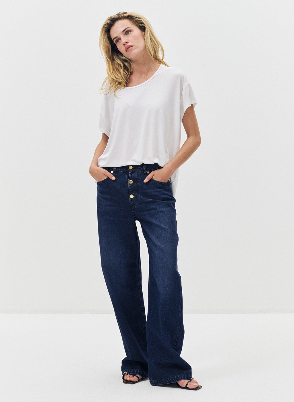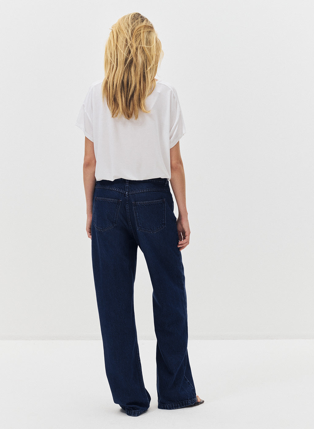 Le jean Otha, réalisé en denim bleu brut, propose une coupe droite et ample, offrant une silhouette décontractée mais structurée. Doté d’une braguette à trois boutons, de cinq poches classiques et de passants pour ceinture, il allie praticité et élégance. Les surpiqûres bordeaux apportent une touche de contraste subtile et distinctive, pour un look contemporain et raffiné.