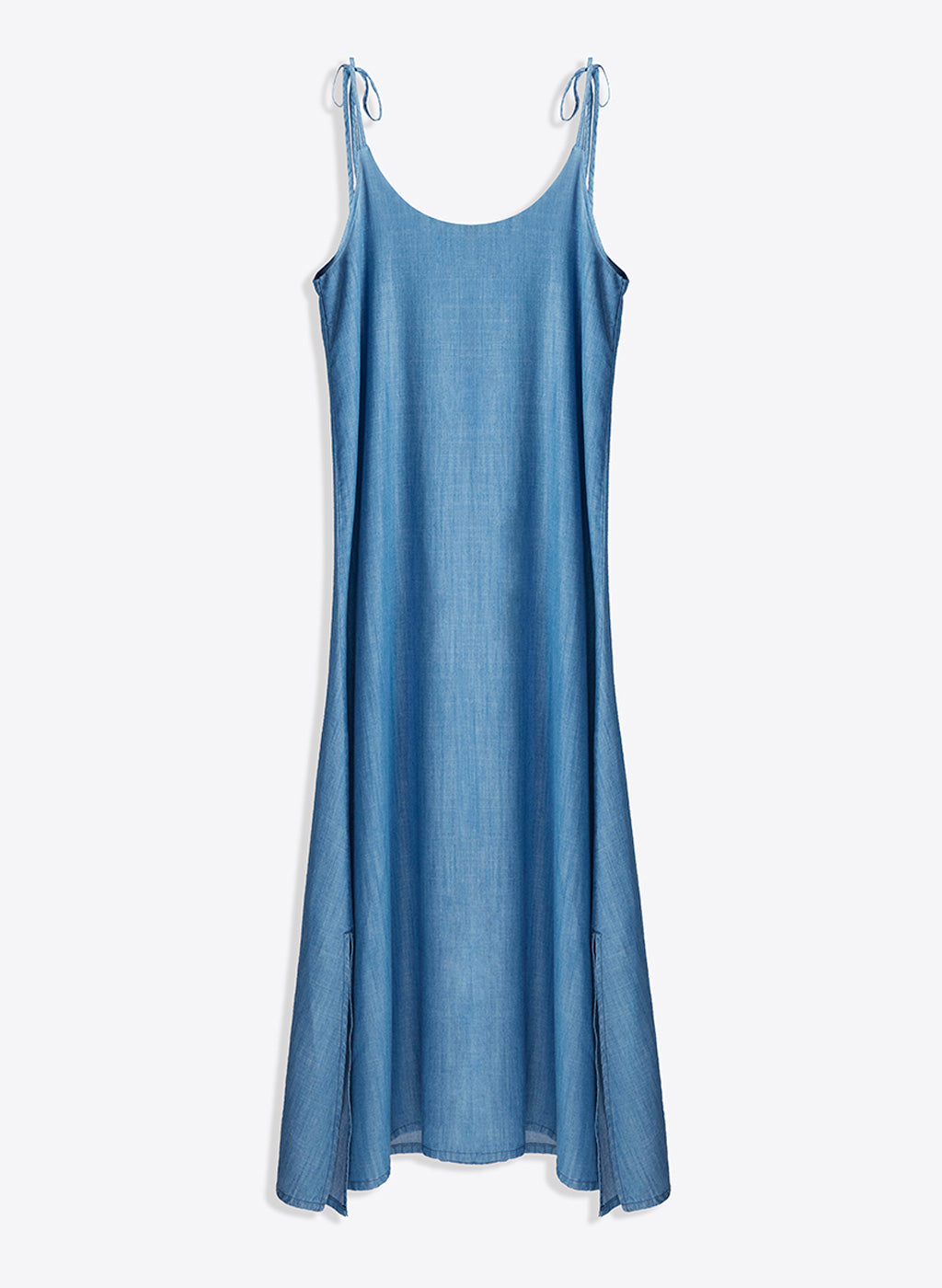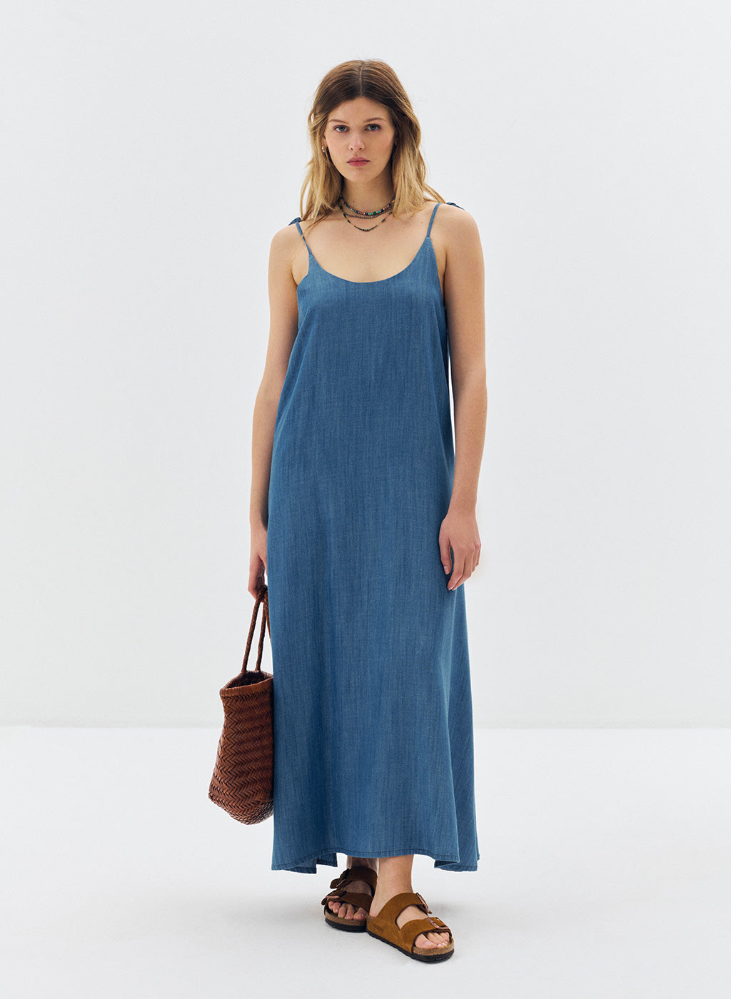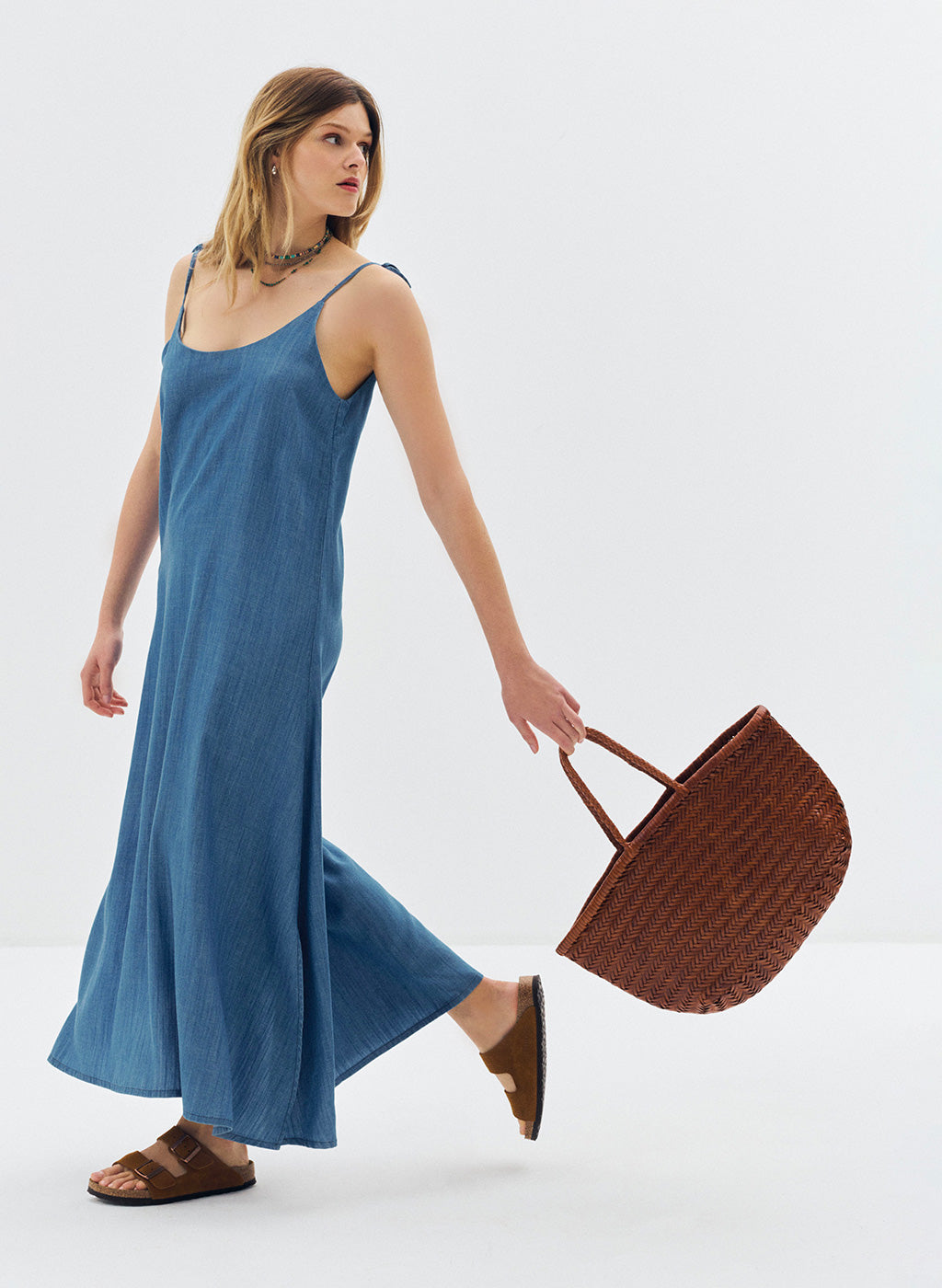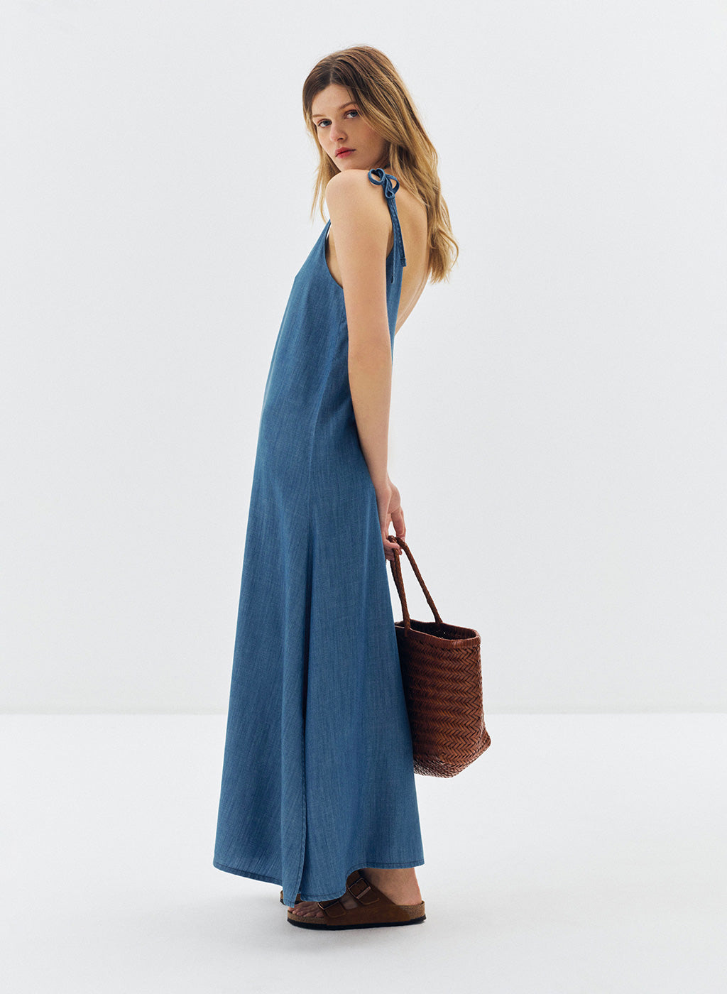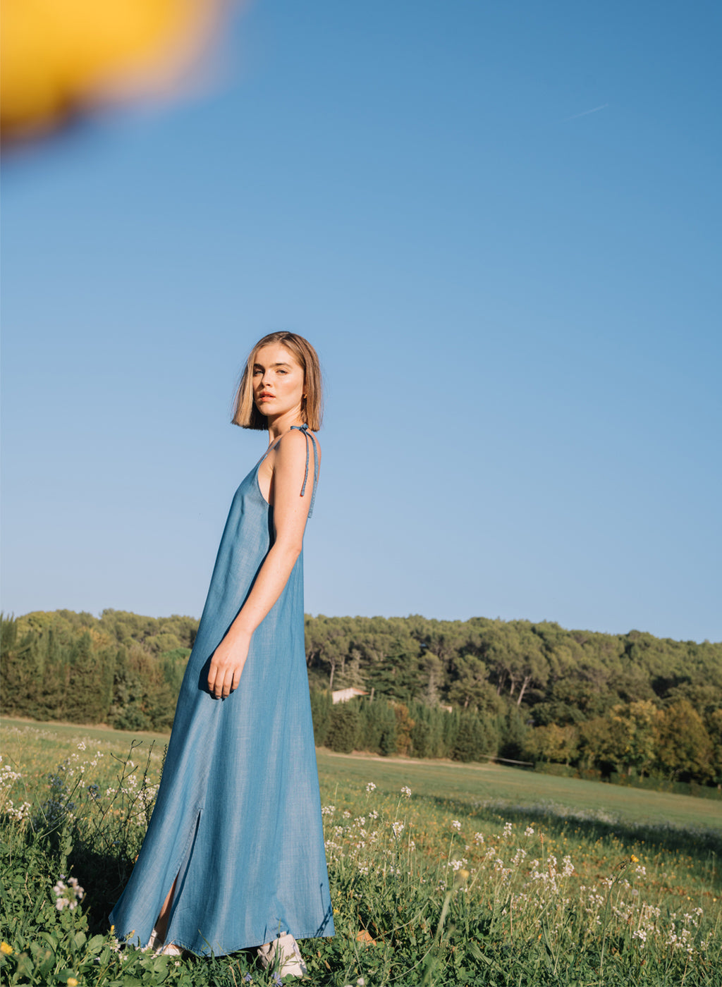 L'incontournable robe longue Dessy se décline cette saison en denim bleu pour un style à la fois décontracté et élégant. Son col rond et son décolleté dans le dos ajoutent une touche de féminité discrète, tandis que les liens à nouer aux épaules permettent un ajustement personnalisé et un porté unique. La fente latérale apporte légèreté et mouvement, offrant à cette robe une silhouette fluide et moderne. Non doublée, elle garantit confort et fraicheur, parfaite pour les journées estivales ou pour une tenue chic et décontractée.