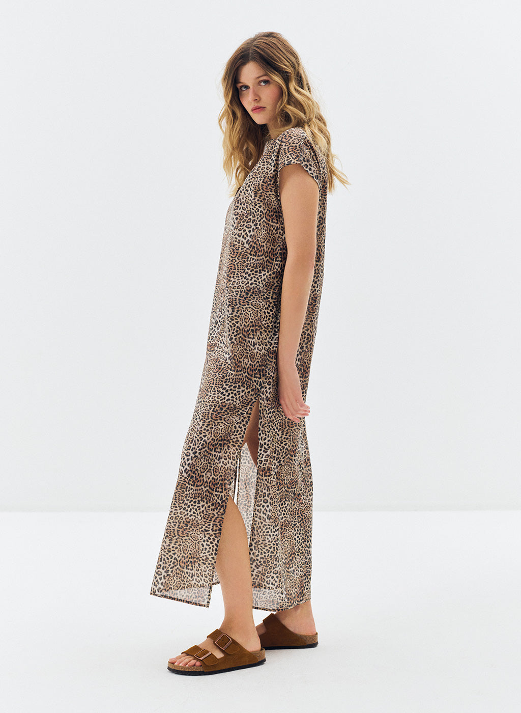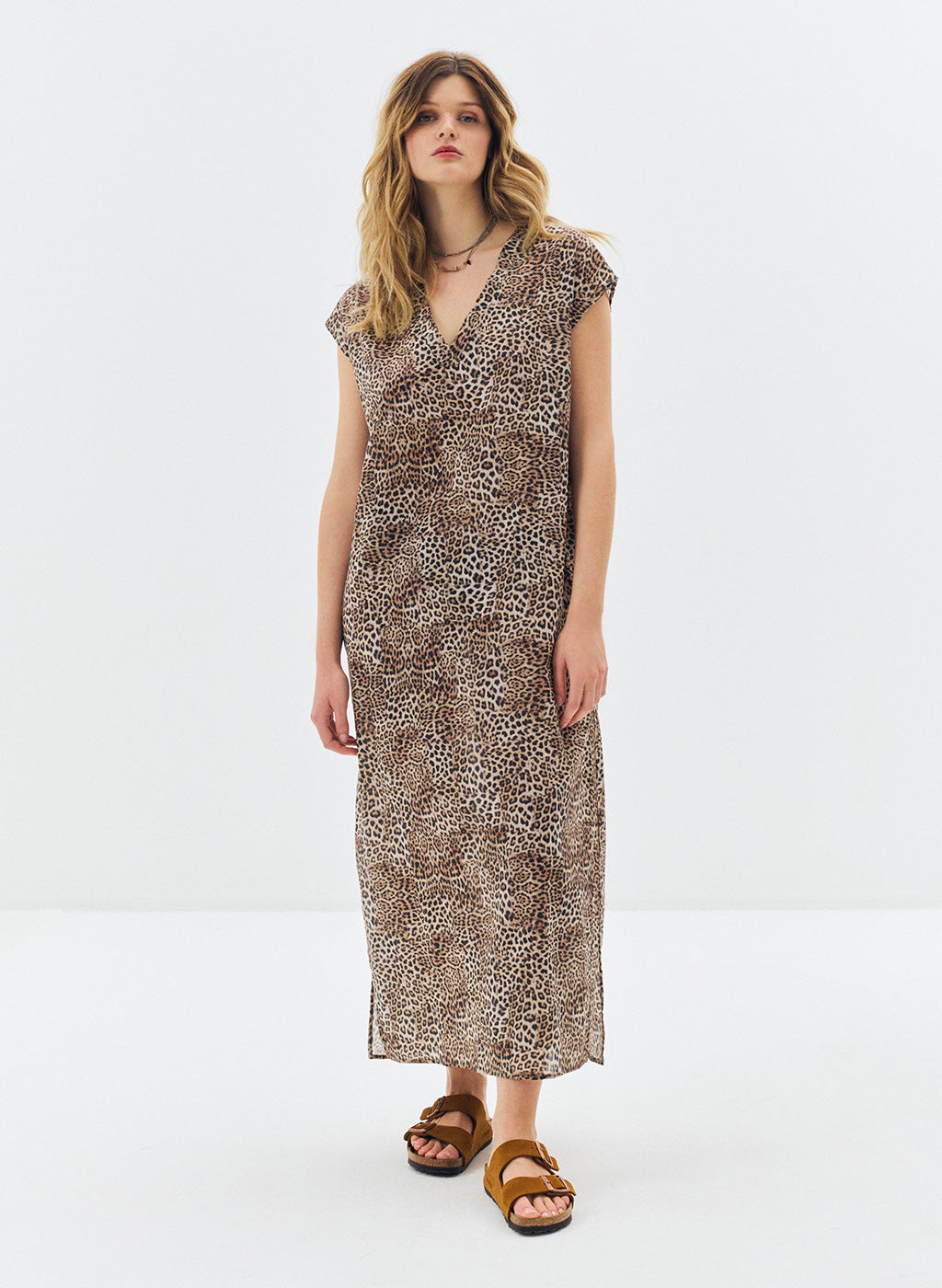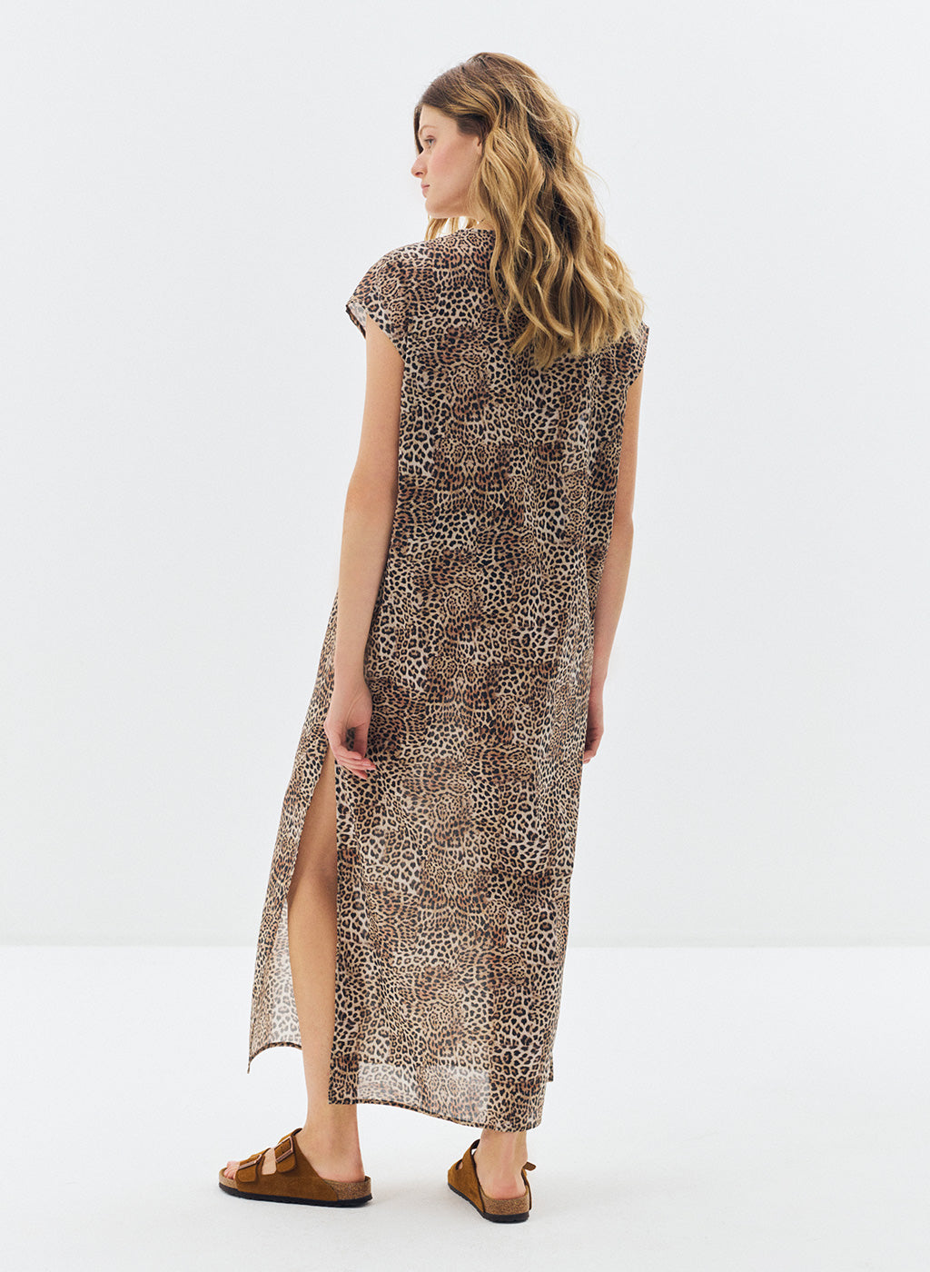 La robe Jadya, inspirée du kaftan de plage, se pare d’un imprimé léopard sauvage pour une allure à la fois tendance et audacieuse. Confectionnée en coton léger, elle est idéale pour les journées ensoleillées grâce à sa coupe ample et fluide, offrant un confort absolu. Sans manches et dotée d’un col en V, elle allie simplicité et élégance naturelle. Sa base droite fendue sur les côtés accentue la liberté de mouvement tout en apportant une touche moderne et raffinée. Parfaite pour une tenue décontractée en bord de mer ou une silhouette estivale chic.