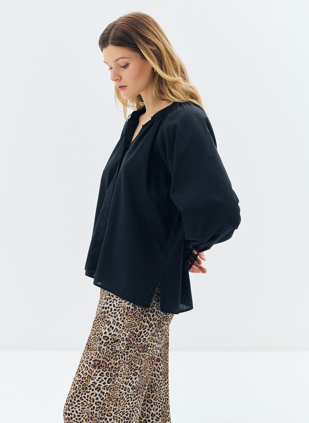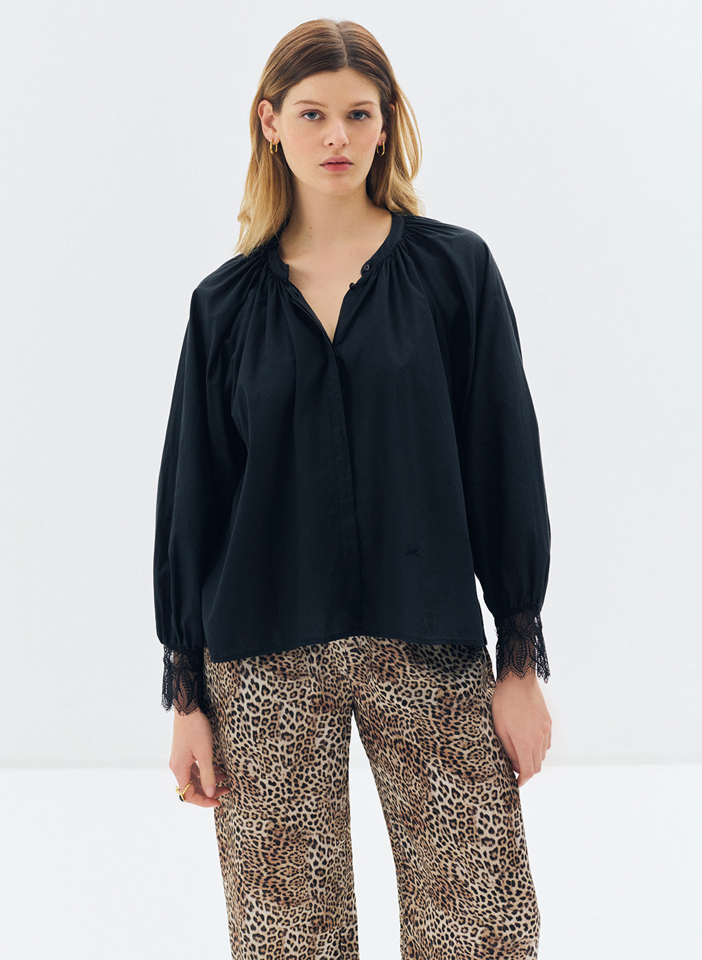 La blouse Nora en voile de coton noir semi-transparent conjugue légèreté et élégance. Son col rond délicatement plissé apporte une touche de sophistication subtile, tandis que ses manches longues, ornées de poignets boutonnés agrémentés de dentelle noire, ajoutent une note raffinement. Sa fermeture à boutons dissimulés assure une finition nette et épurée, renforçant son allure minimaliste et chic. Grâce à sa coupe ample, cette blouse offre un confort optimal tout en créant une silhouette fluide et féminine, idéale pour une tenue intemporelle et élégante.
