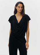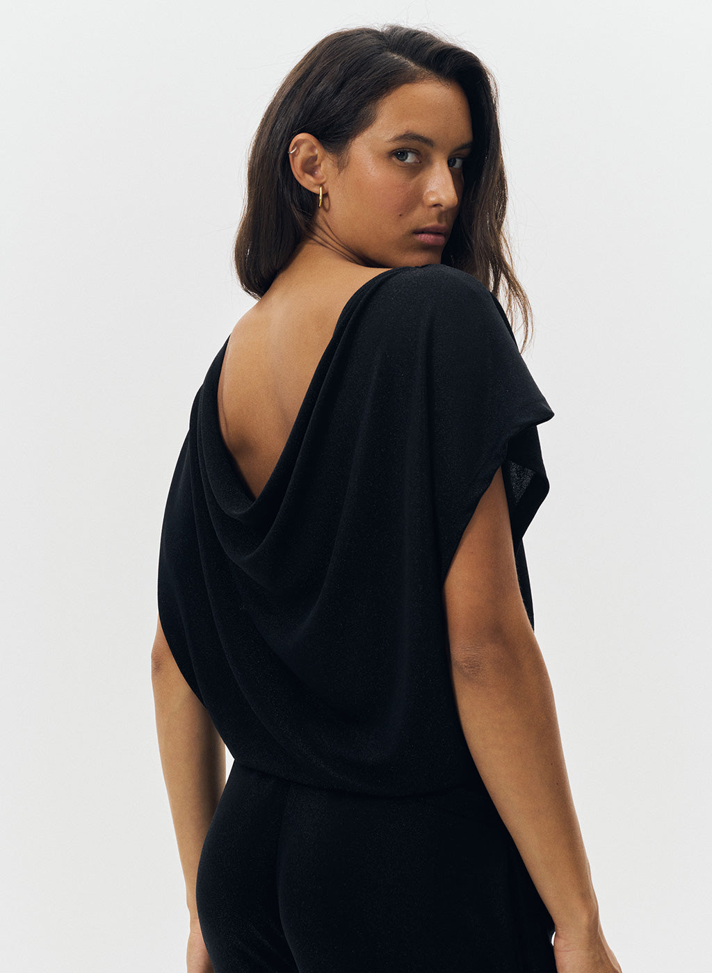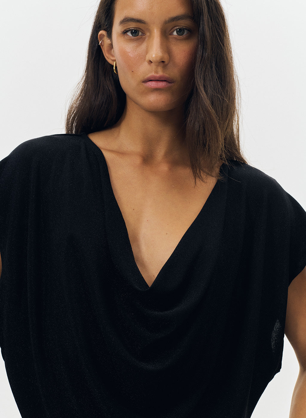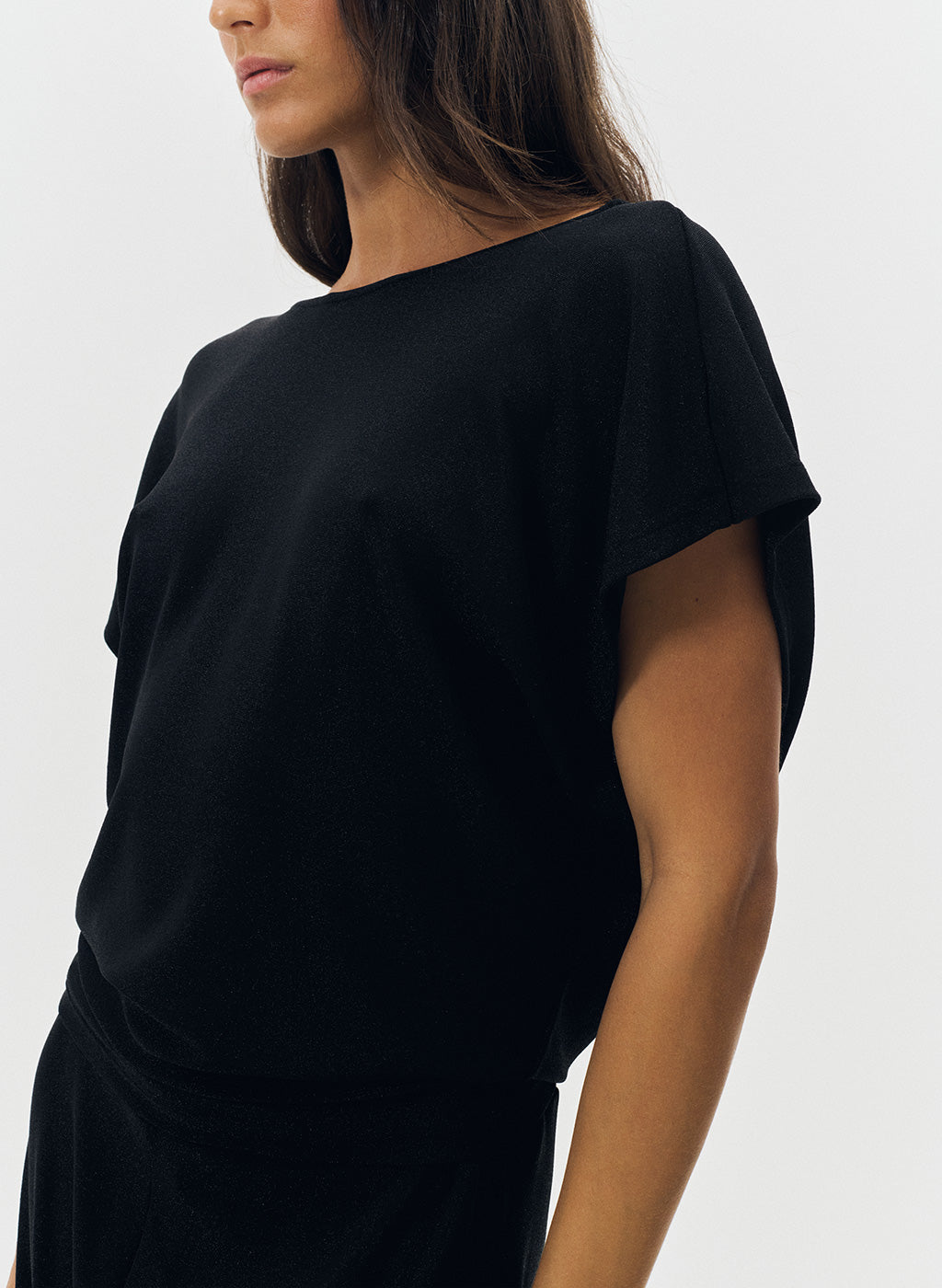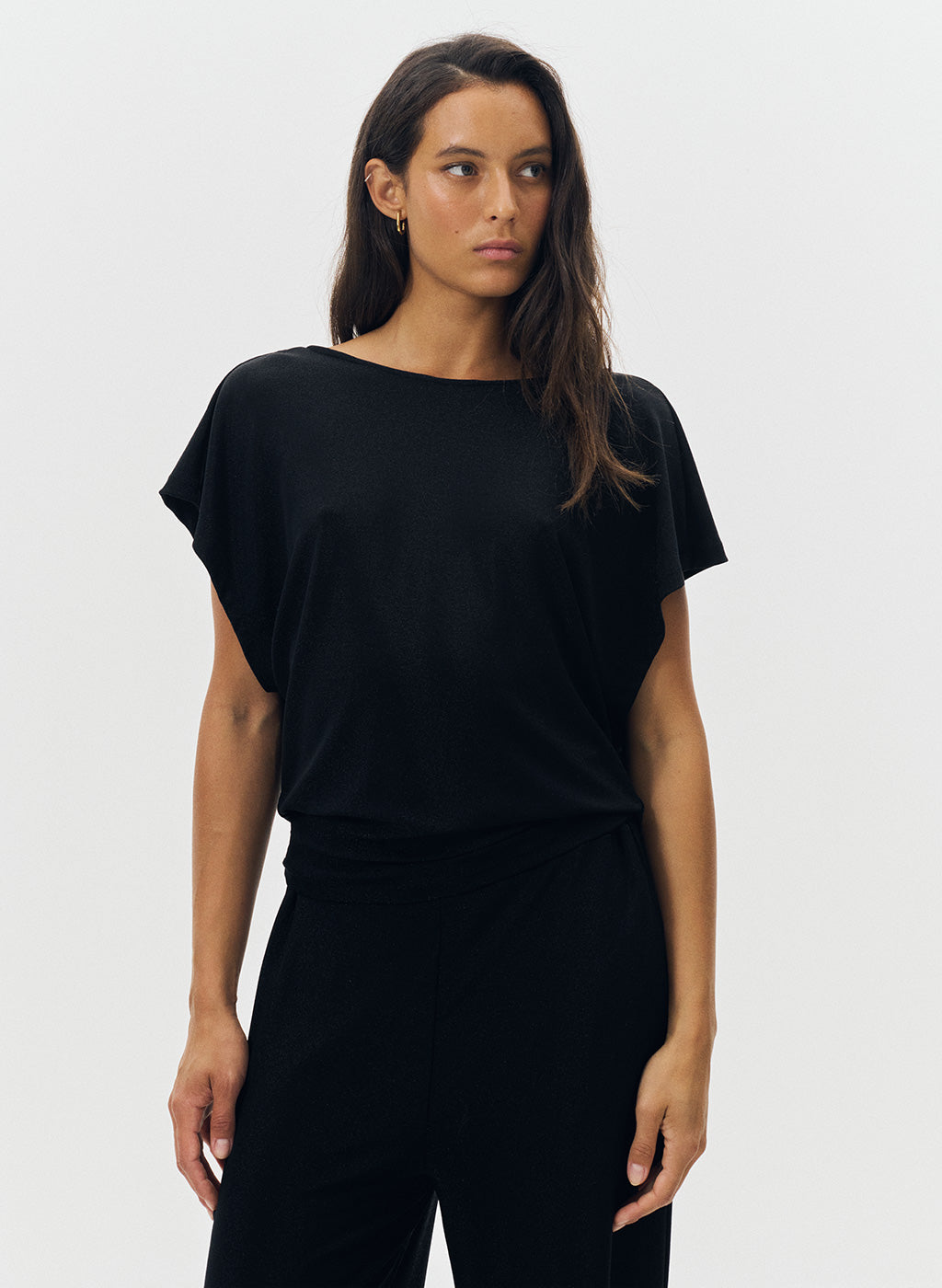 Le top Noga en lurex noir apporte une touche de brillance subtile et sophistiquée. Son col rond à l’avant et à l’arrière et ses manches courtes offrent élégance et légèreté, tandis que la coupe fluide et droite assure un tombé naturel et confortable. Polyvalent, il se porte de manière classique ou inversée pour varier les styles.