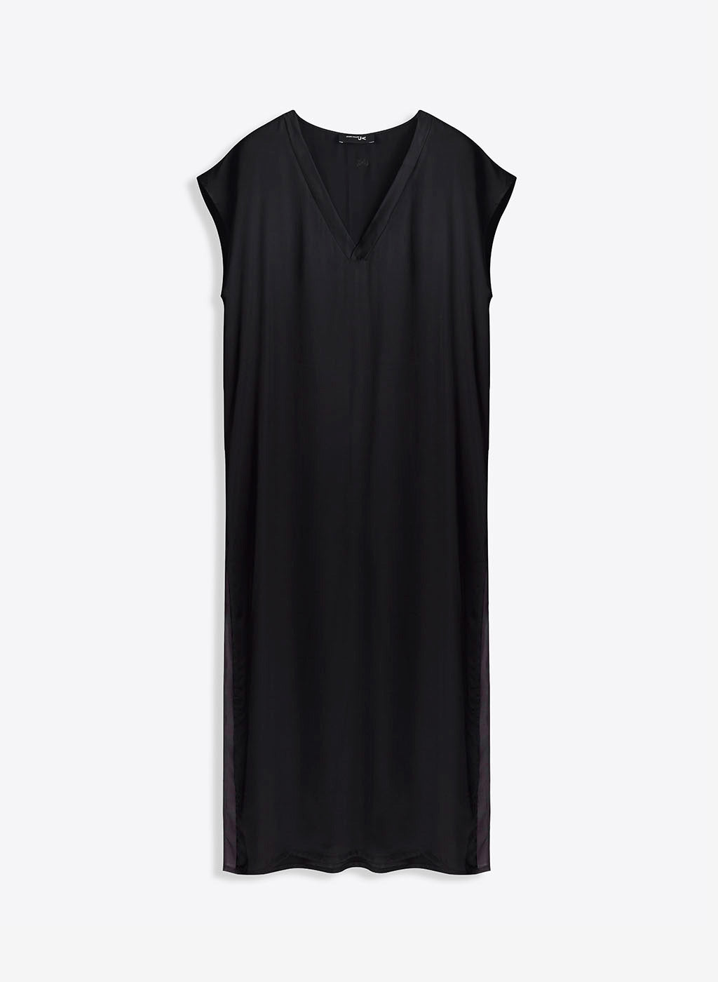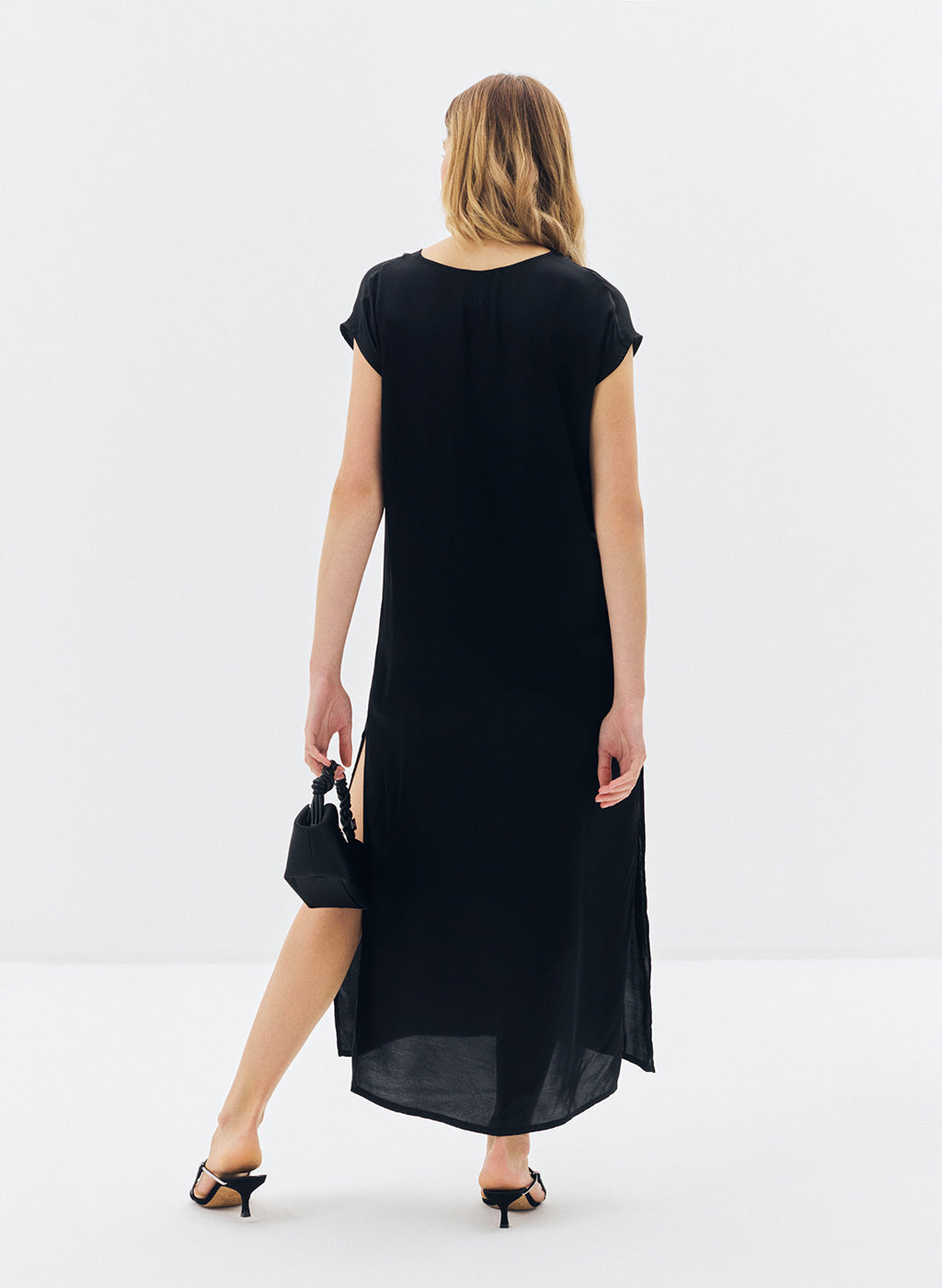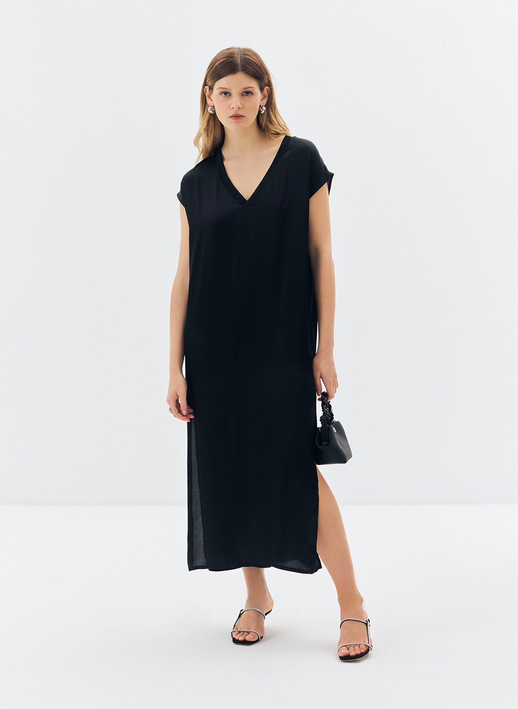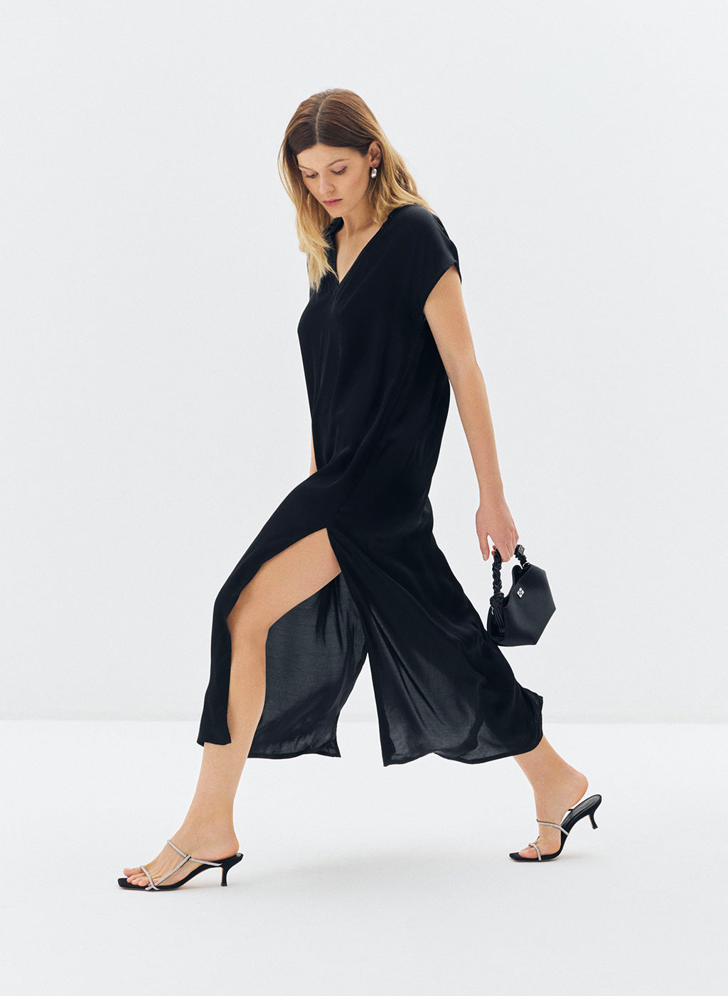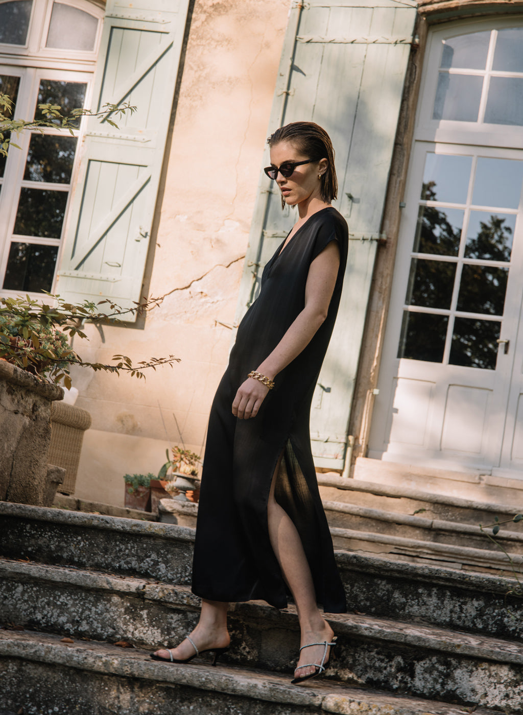 La robe Jadya style kaftan en satin noir est l'essence même du chic décontracté. Sans manches et dotée d'un col V, elle évoque une silhouette légère et fluide, parfaite pour les journées ensoleillées. Sa coupe ample et droite garantit un confort optimal et une liberté de mouvement, tandis que ses fentes latérales à la base apportent une touche moderne et raffinée. Idéale pour une escapade estivale ou une journée en bord de mer, cette robe allie simplicité et sophistication pour un look naturellement élégant.