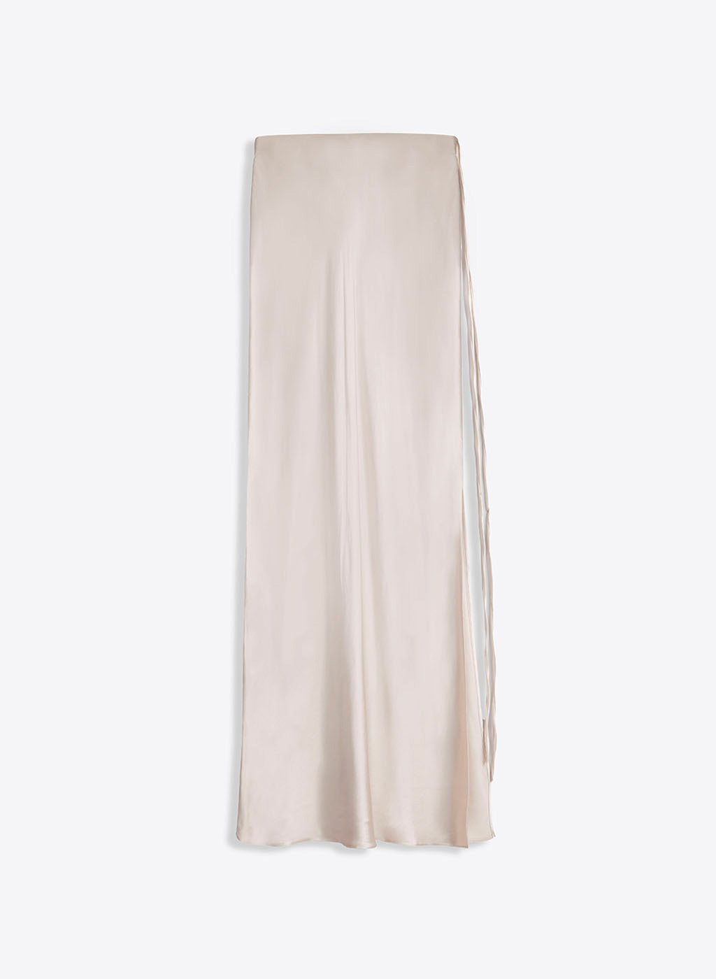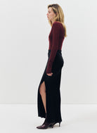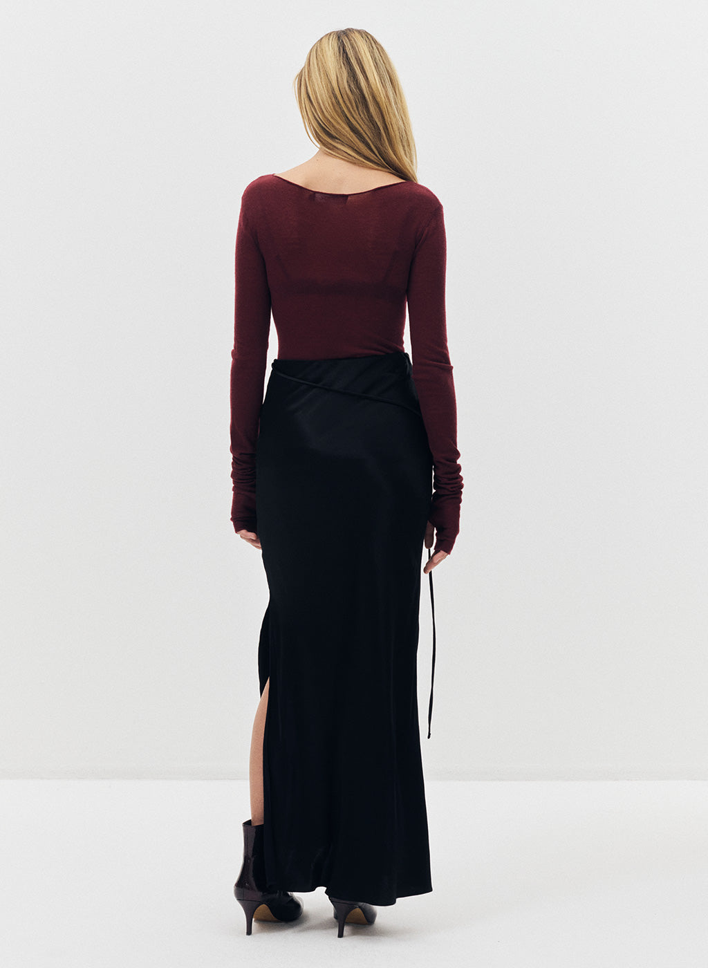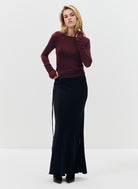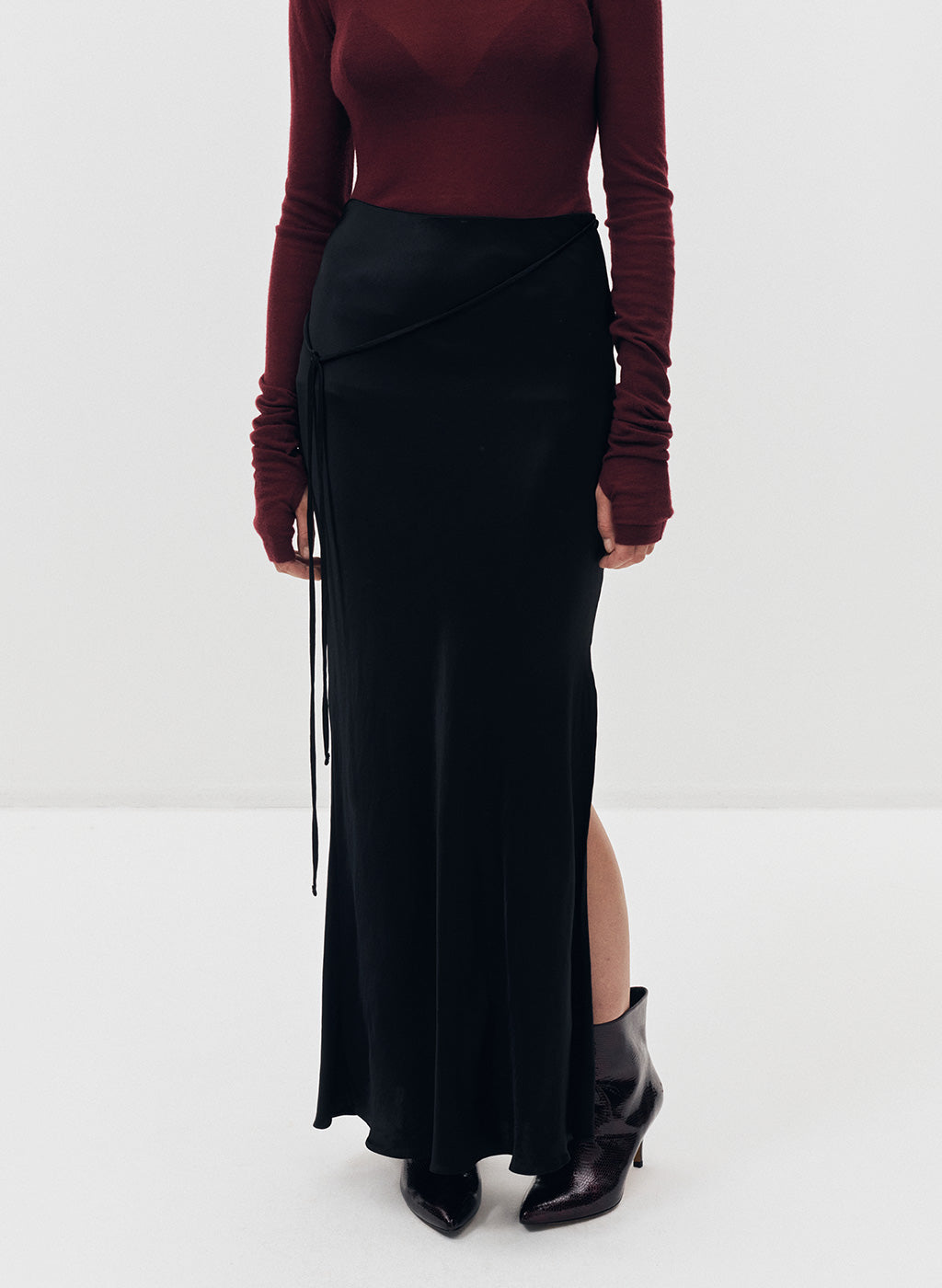 La jupe longue Kory en satin noir conjugue élégance et féminité. Sa taille soulignée par un lien à nouer et sa fente latérale dessinent une silhouette fluide et moderne. Facile à associer, elle se porte aussi bien en total look chic avec une chemise satinée qu’avec un tee-shirt pour un style décontracté.
