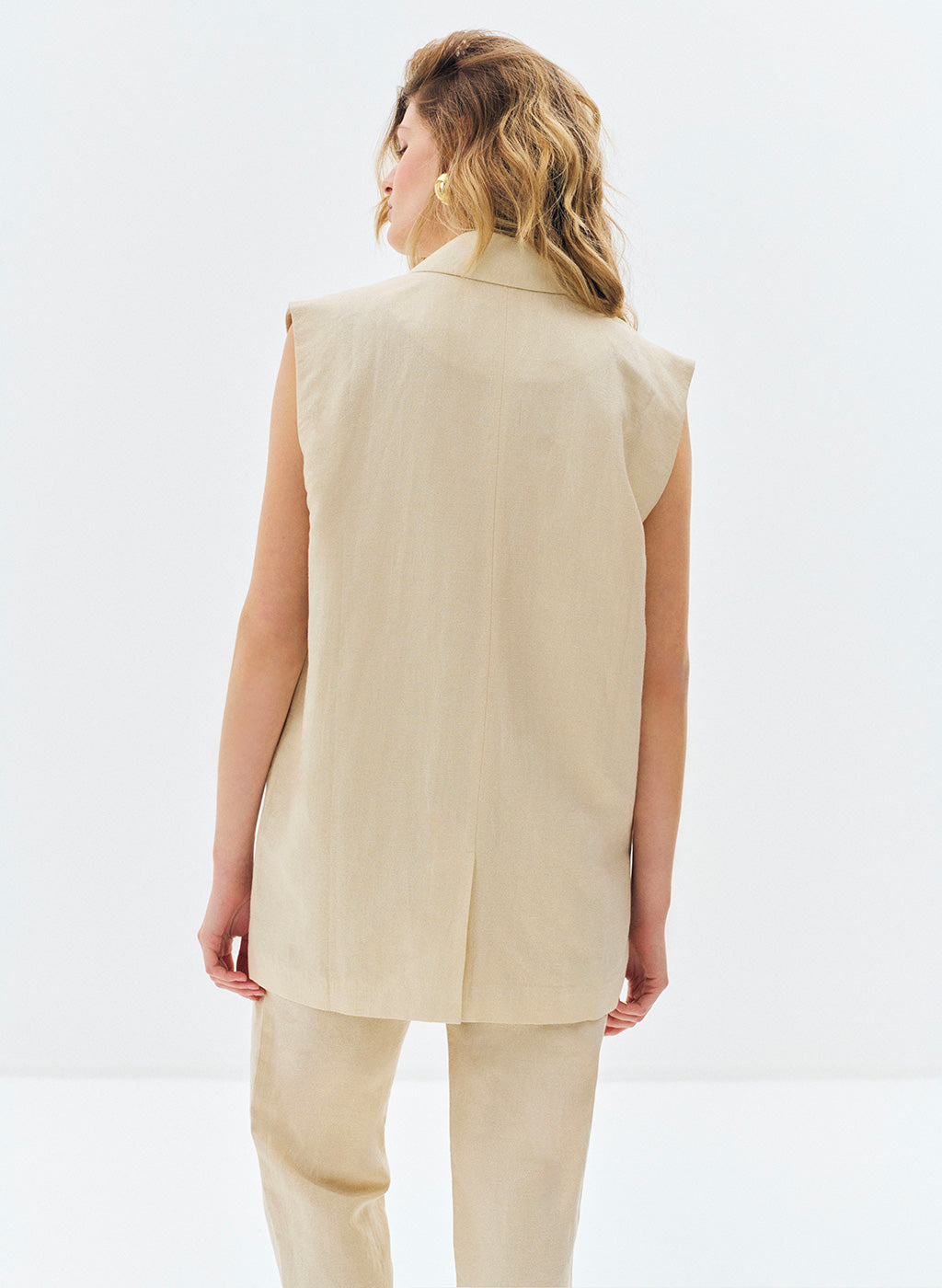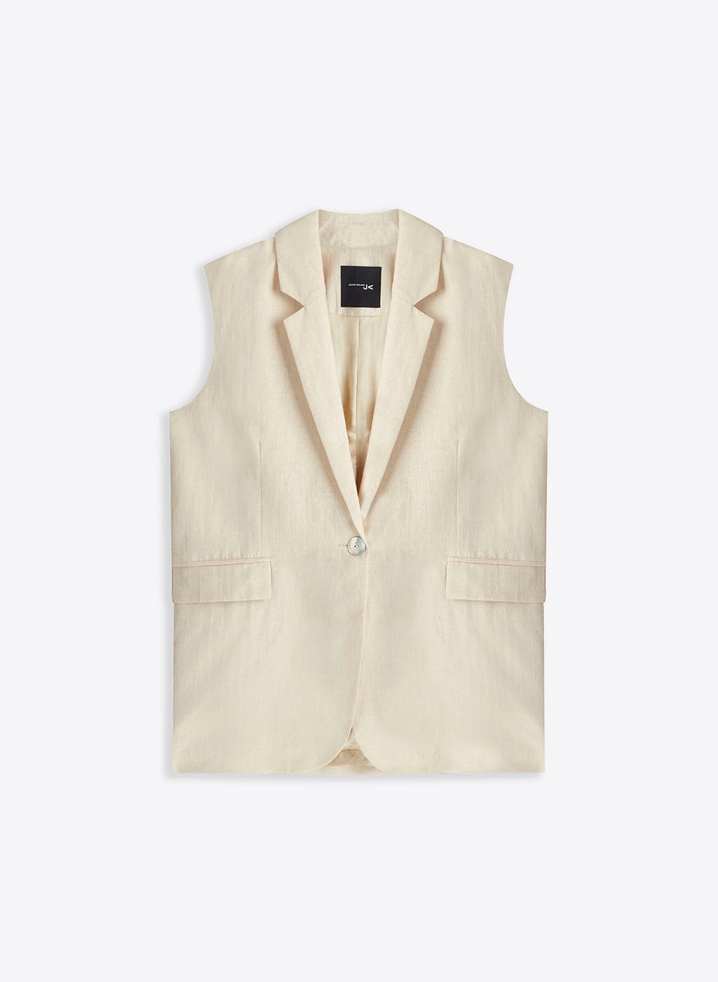 Le blazer sans manches Kos en lin lurex beige pailleté illumine la tenue avec subtilité et élégance. Sa coupe droite et légèrement oversize structure la silhouette, tandis que le col à revers et la fermeture croisée à bouton unique nacré apportent sophistication et modernité. Les poches passepoilées à rabats et la poche poitrine allient praticité et style. Léger et fluide, il se porte en superposition sur une blouse ou avec le pantalon Hana pour un total look raffiné.