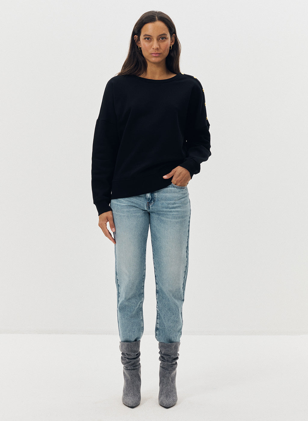 Nées de la collaboration entre Jeanne Vouland et Véronika Loubry, les bottines Badi 70 se distinguent par leur silhouette affûtée et leur denim gris unique. Les bouts pointus allongent la ligne du pied, tandis que le logo "JV" brodé à l’arrière apporte une signature subtile et sophistiquée. Véritables pièces fortes, elles insufflent caractère et modernité à toutes vos tenues.