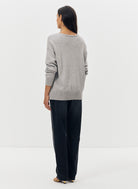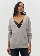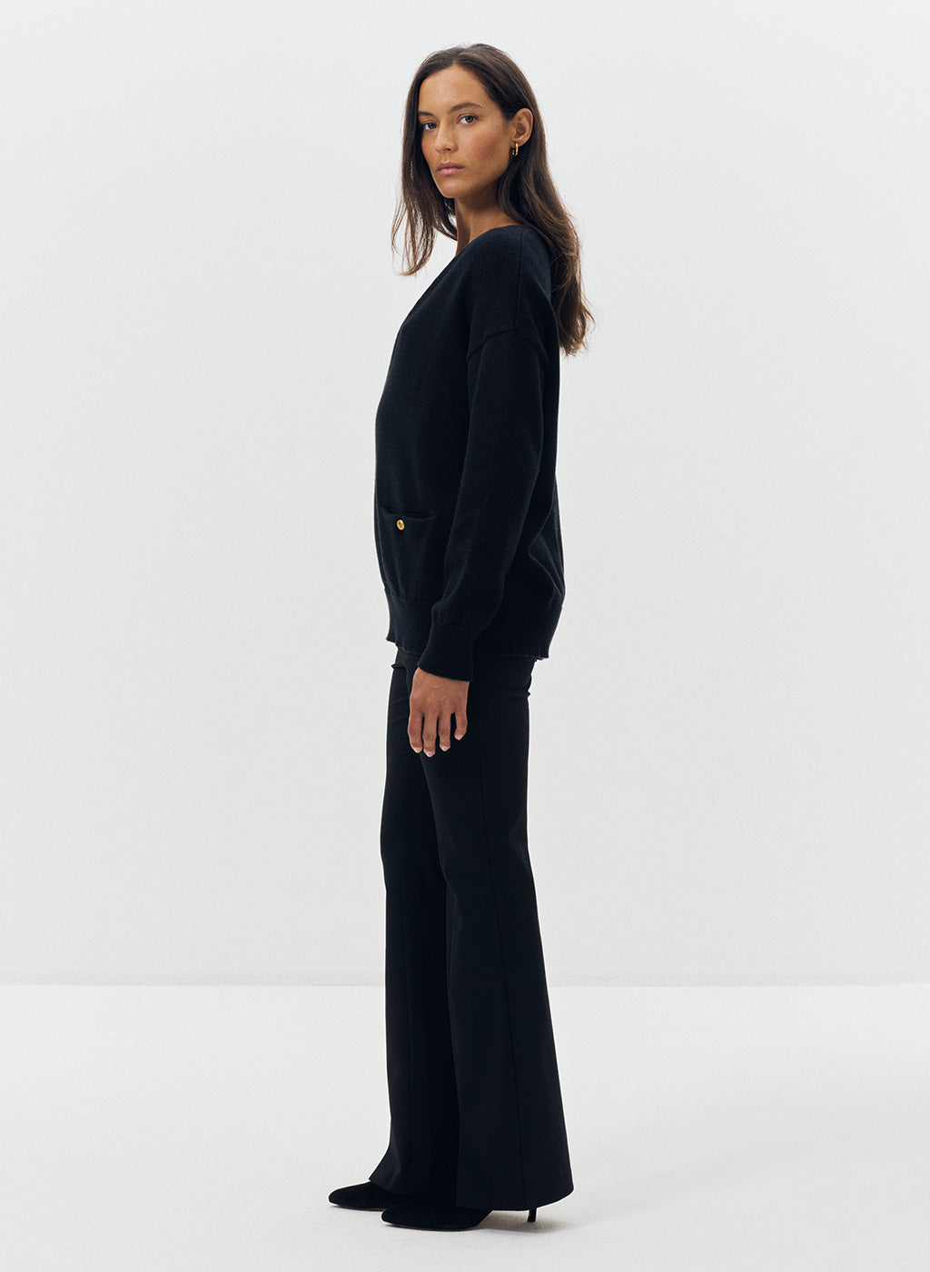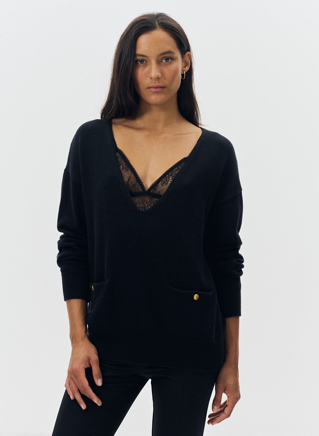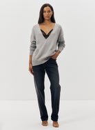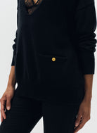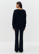 Le pull oversize Nacy noir se distingue par son col V plongeant et sa maille douce, offrant un équilibre parfait entre confort et élégance. Sa coupe ample et droite, associée à des emmanchures basses, dessine une silhouette fluide et décontractée. Les poignets côtelés et les deux poches plaquées ornées de boutons dorés gravés "JV" apportent une finition raffinée, signature discrète de la maison Jeanne Vouland.