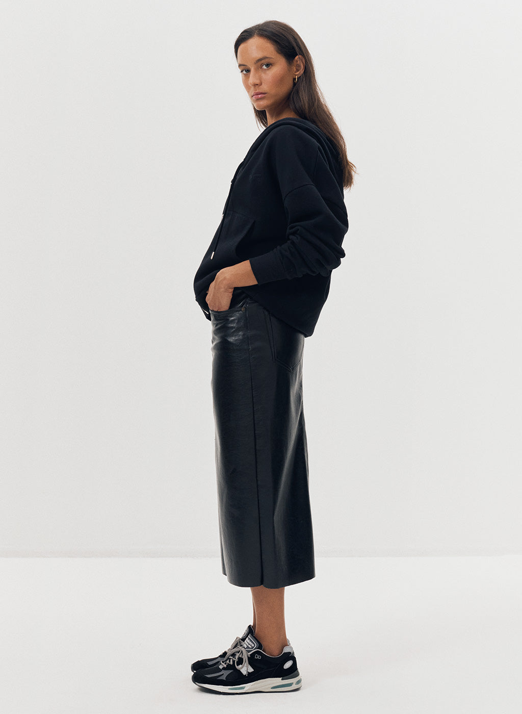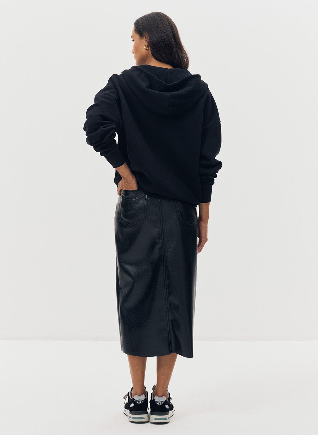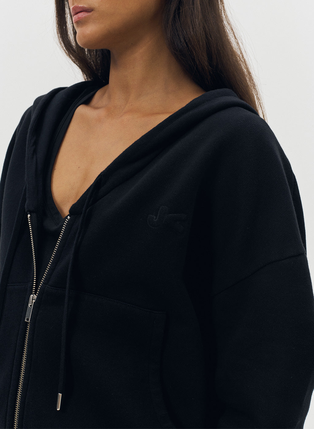 Confectionné en molleton noir doux, le sweat zippé Olaf se démarque par sa coupe oversize qui offre une liberté de mouvement optimale. Son zip argenté contrastant et sa large capuche à cordons terminés par des embouts métalliques argentés lui confèrent un esprit moderne. Le col profond accentue son allure casual, tandis que le logo "JV" embossé sur la poitrine apporte une signature discrète. Sa base droite et sa construction non doublée assurent un porté léger et facile au quotidien.