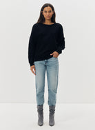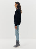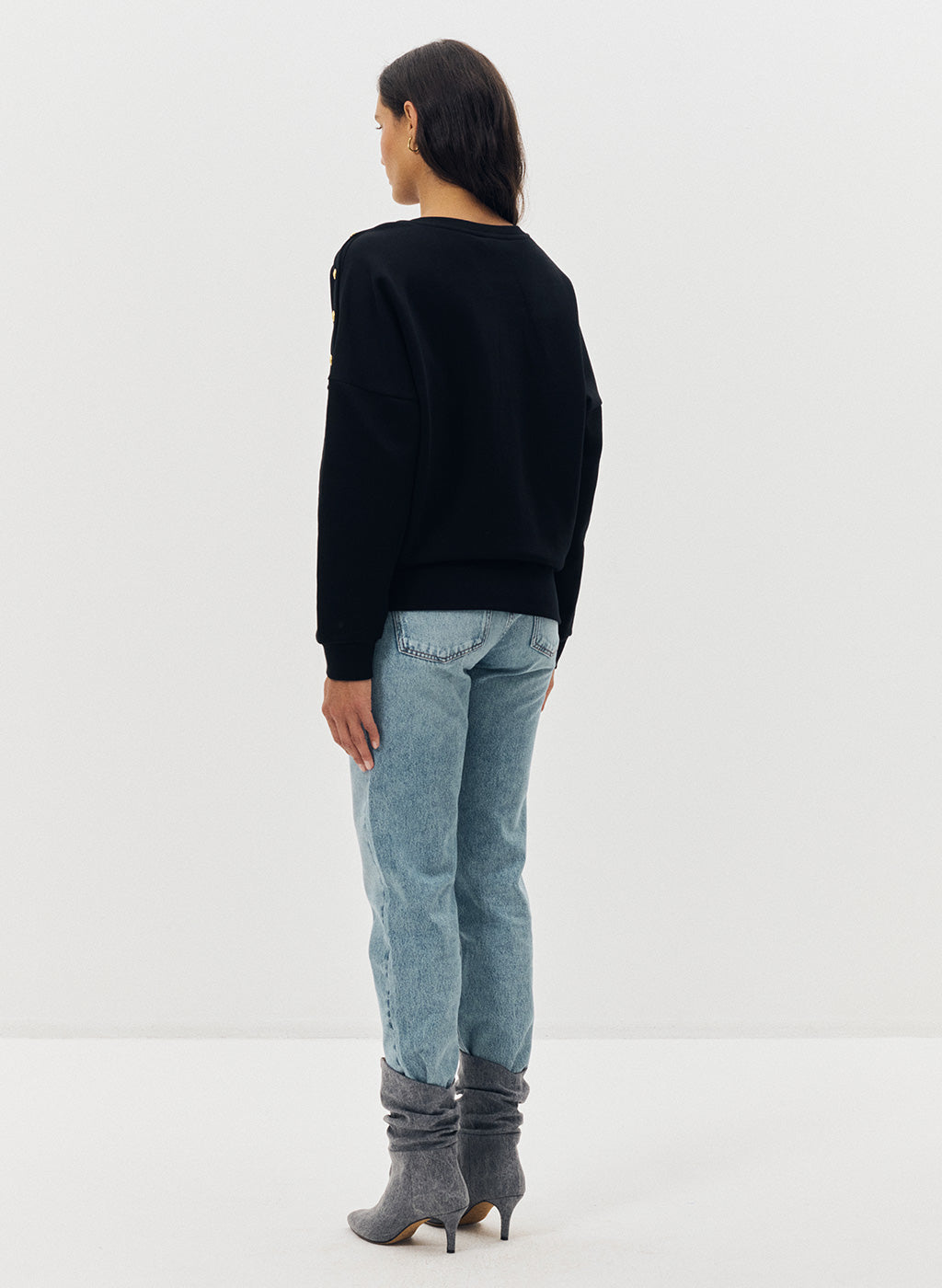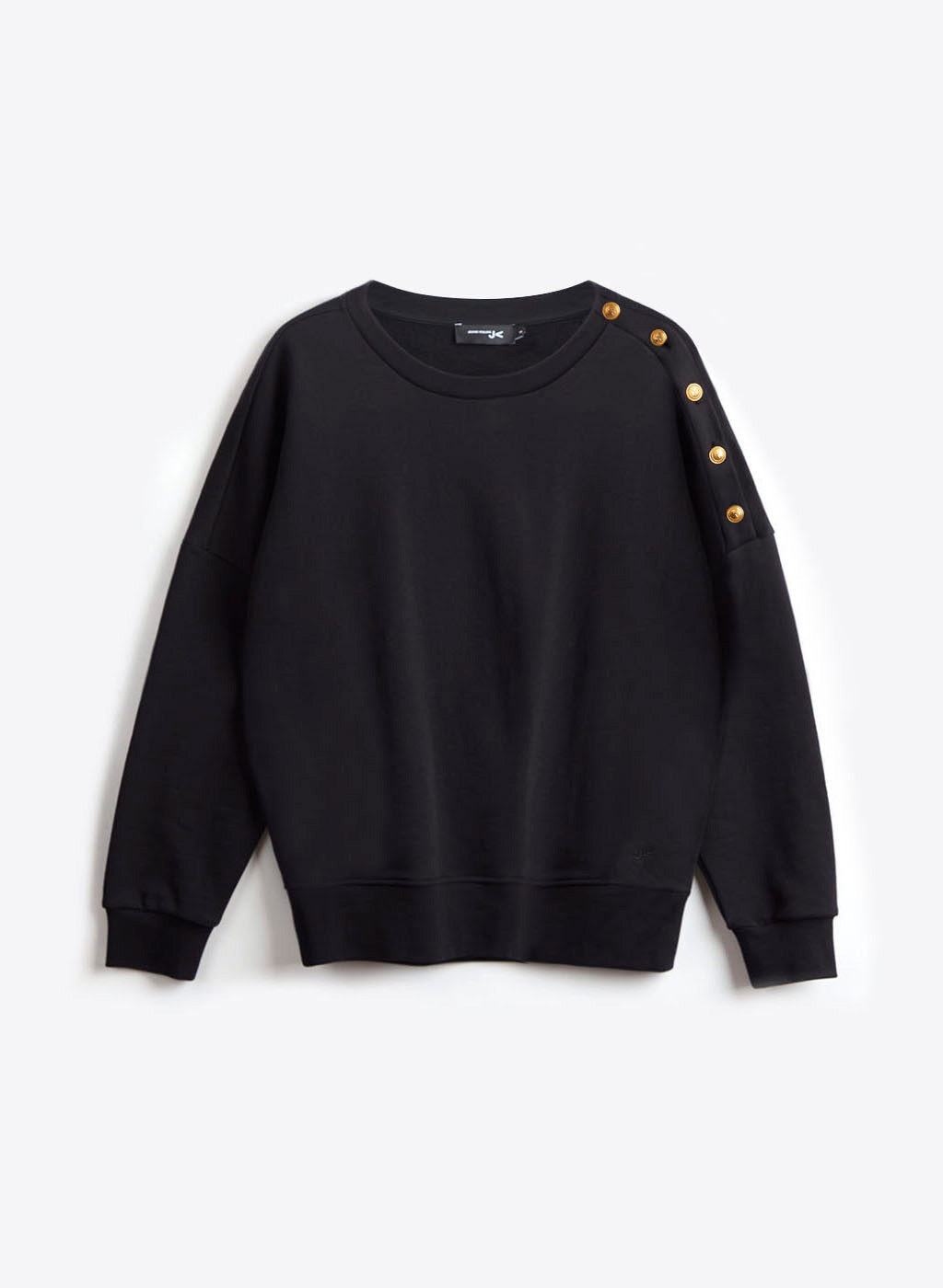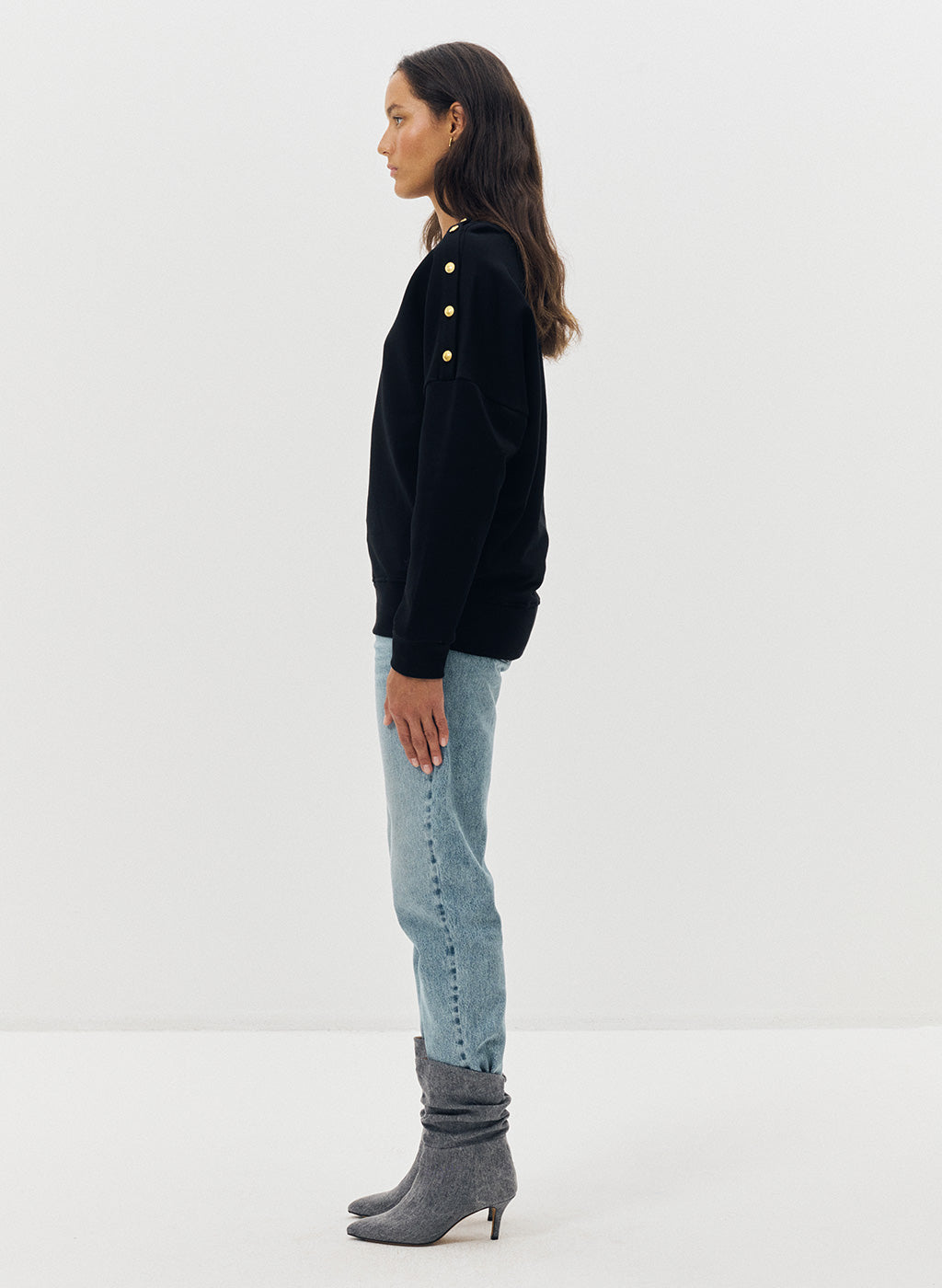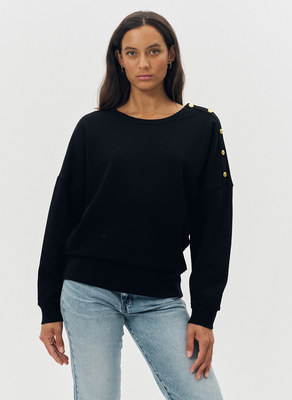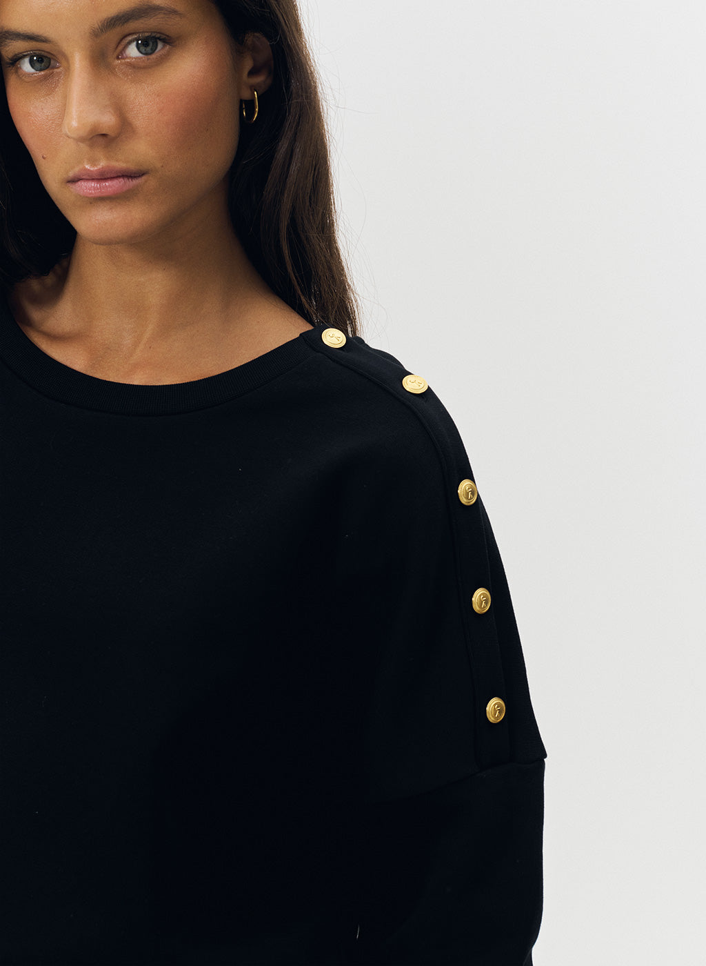 Le sweatshirt Noa en coton noir adopte une coupe ample et décontractée. Ses manches longues et son col rond en font un essentiel du vestiaire, relevé par des boutons dorés gravés "JV" sur l’épaule pour une touche chic et distinctive.
