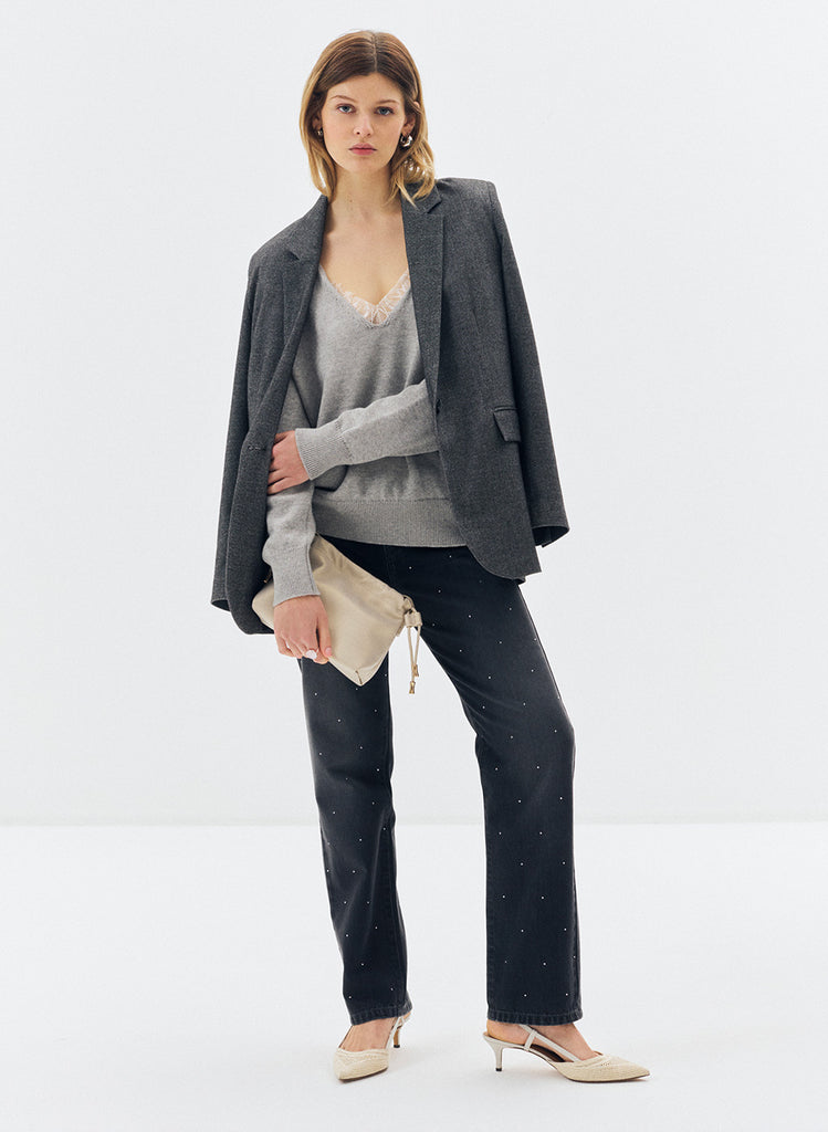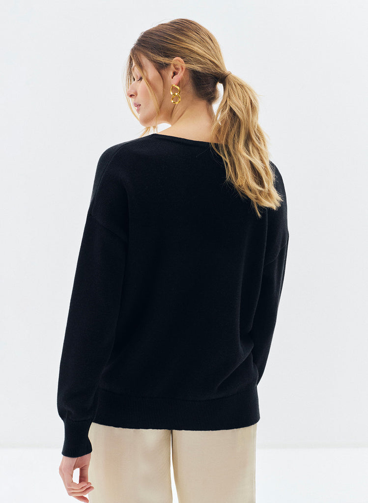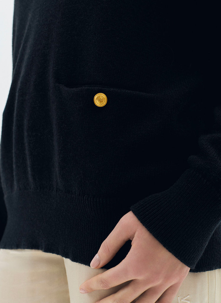 Le pull oversize Nacy noir se distingue par son col V plongeant et sa maille douce, offrant un équilibre parfait entre confort et élégance. Sa coupe ample et droite, associée à des emmanchures basses, dessine une silhouette fluide et décontractée. Les poignets côtelés et les deux poches plaquées ornées de boutons dorés gravés "JV" apportent une finition raffinée, signature discrète de la maison Jeanne Vouland.