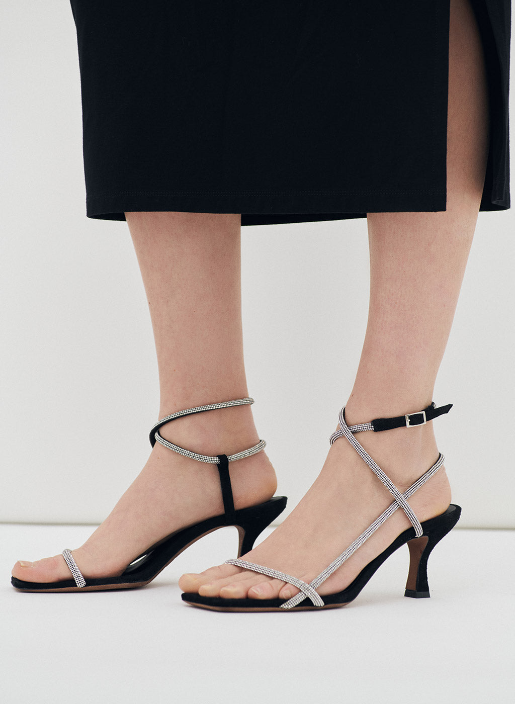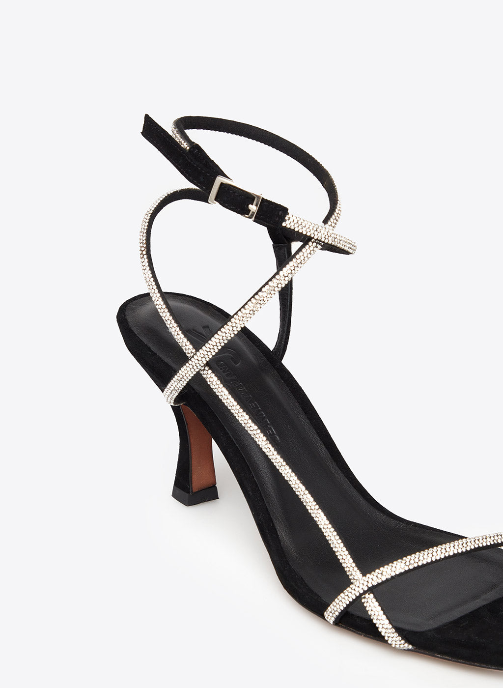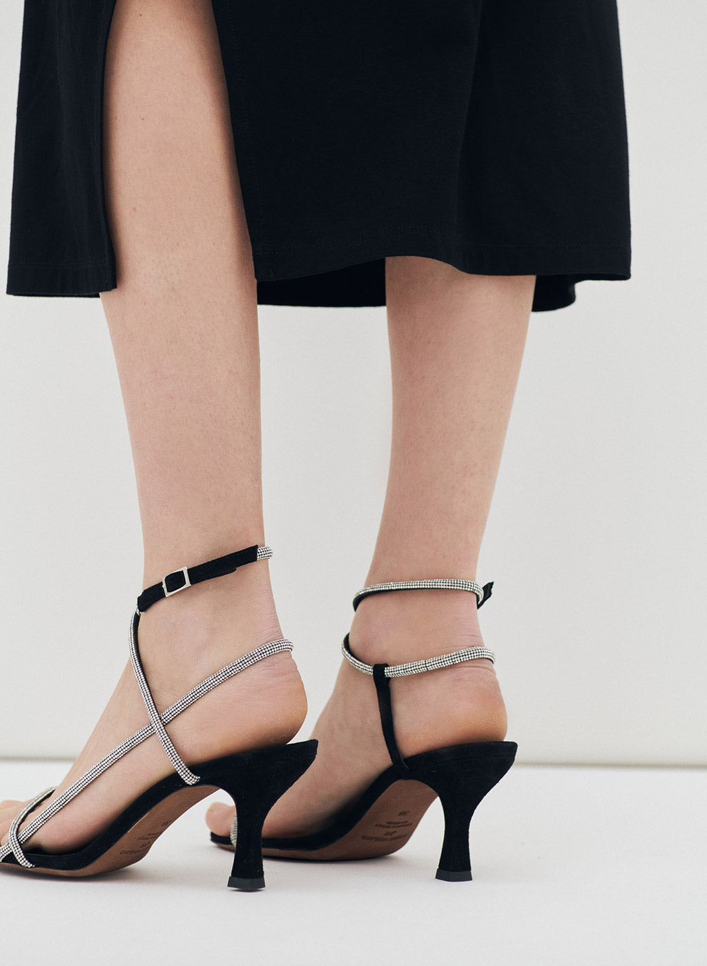 Les sandales Sublim à strass ajoutent une touche de glamour et de modernité à notre collection de chaussures. Leur design raffiné se compose de fines brides en cuir suédé noir, sublimées par des strass qui captent la lumière avec subtilité, apportant éclat et élégance à vos tenues. Le talon bobine de 7 cm, recouvert de cuir, a été soigneusement conçu pour offrir à la fois un galbe élégant et un confort optimal tout au long de la journée ou de la soirée. La fermeture se fait facilement grâce à une boucle argentée ajustable au niveau de la cheville, offrant un maintien parfait. Les semelles intérieures et extérieures en cuir garantissent une finition haut de gamme et un confort supplémentaire.