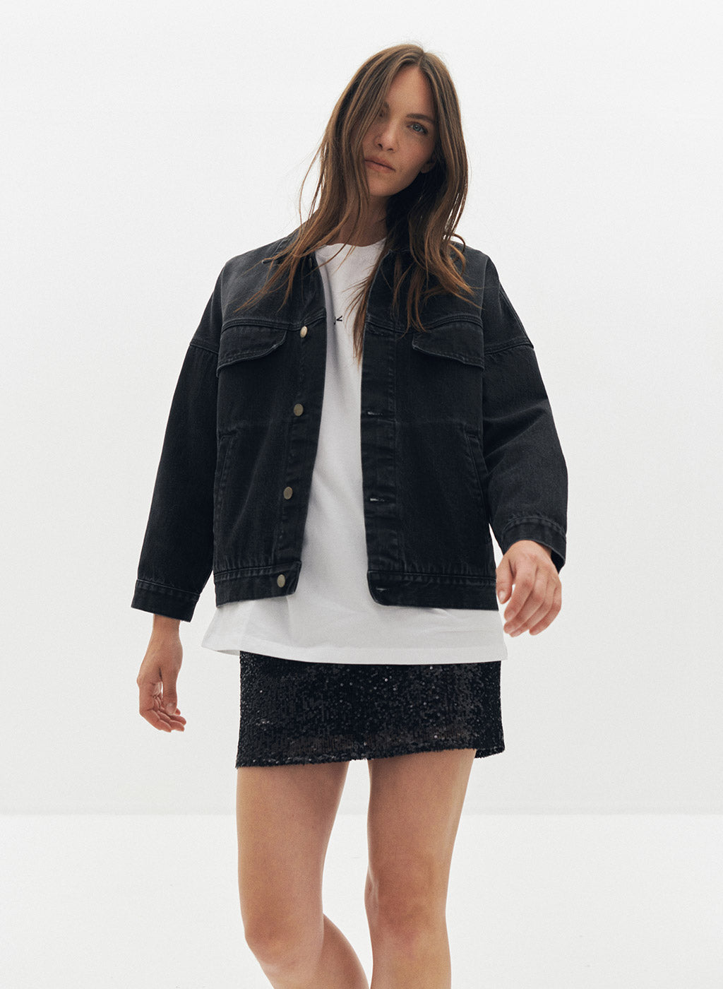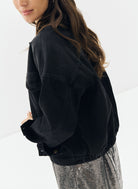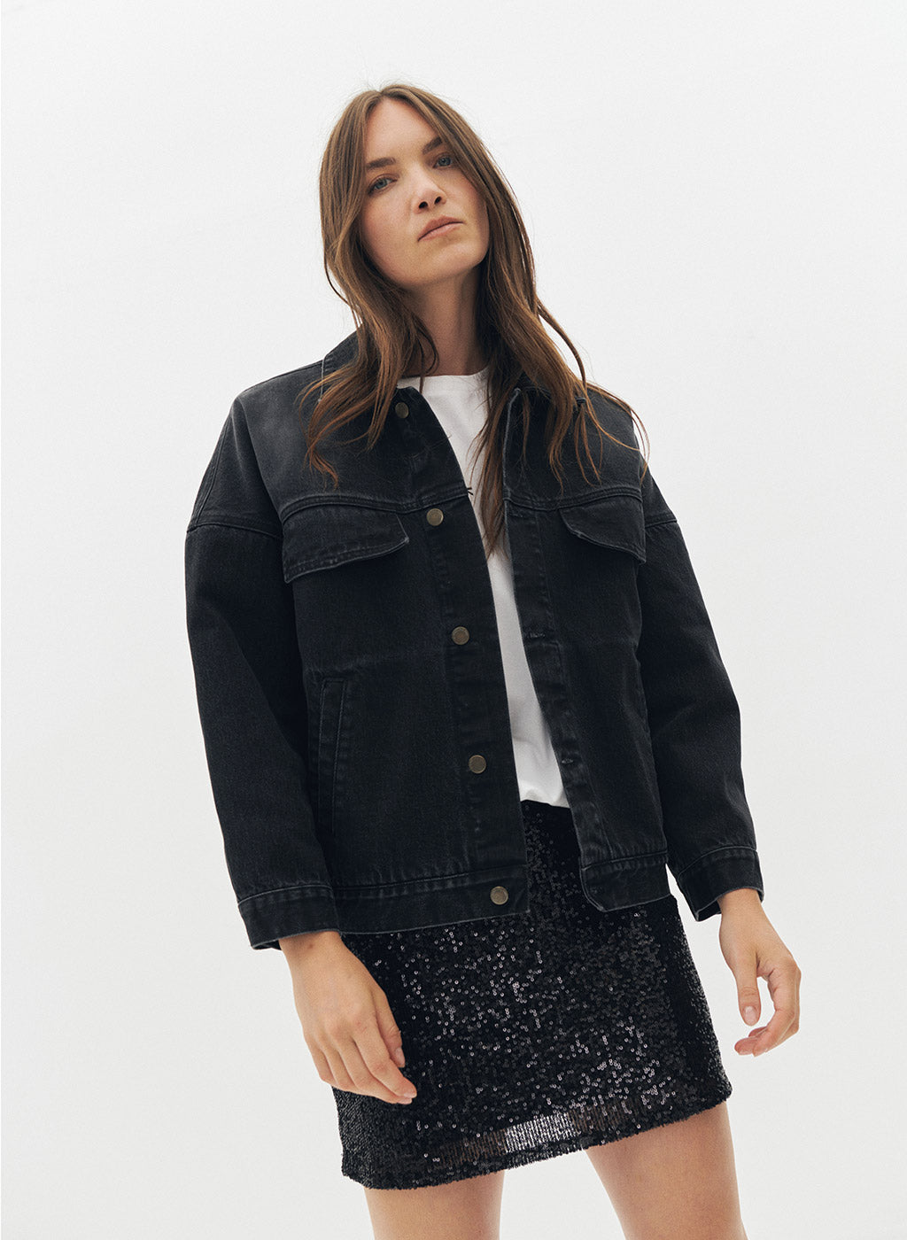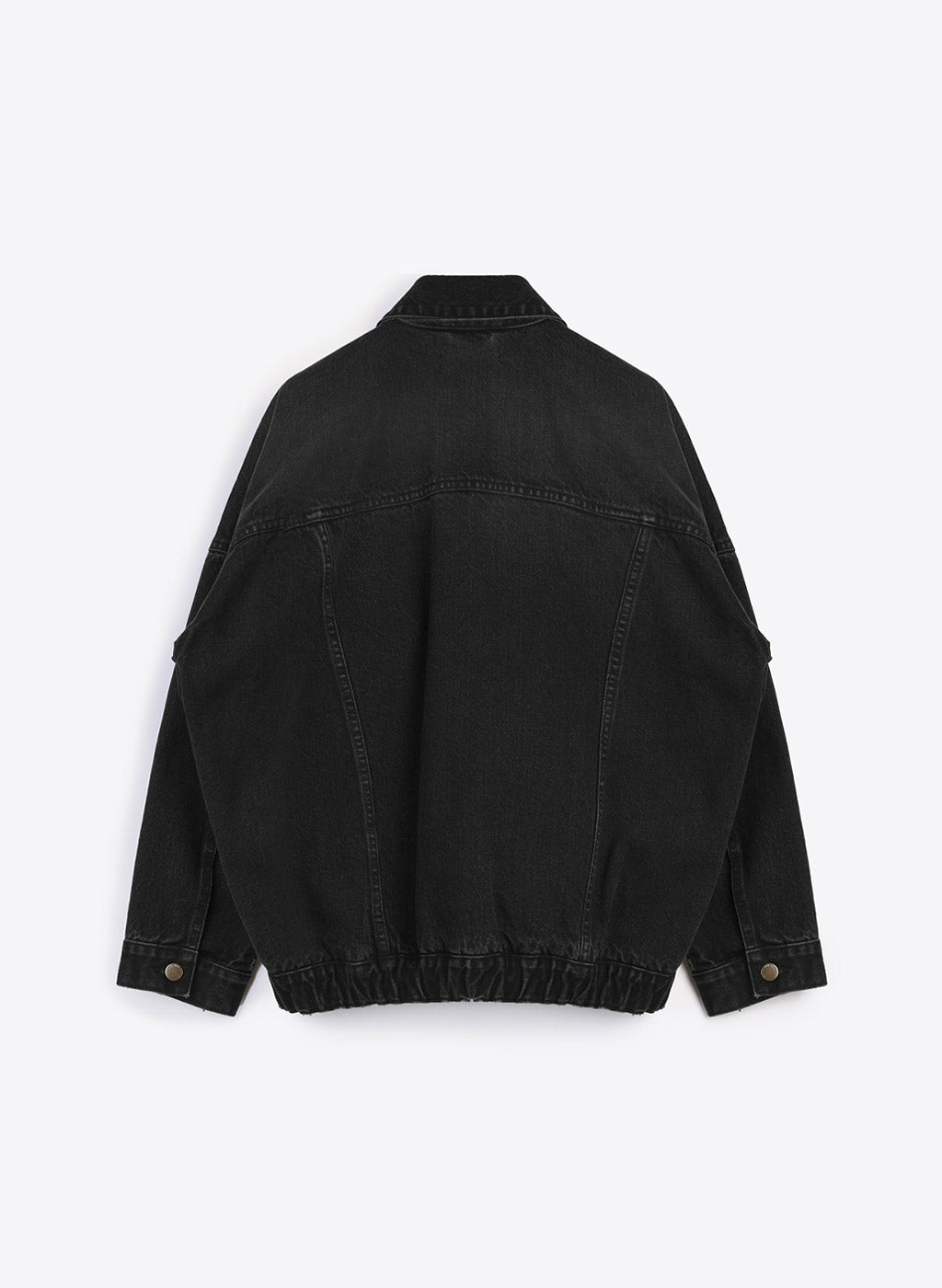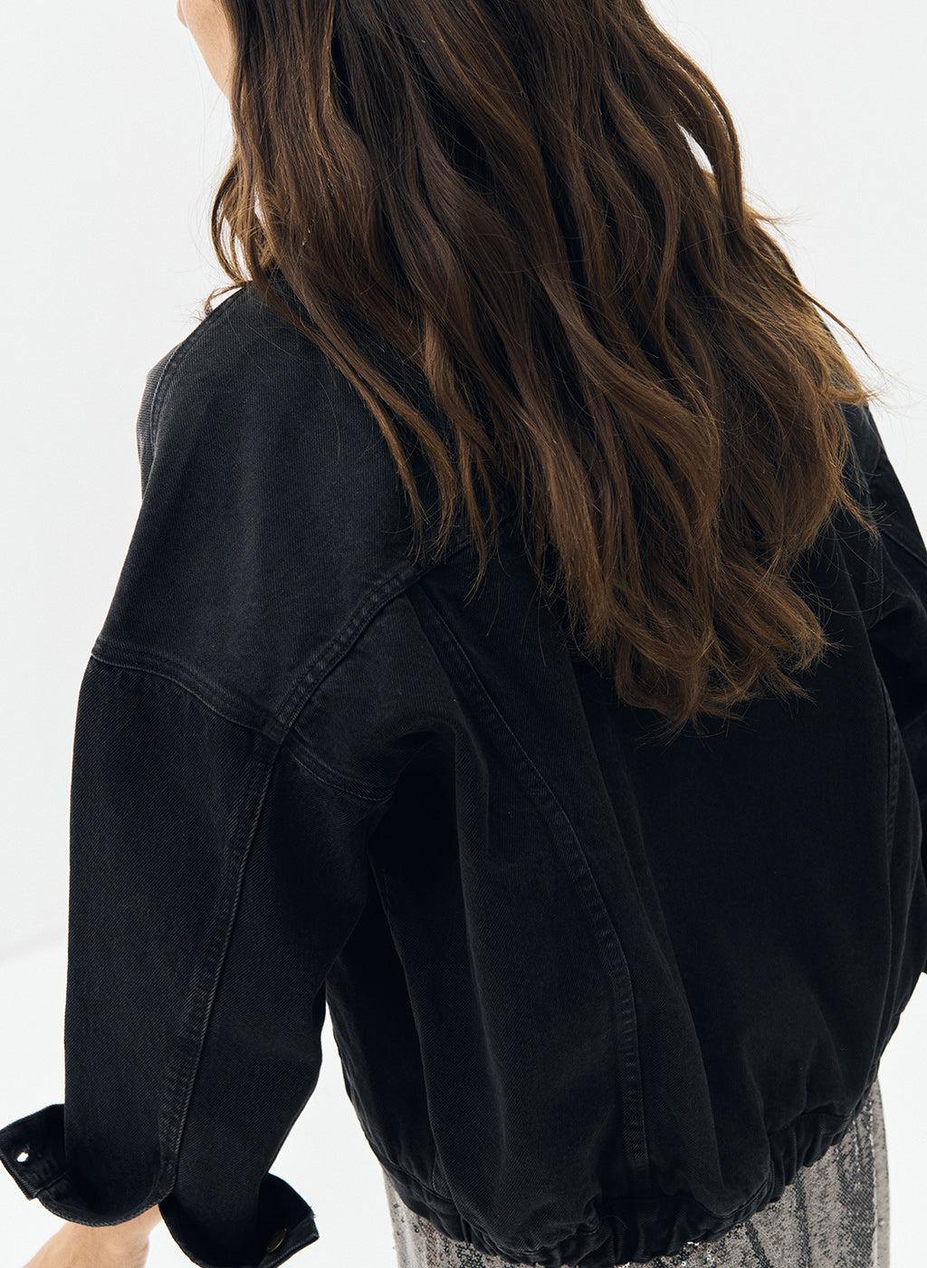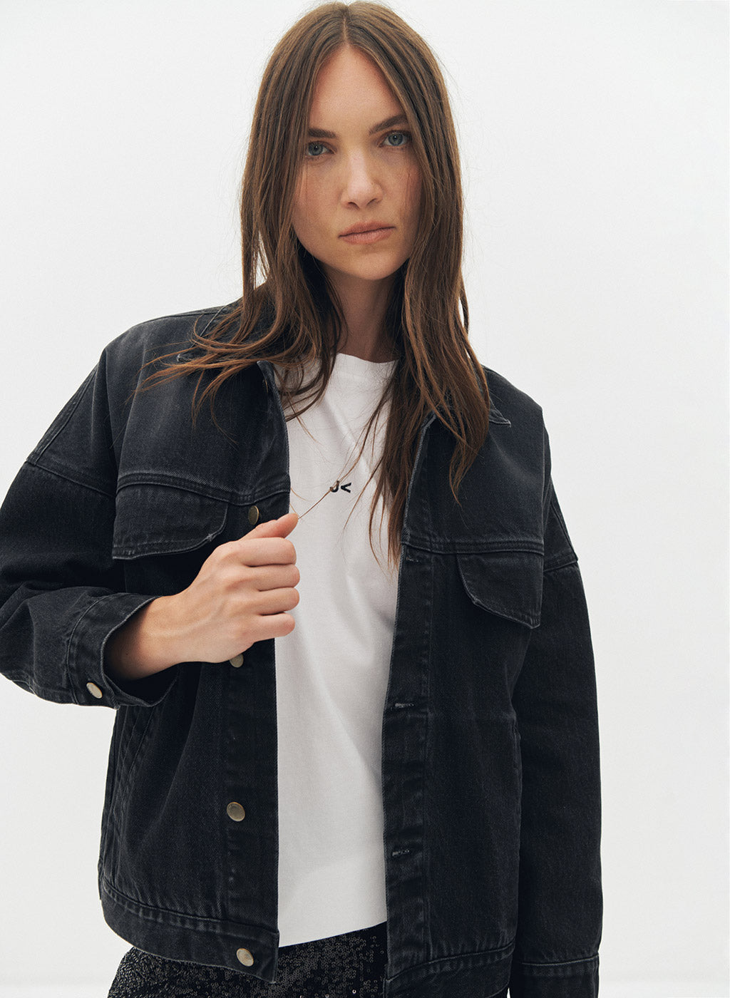 Le blouson Dana sera votre allié pour la demi-saison. Réalisé dans une toile de denim délavé noir, sa coupe ample aviateur et son style décontracté permettent de porter facilement ce bombers au dessus d'un pull ou même un sweat. Ce modèle dispose de quatre poches dont deux poches à rabats sur la poitrine et l'emblématique broderie "JV" ton sur ton sur le rabat d'une des poches. Sa fermeture se fait par boutons en métal gravés "Jeanne Vouland". Sa forme "boule" resserrée sur le bas est élastiquée au dos pour renforcer le look aviateur. Blouson non doublé.