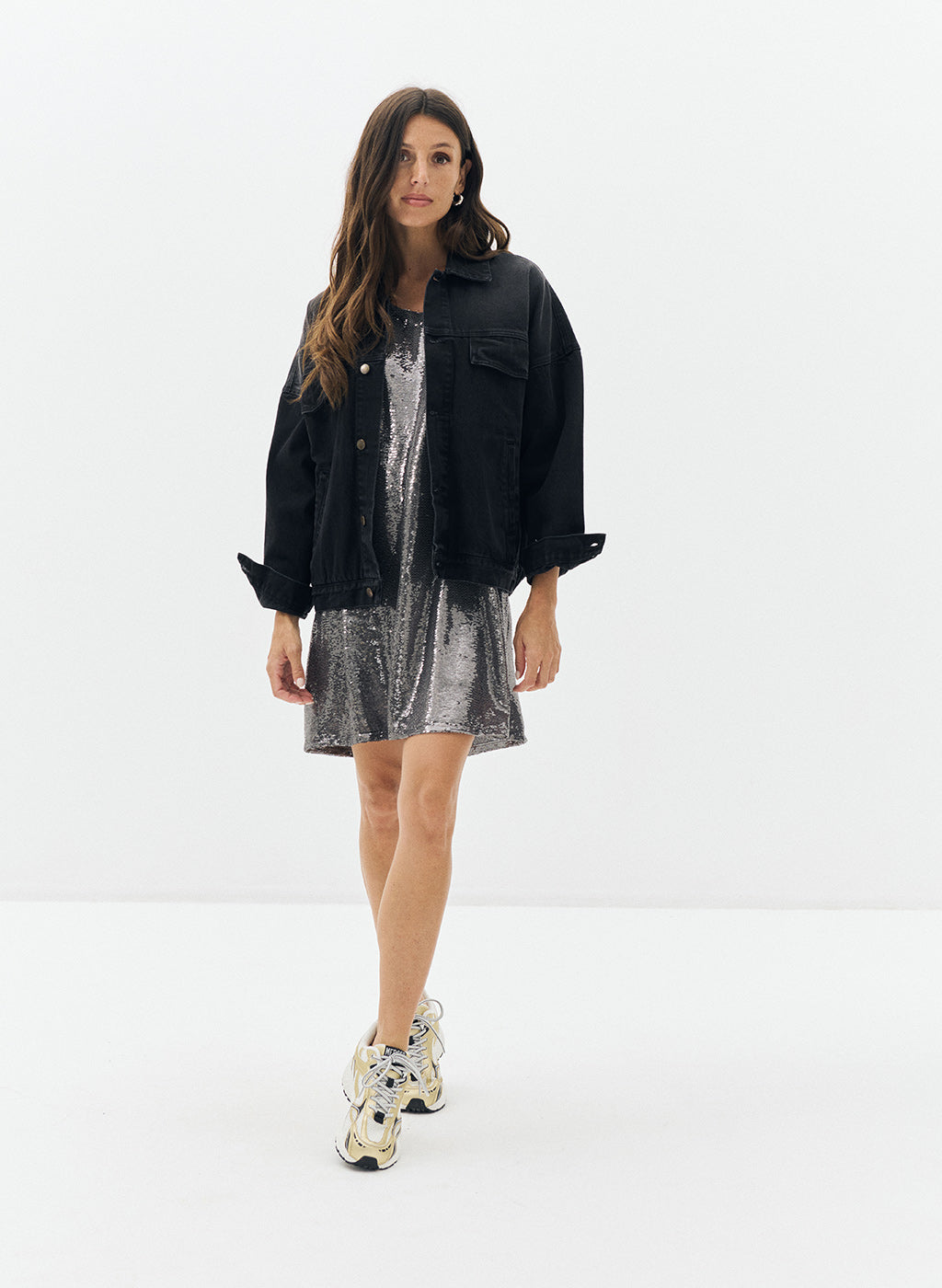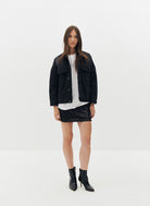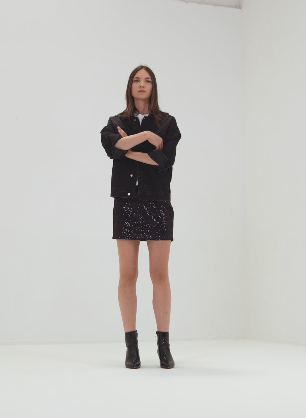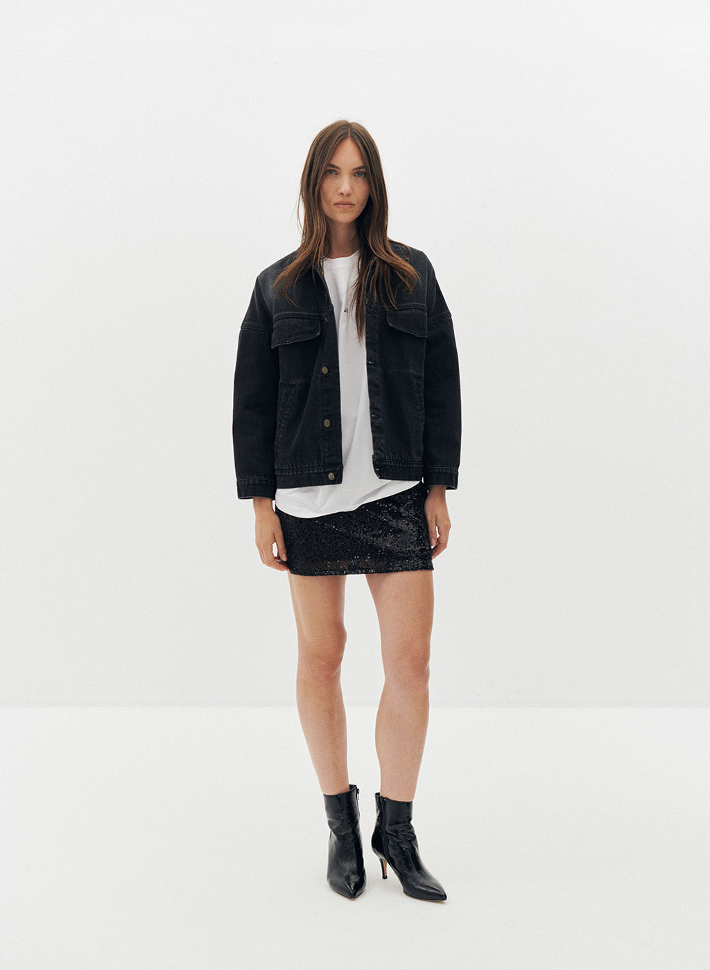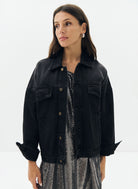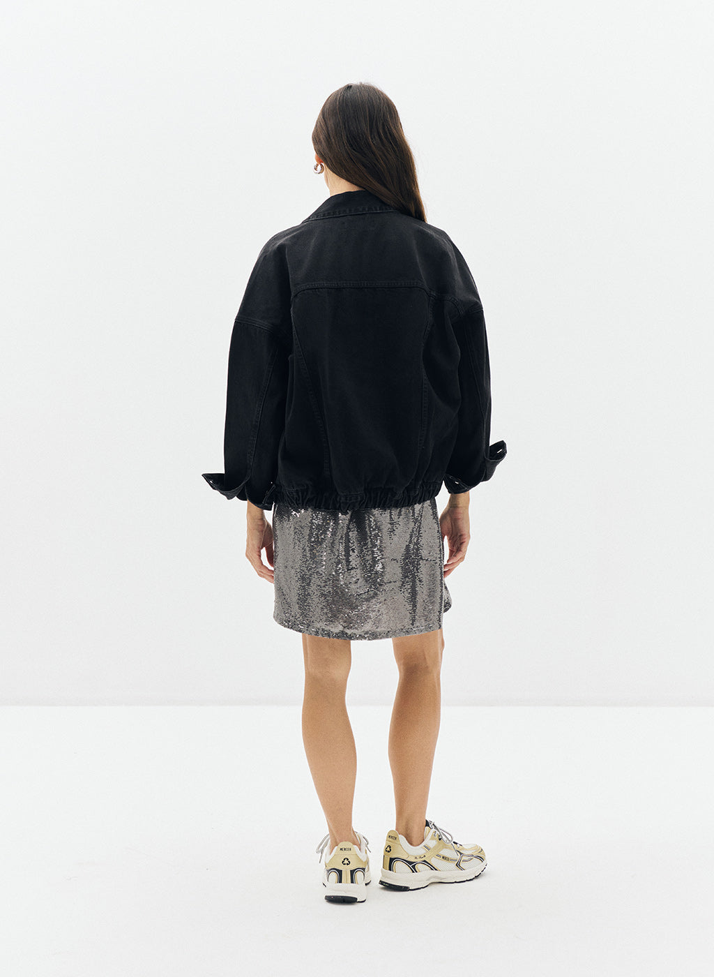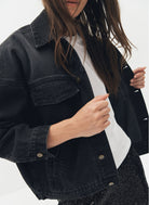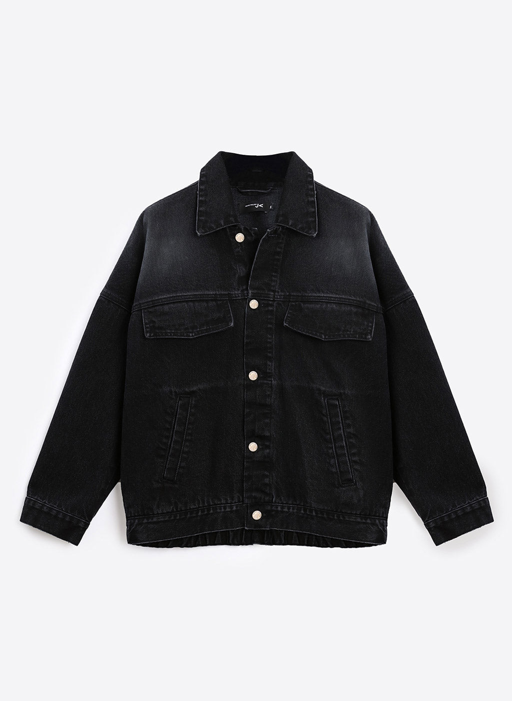 Le blouson Dana sera votre allié pour la demi-saison. Réalisé dans une toile de denim délavé noir, sa coupe ample aviateur et son style décontracté permettent de porter facilement ce bombers au dessus d'un pull ou même un sweat. Ce modèle dispose de quatre poches dont deux poches à rabats sur la poitrine et l'emblématique broderie "JV" ton sur ton sur le rabat d'une des poches. Sa fermeture se fait par boutons en métal gravés "Jeanne Vouland". Sa forme "boule" resserrée sur le bas est élastiquée au dos pour renforcer le look aviateur. Blouson non doublé.