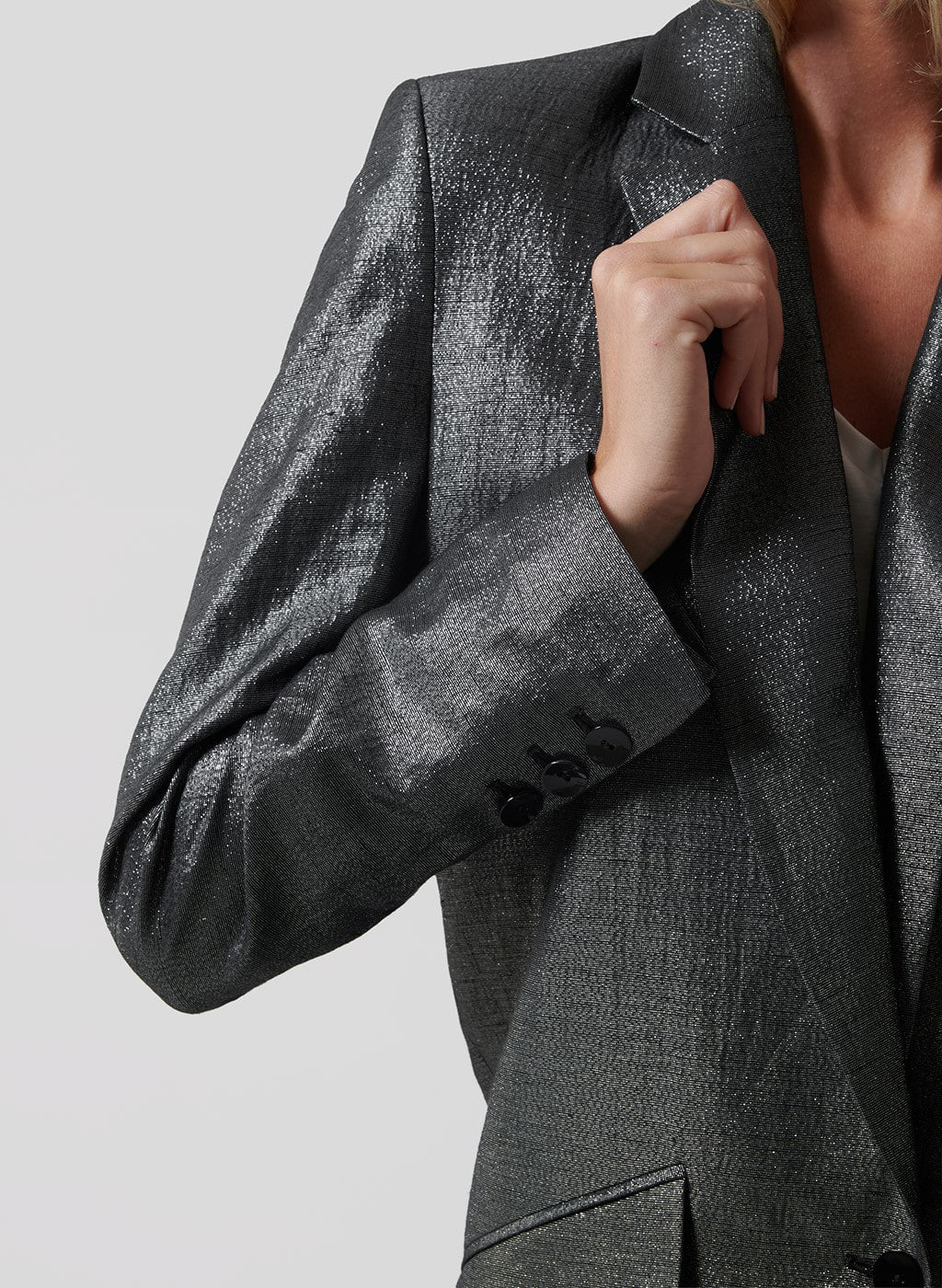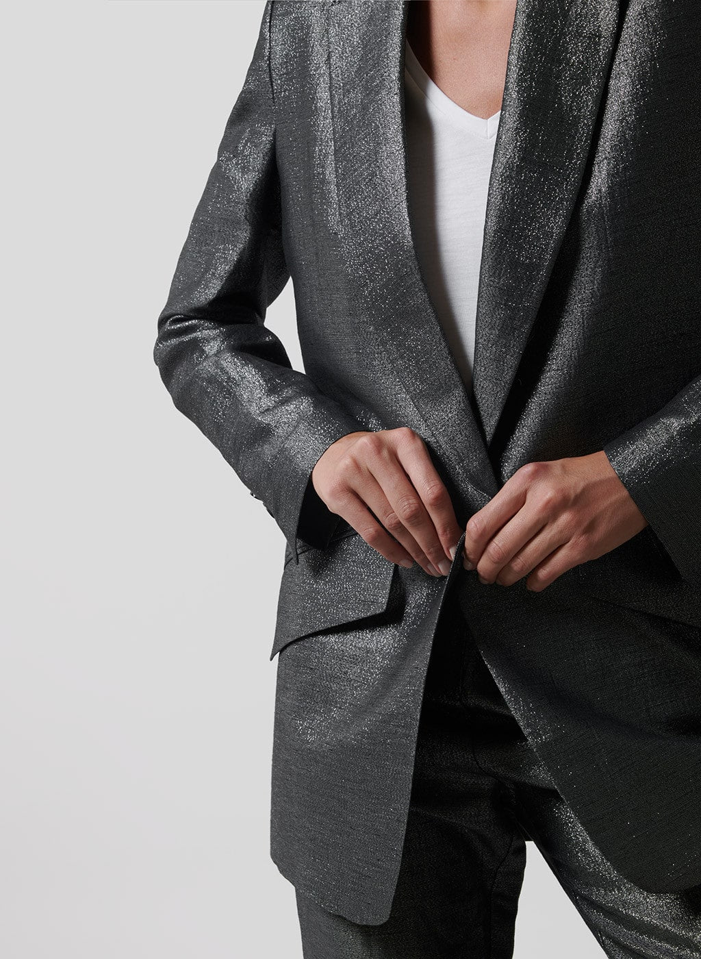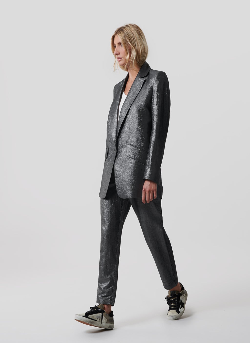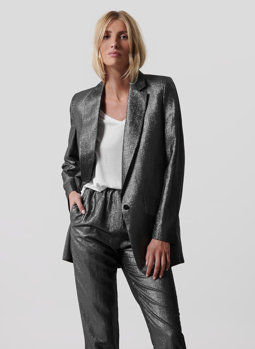 Le blazer Haivy gris lurex argenté est la version élégante et lumineuse du tailleur que l'on portera toutes au quotidien. Col tailleur, croisure fermée par un bouton, deux poches à rabat et trois petits boutons sur chaque manche. Sa coupe droite et structurée n'est pas en contradiction avec son rendu léger grâce à sa toile de lin et fils lurex metallisés.
