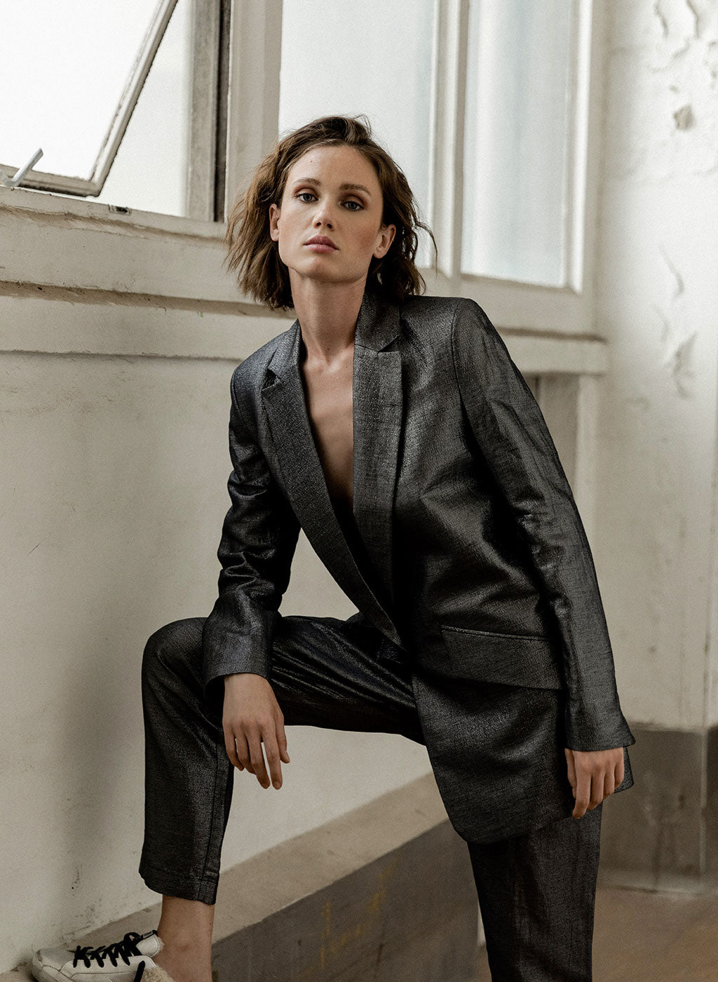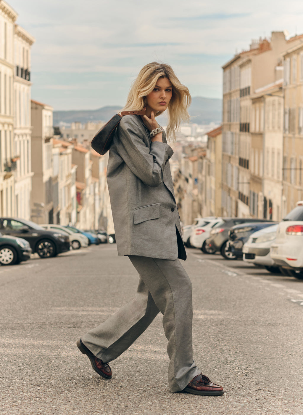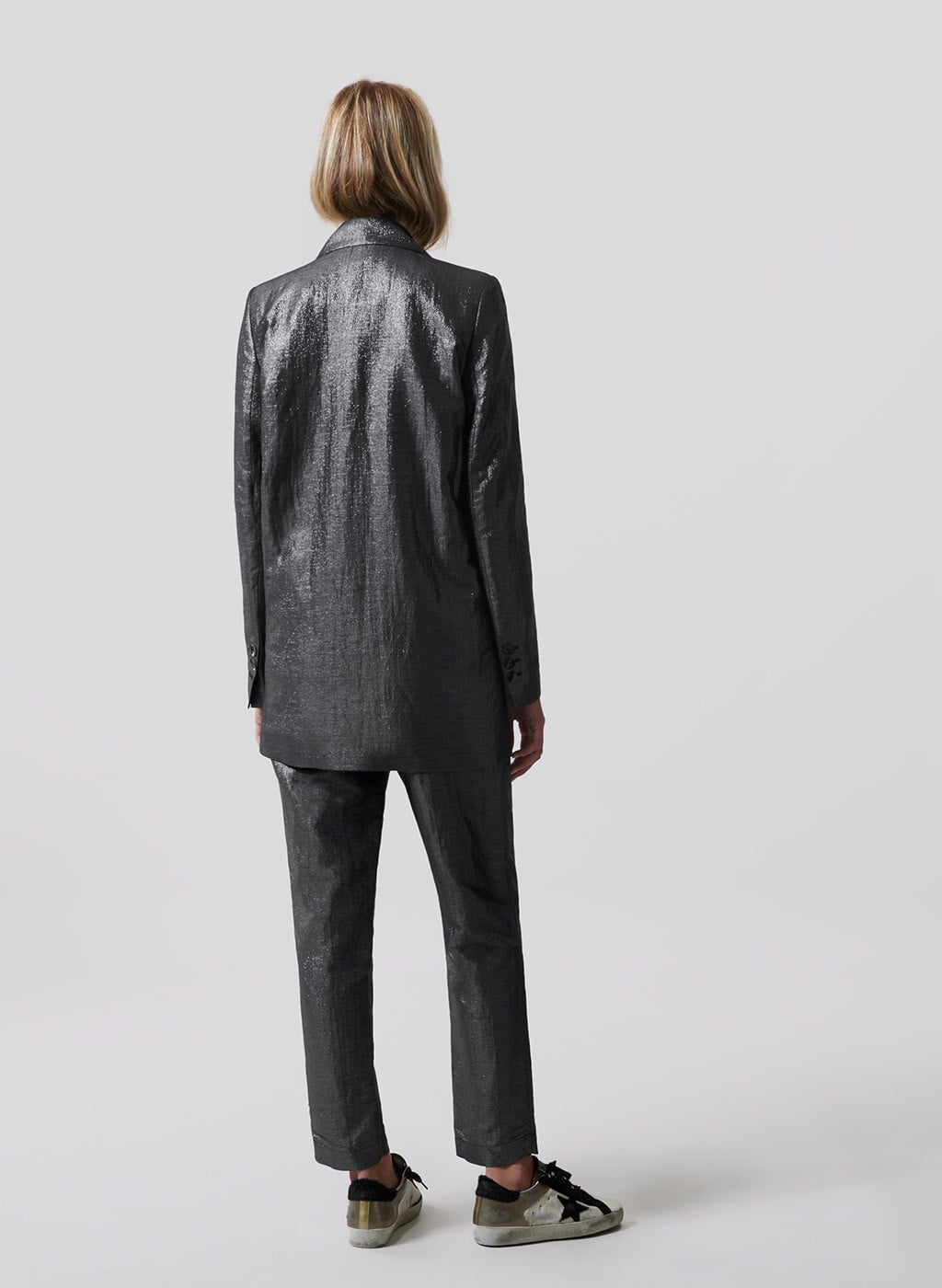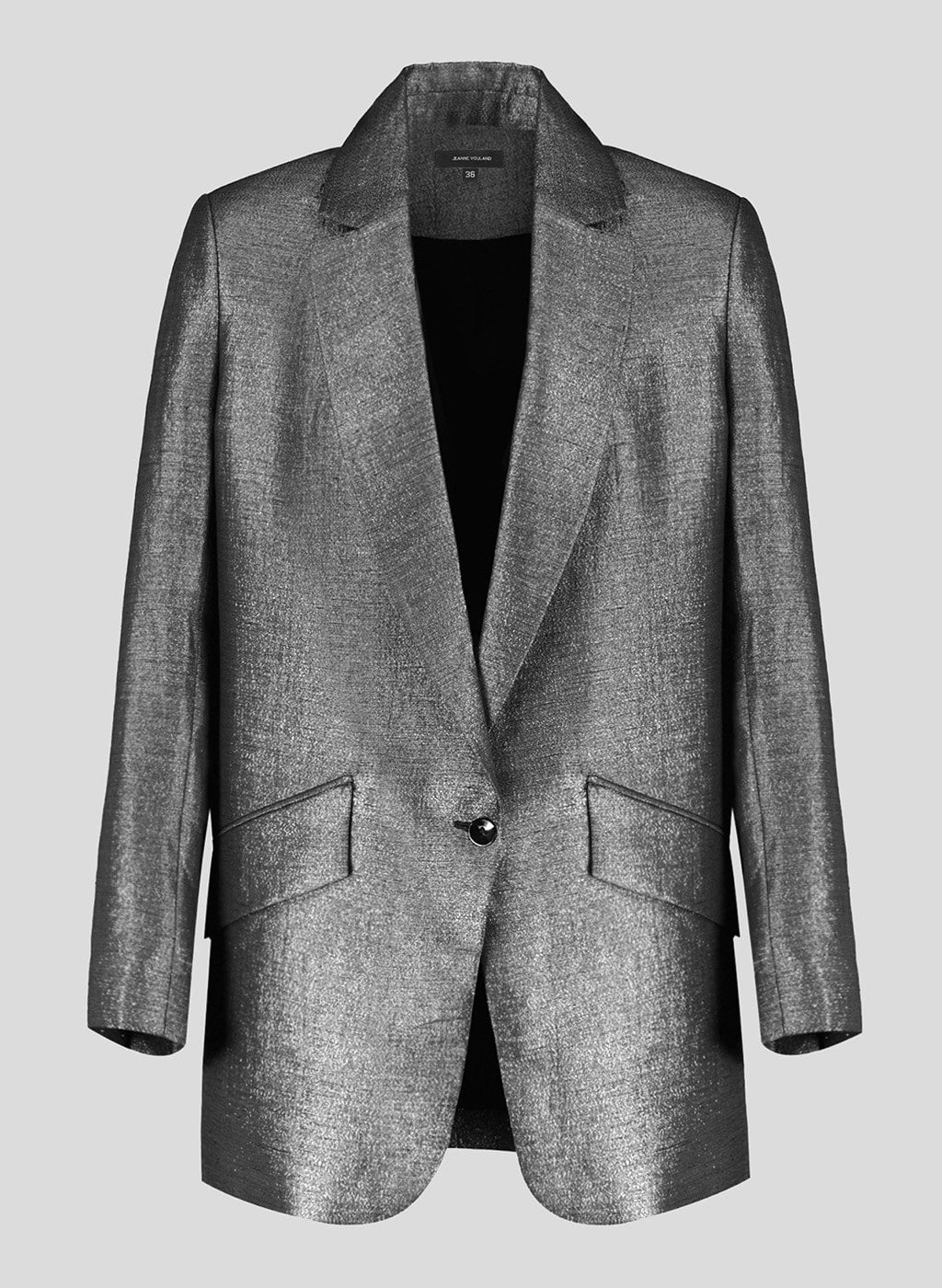 Le blazer Haivy gris lurex argenté est la version élégante et lumineuse du tailleur que l'on portera toutes au quotidien. Col tailleur, croisure fermée par un bouton, deux poches à rabat et trois petits boutons sur chaque manche. Sa coupe droite et structurée n'est pas en contradiction avec son rendu léger grâce à sa toile de lin et fils lurex metallisés.