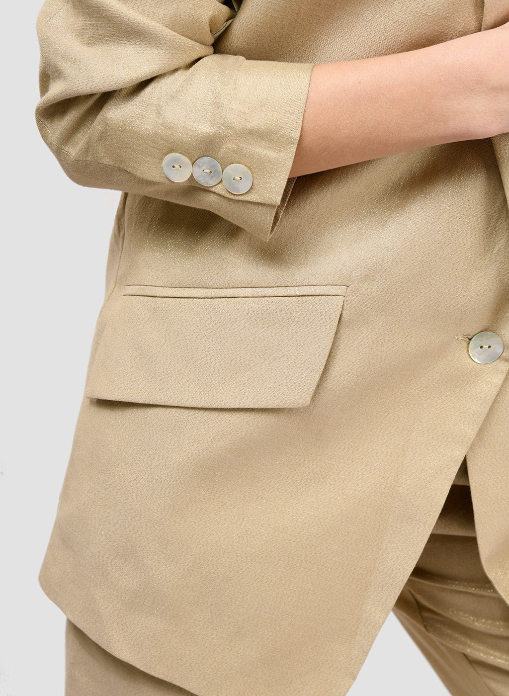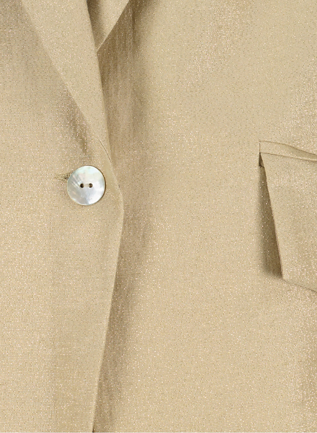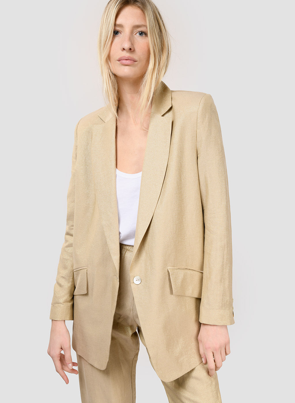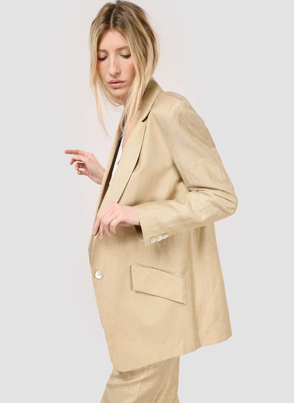 Le blazer Haivy gris lurex argenté est la version élégante et lumineuse du tailleur que l'on portera toutes au quotidien. Col tailleur, croisure fermée par un bouton, deux poches à rabat et trois petits boutons sur chaque manche. Sa coupe droite et structurée n'est pas en contradiction avec son rendu léger grâce à sa toile de lin et fils lurex metallisés.