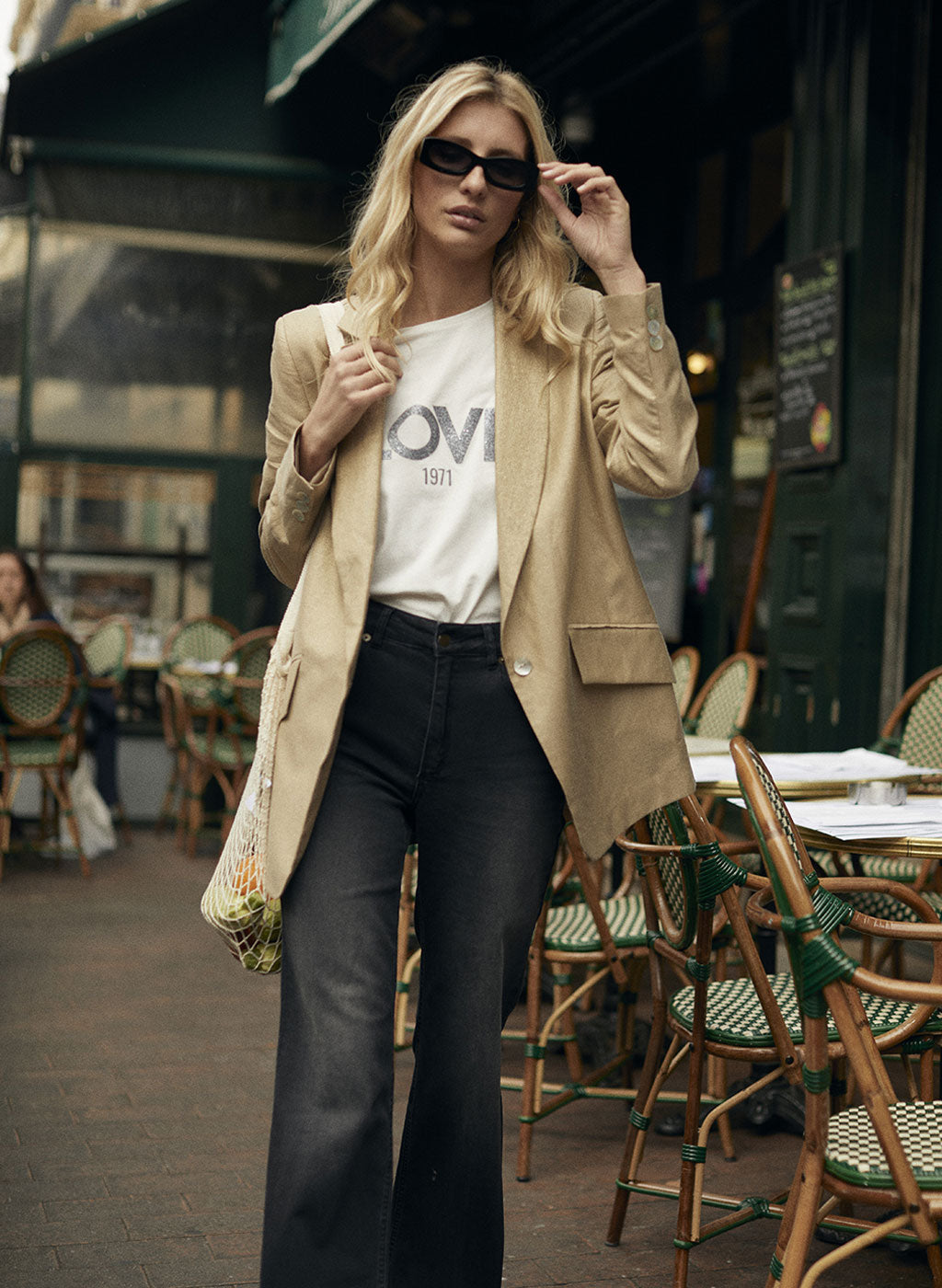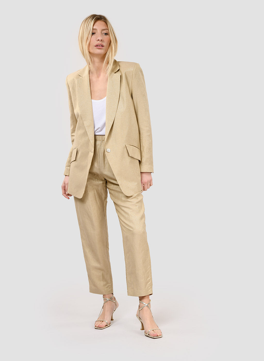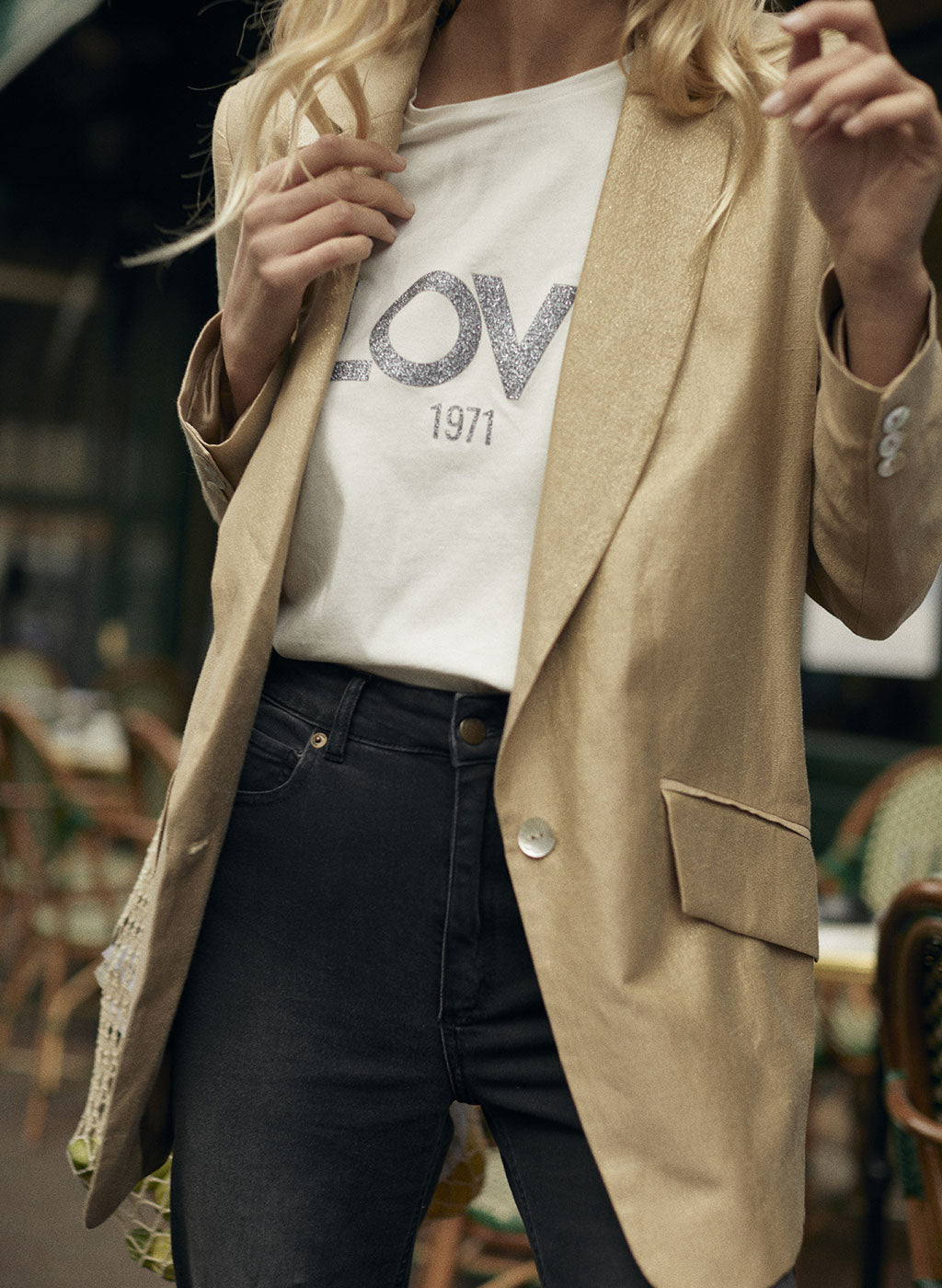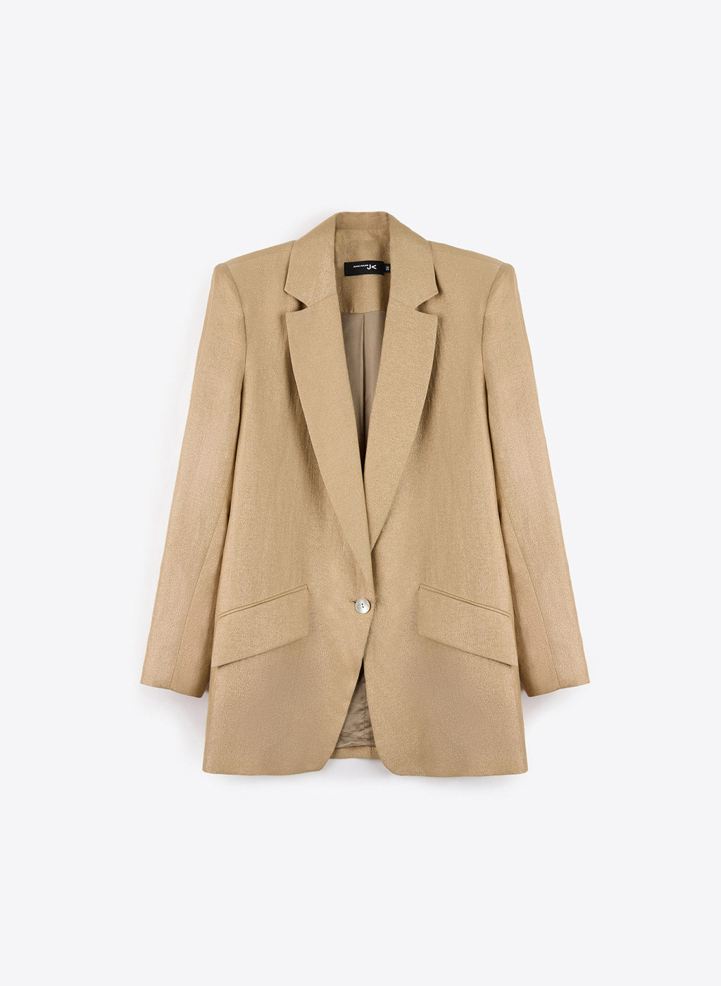 Le blazer Haivy gris lurex argenté est la version élégante et lumineuse du tailleur que l'on portera toutes au quotidien. Col tailleur, croisure fermée par un bouton, deux poches à rabat et trois petits boutons sur chaque manche. Sa coupe droite et structurée n'est pas en contradiction avec son rendu léger grâce à sa toile de lin et fils lurex metallisés.