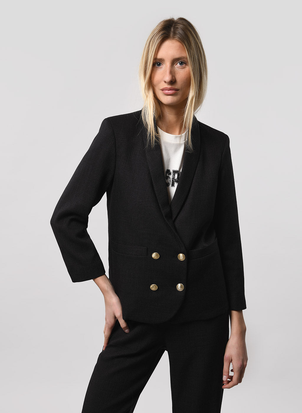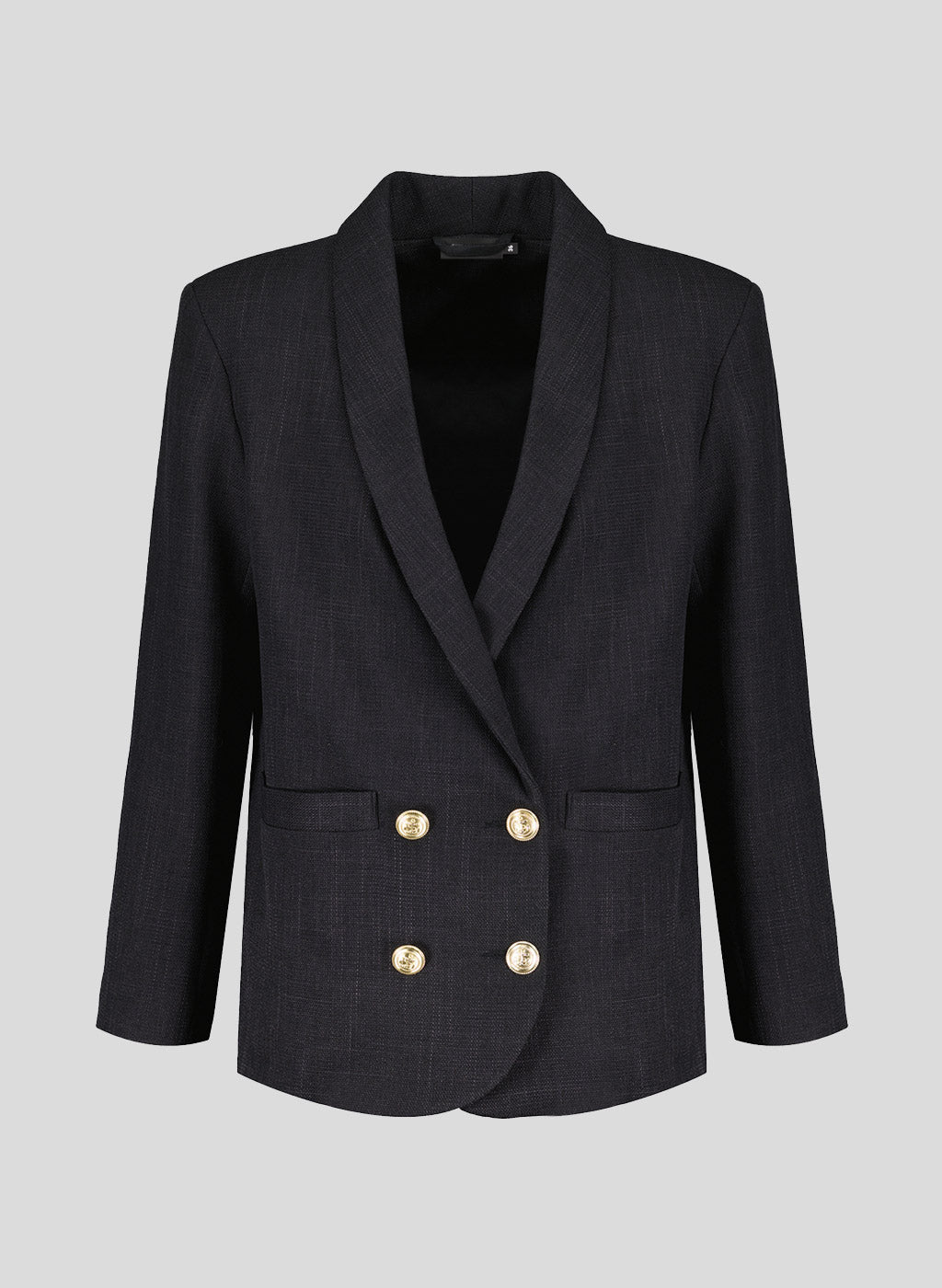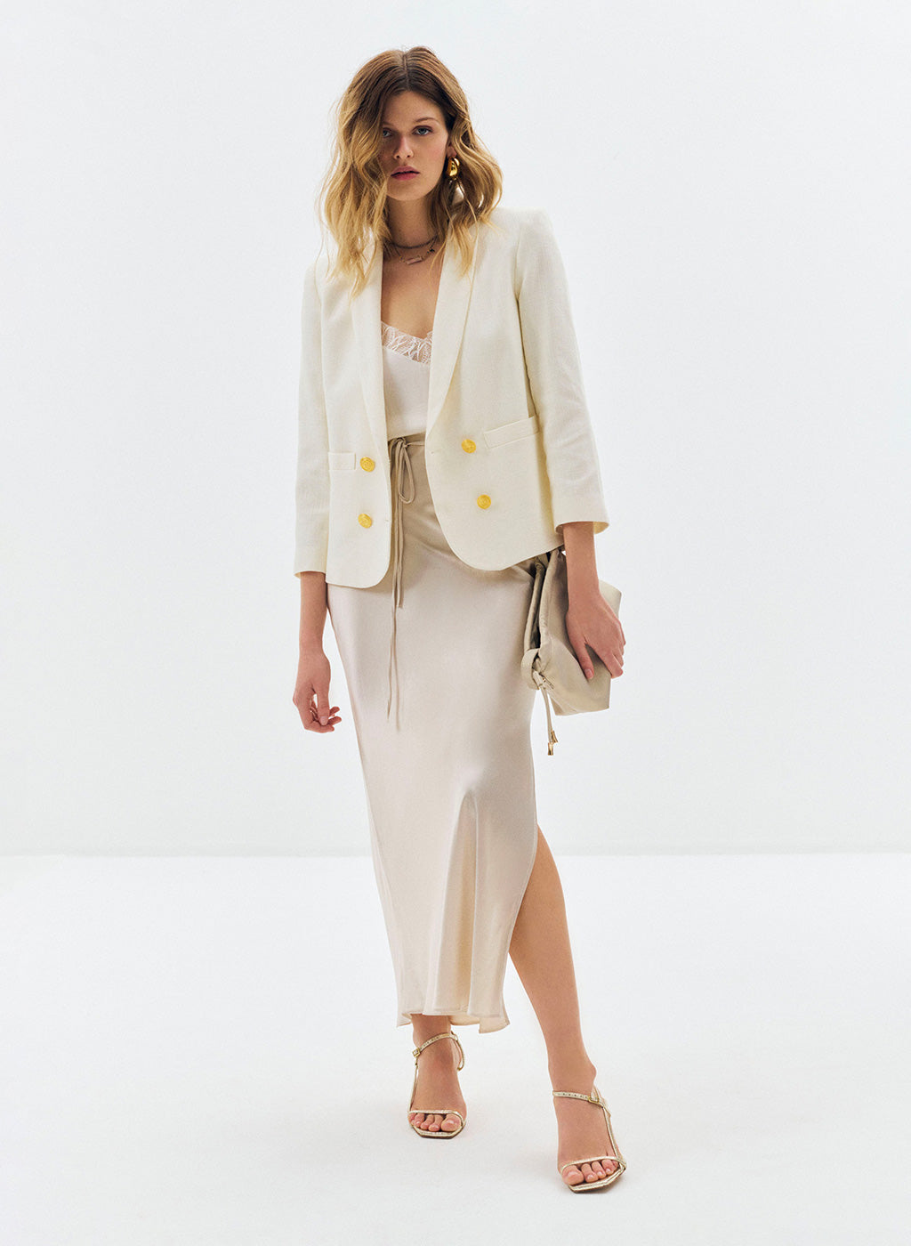 Le blazer Jaki en tissu effet lin ivoire conjugue inspiration masculine et féminité assumée. Sa coupe droite structurée et son double boutonnage doré lui confèrent une allure sophistiquée, idéale pour sublimer une silhouette avec élégance. Ses poches à rabat apportent une touche pratique et chic, tandis que son tombé impeccable s’adapte aussi bien à un jean casual qu’à un pantalon coordonné pour un total look.
