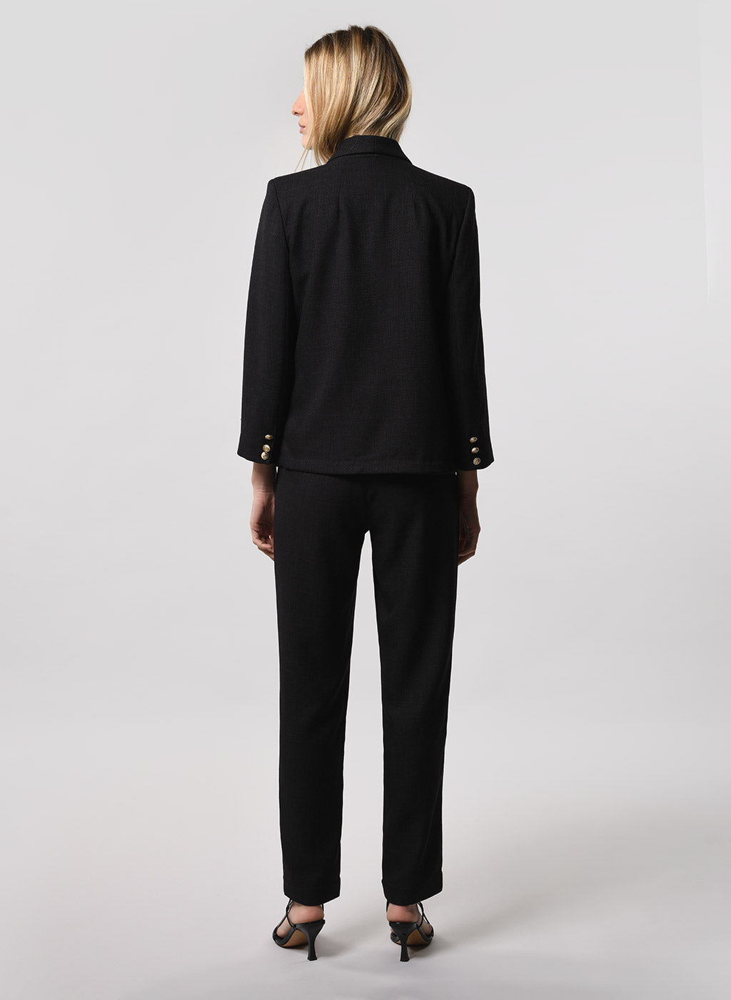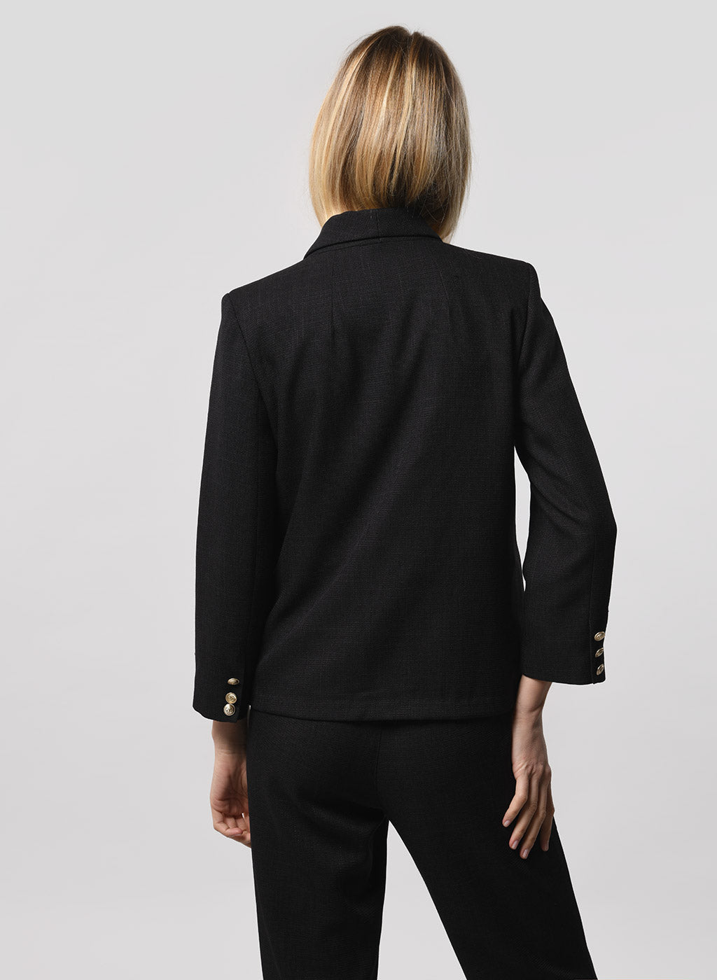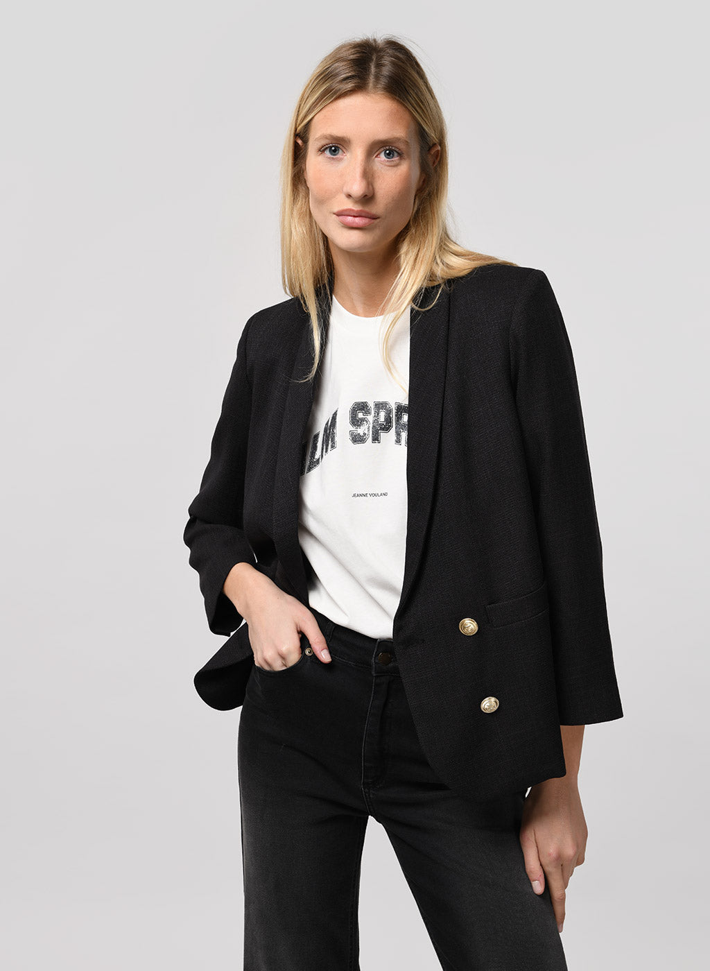 Le blazer Jaki en tissu effet lin ivoire conjugue inspiration masculine et féminité assumée. Sa coupe droite structurée et son double boutonnage doré lui confèrent une allure sophistiquée, idéale pour sublimer une silhouette avec élégance. Ses poches à rabat apportent une touche pratique et chic, tandis que son tombé impeccable s’adapte aussi bien à un jean casual qu’à un pantalon coordonné pour un total look.