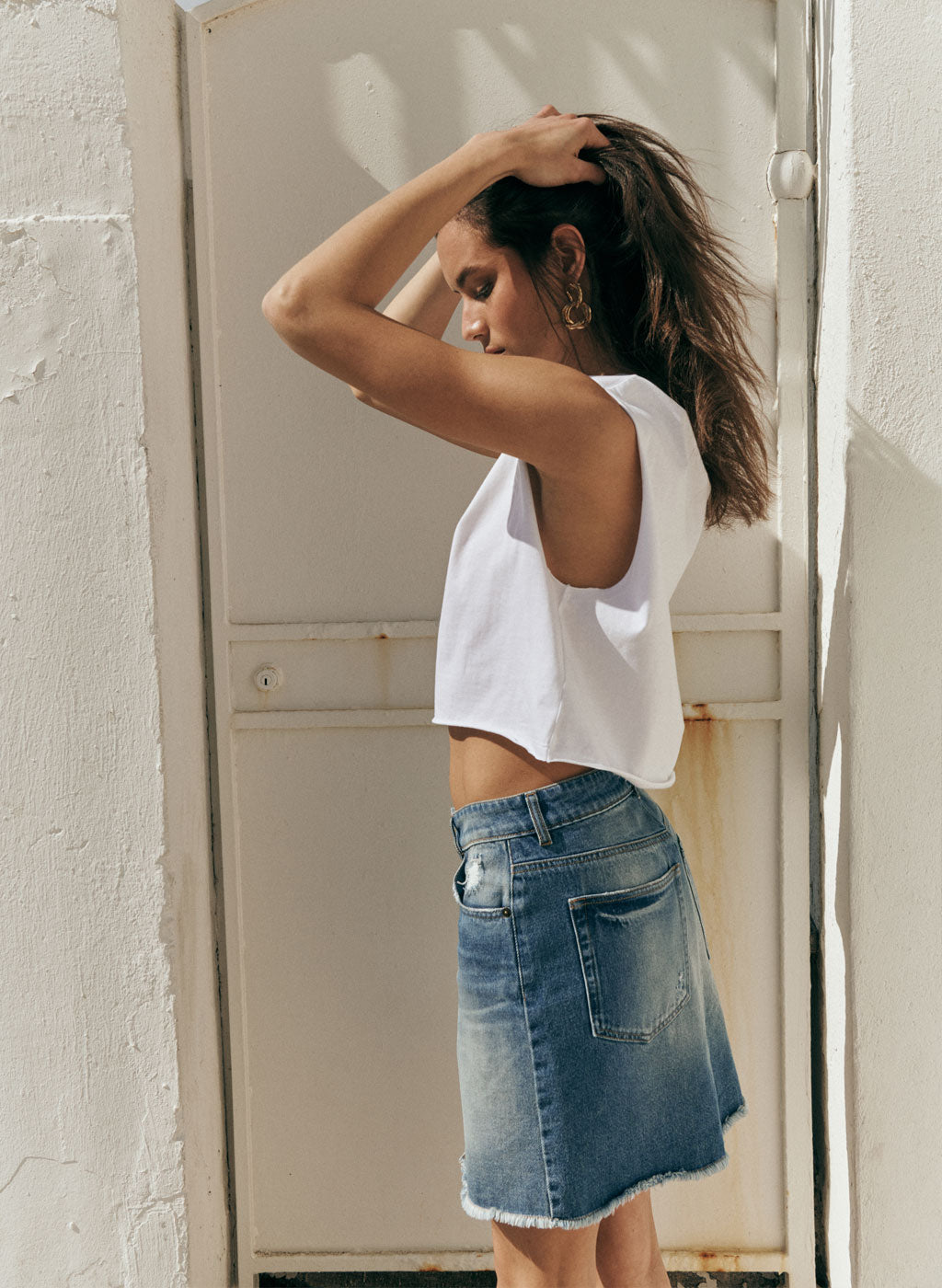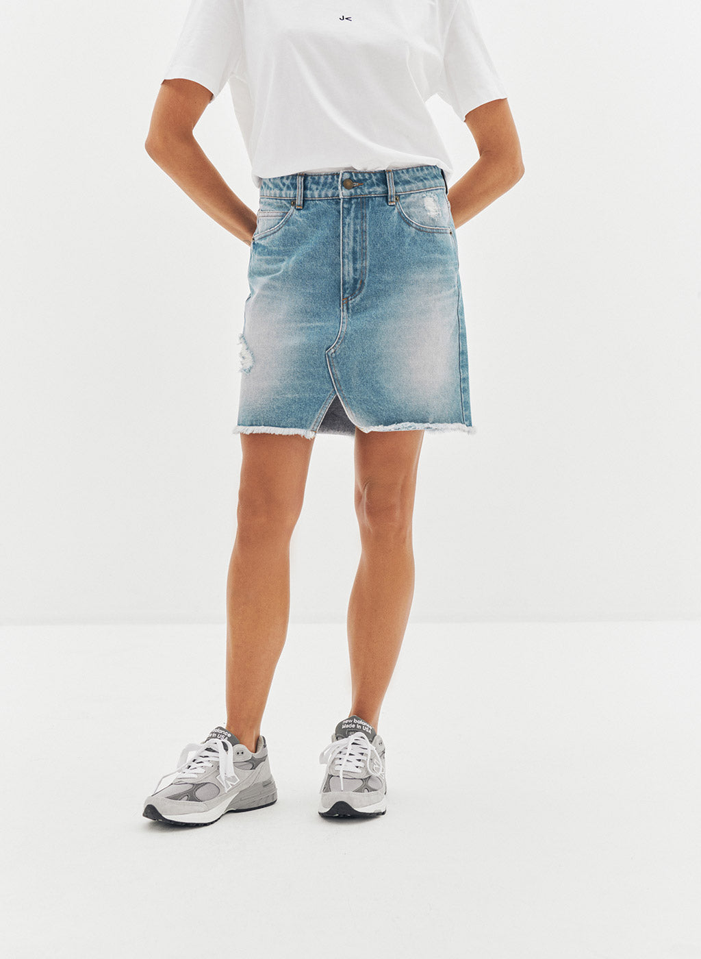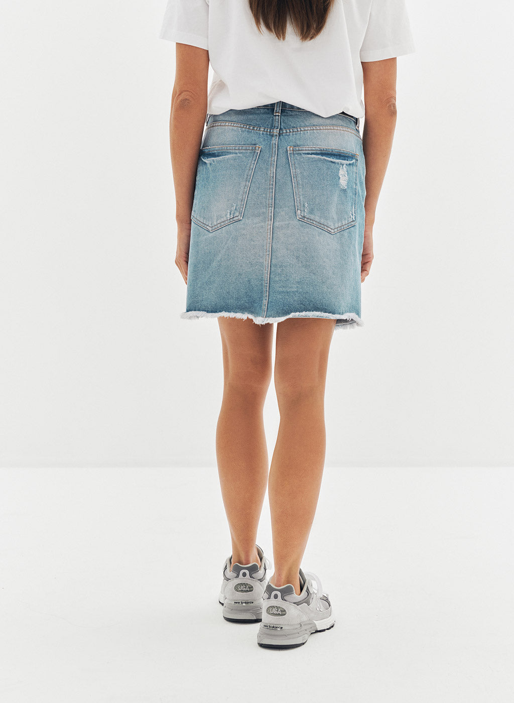 La jupe courte Lali est la petite jupe en denim bleu par excellence. Confectionnée en base denim en 100% coton, elle a cinq poches, des boutons et rivets en métal gravés du logo, ainsi qu'un jacron en cuir embossé JV au dos. Les détails comprennent des surpiqûres classiques, une petite fente sur le bas et une finition bord franc effiloché. Avec une coupe droite et à base asymétrique, elle est effilochée et coupée à cru sur le bas La jupe Lali offre un style décontracté et moderne pour une tenue quotidienne tendance. Associez-là à un sweat, le tee-shirt Bacha ou encore une blouse. Côté chaussures ? Elle se mariera parfaitement avec des baskets, des sandales ou des petits talons.