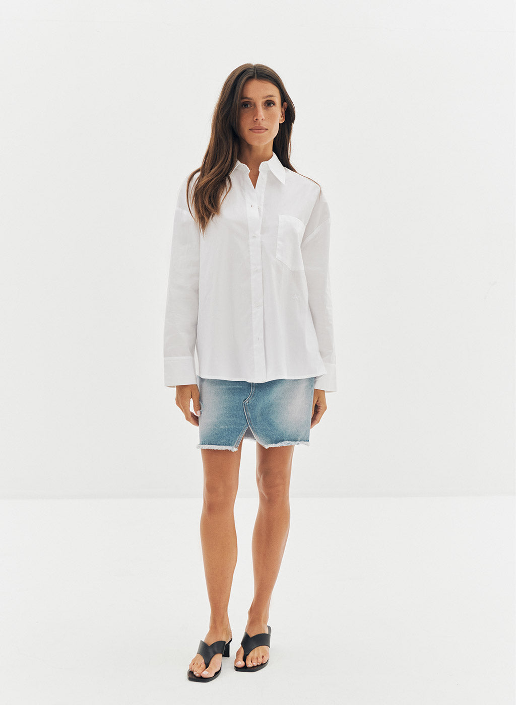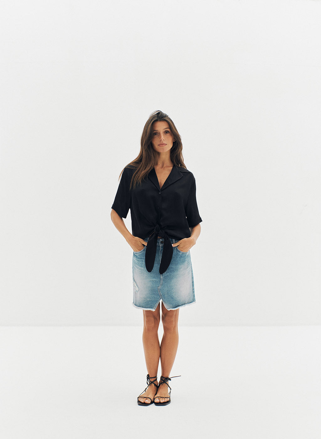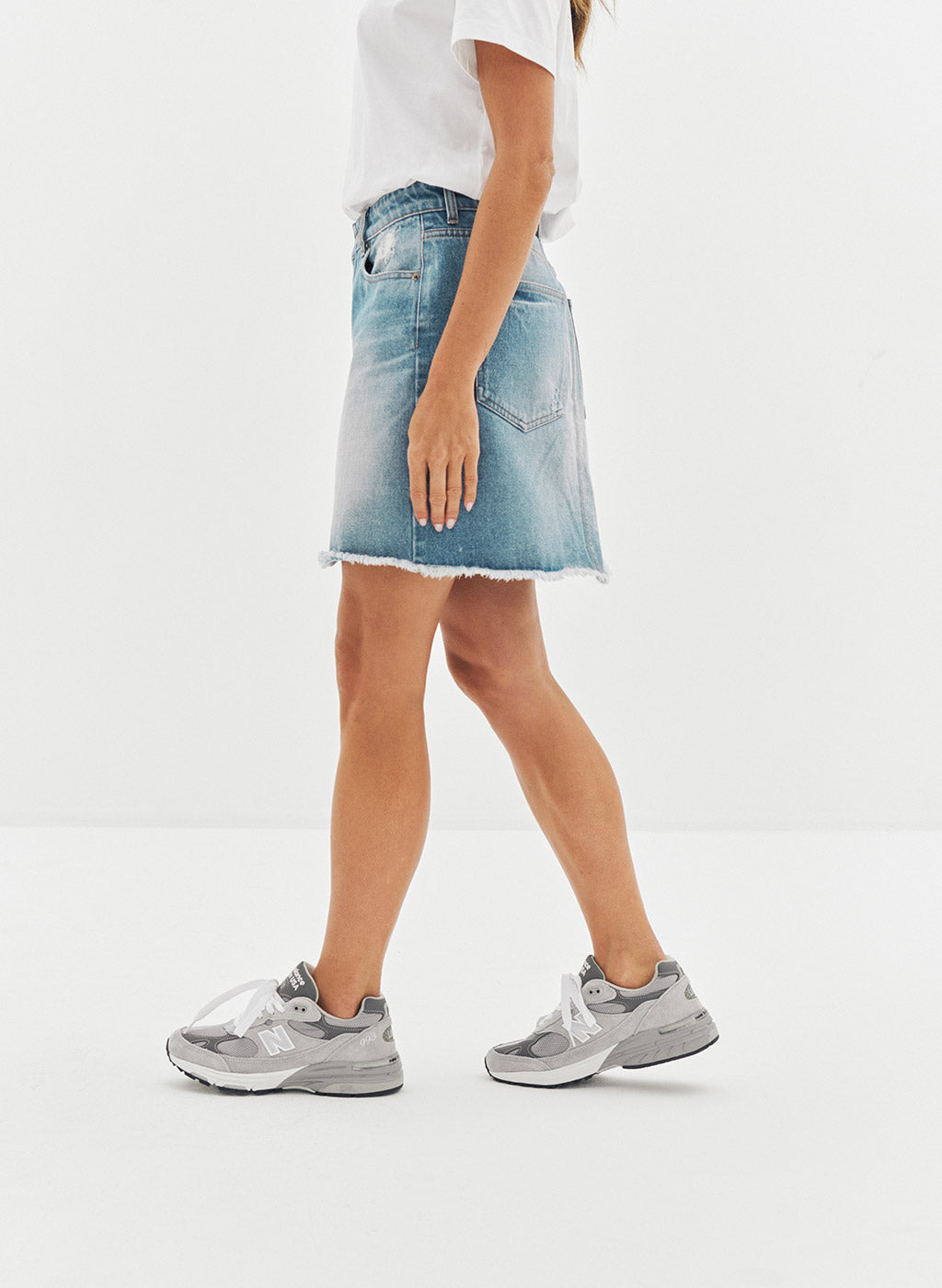 La jupe courte Lali est la petite jupe en denim bleu par excellence. Confectionnée en base denim en 100% coton, elle a cinq poches, des boutons et rivets en métal gravés du logo, ainsi qu'un jacron en cuir embossé JV au dos. Les détails comprennent des surpiqûres classiques, une petite fente sur le bas et une finition bord franc effiloché. Avec une coupe droite et à base asymétrique, elle est effilochée et coupée à cru sur le bas La jupe Lali offre un style décontracté et moderne pour une tenue quotidienne tendance. Associez-là à un sweat, le tee-shirt Bacha ou encore une blouse. Côté chaussures ? Elle se mariera parfaitement avec des baskets, des sandales ou des petits talons.