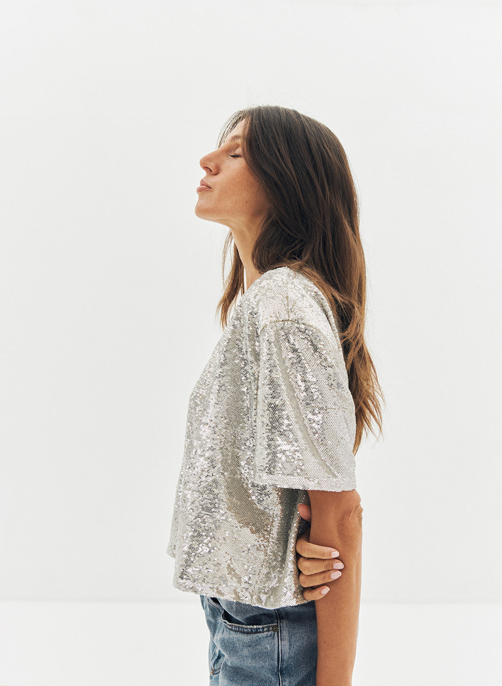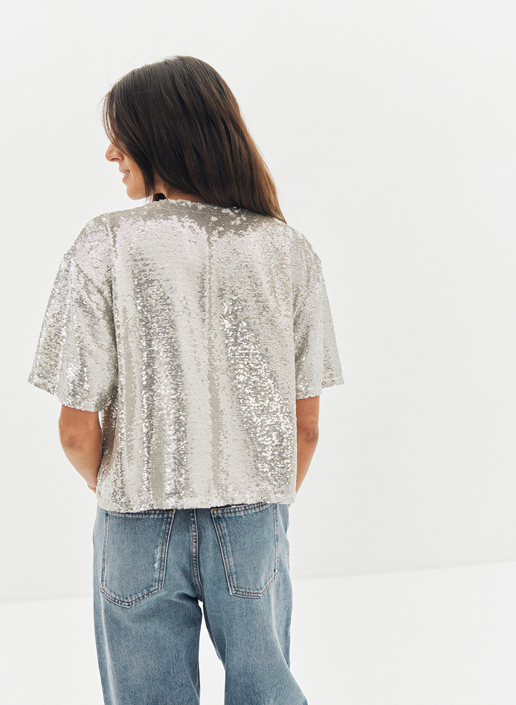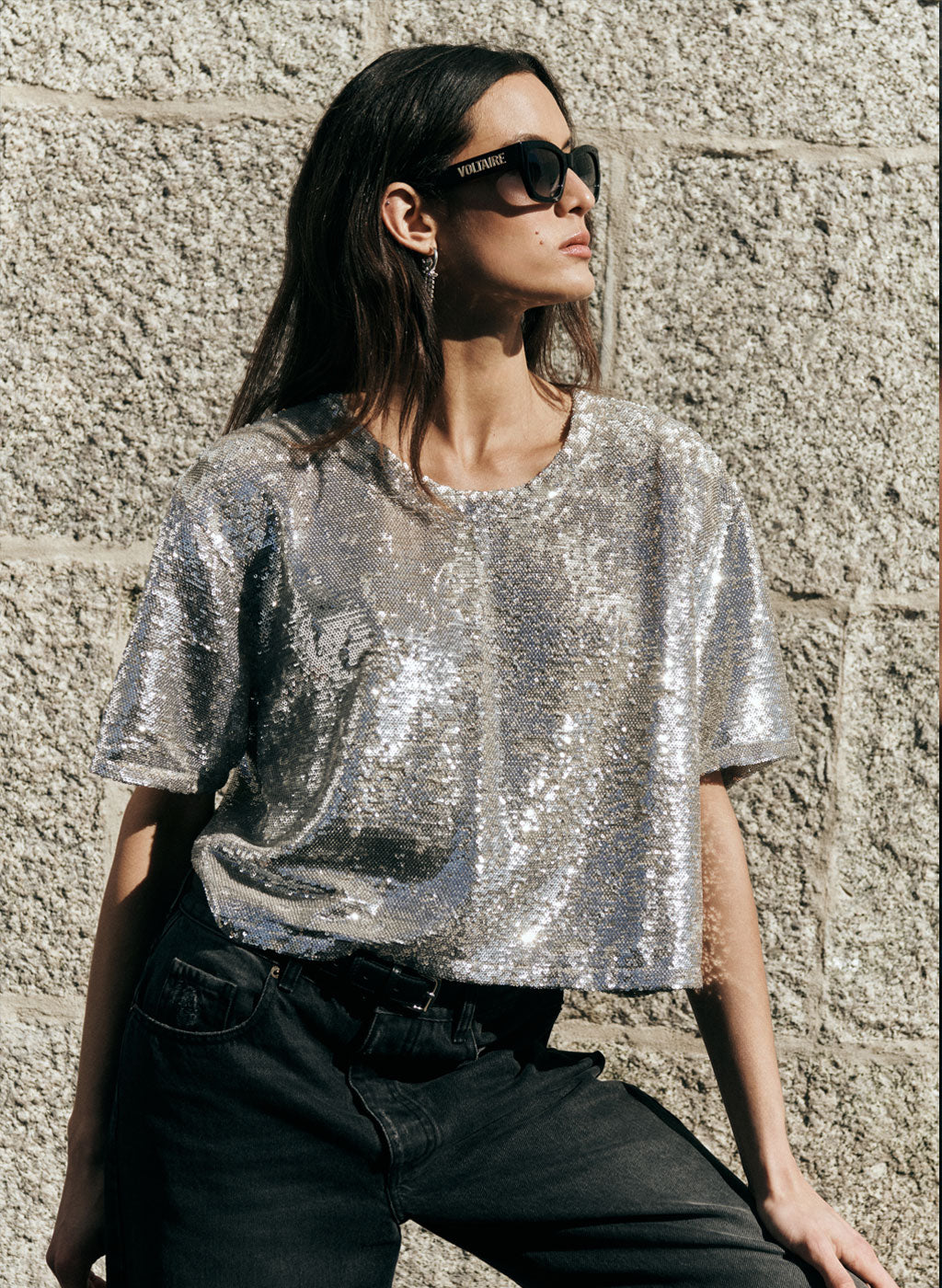 Entièrement brodé de sequins argentés, le tee-shirt Limo capte la lumière et attire tous les regards, tout en conservant une allure effortless. Confectionné dans une coupe boxy droite, il présente un col rond, des manches courtes légèrement amples et une doublure intérieure pour garantir un confort optimal au quotidien. Son esprit festif se marie aussi bien à un jean délavé qu'à une jupe satinée, pour des looks de jour comme de soirée.