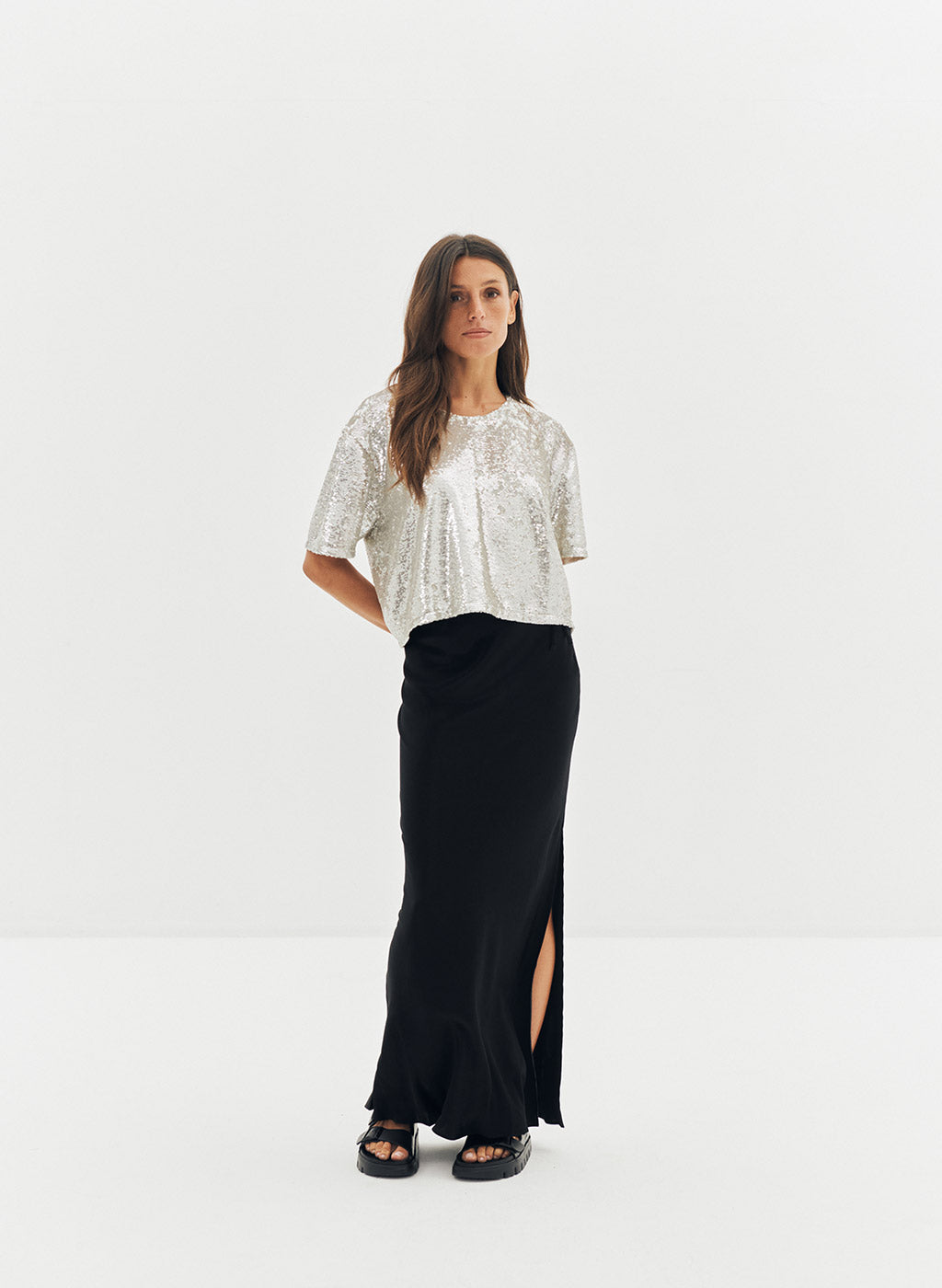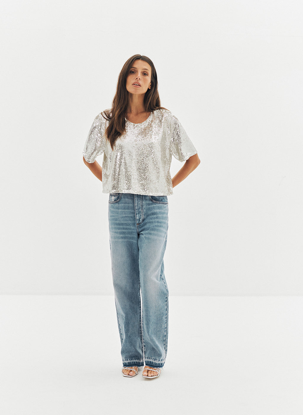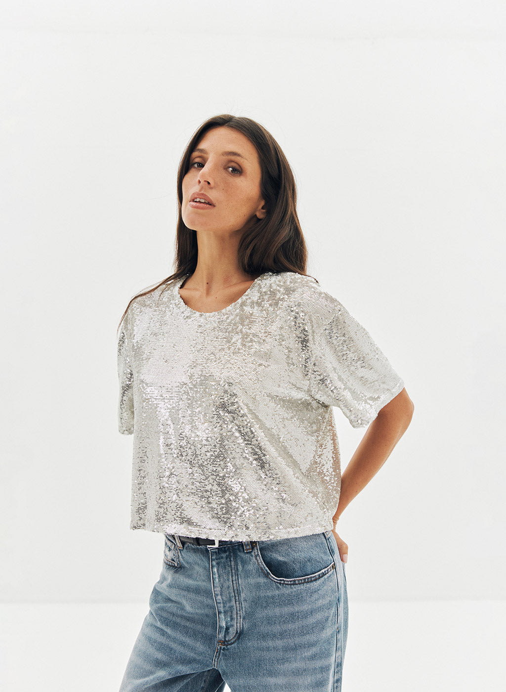 Entièrement brodé de sequins argentés, le tee-shirt Limo capte la lumière et attire tous les regards, tout en conservant une allure effortless. Confectionné dans une coupe boxy droite, il présente un col rond, des manches courtes légèrement amples et une doublure intérieure pour garantir un confort optimal au quotidien. Son esprit festif se marie aussi bien à un jean délavé qu'à une jupe satinée, pour des looks de jour comme de soirée.