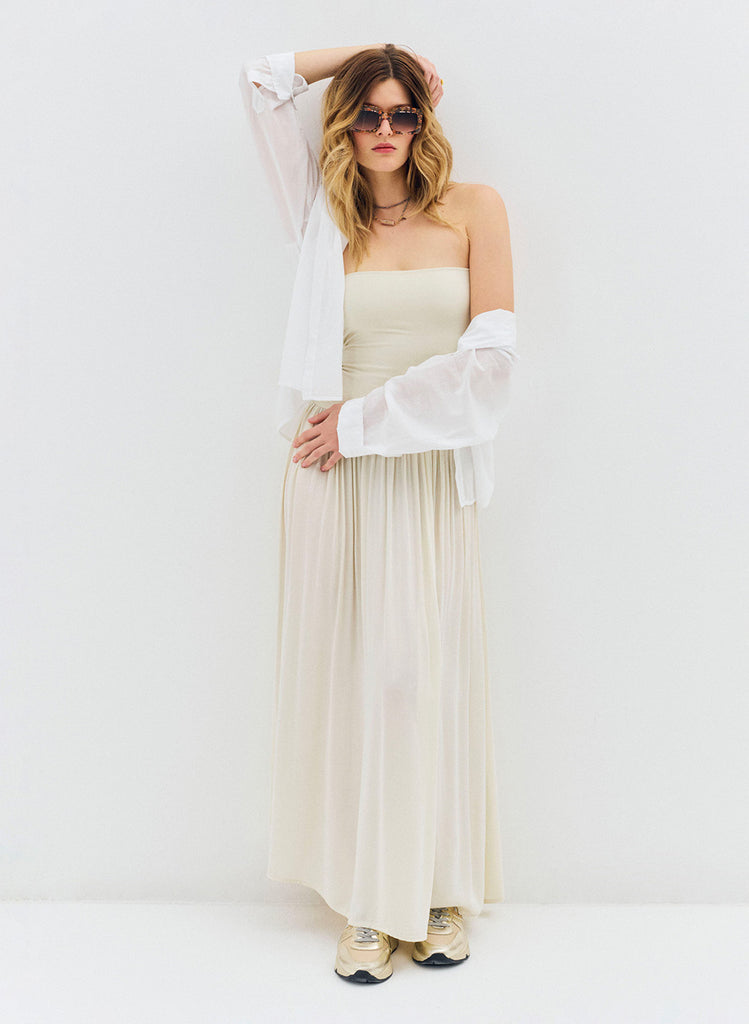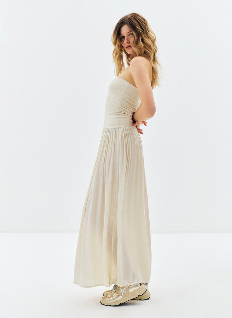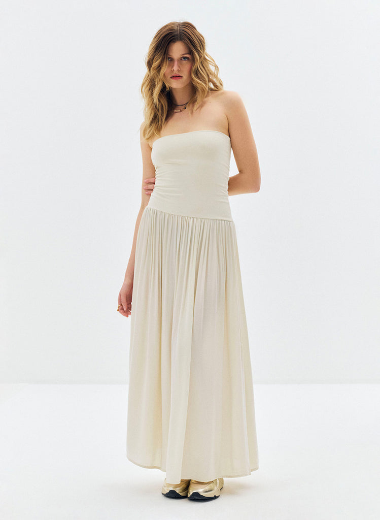 Robe longue Lyv beige à bustier bi-matière