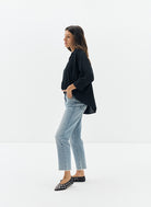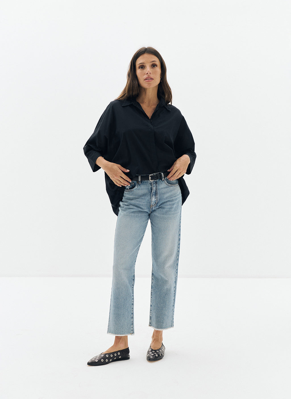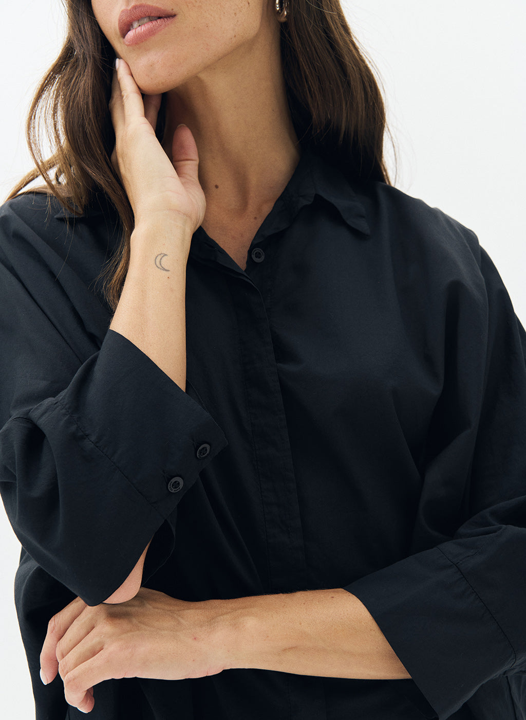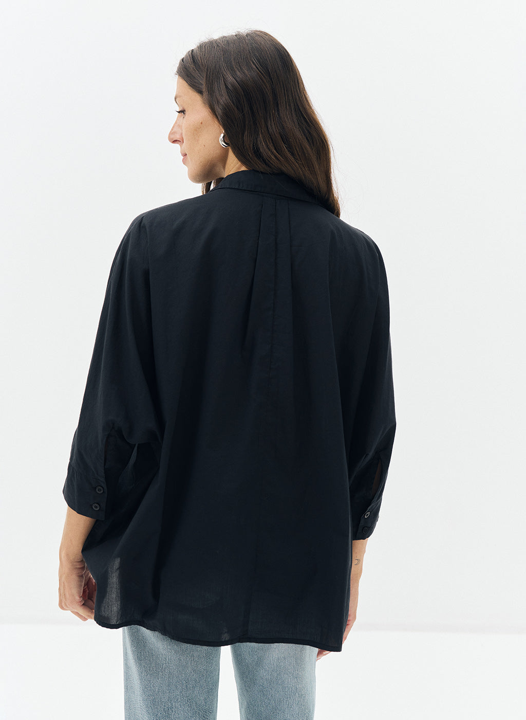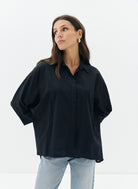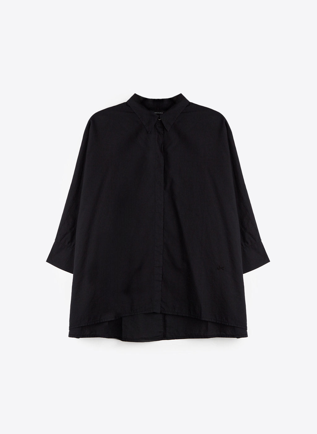 La blouse Malo en coton noir allie simplicité et modernité. Son col chemise classique, ses manches 3/4 et sa fermeture boutonnée structurent l’allure, tandis que sa coupe ample à base droite assure confort et fluidité. Le logo JV brodé ton sur ton vient signer cette pièce intemporelle avec subtilité.