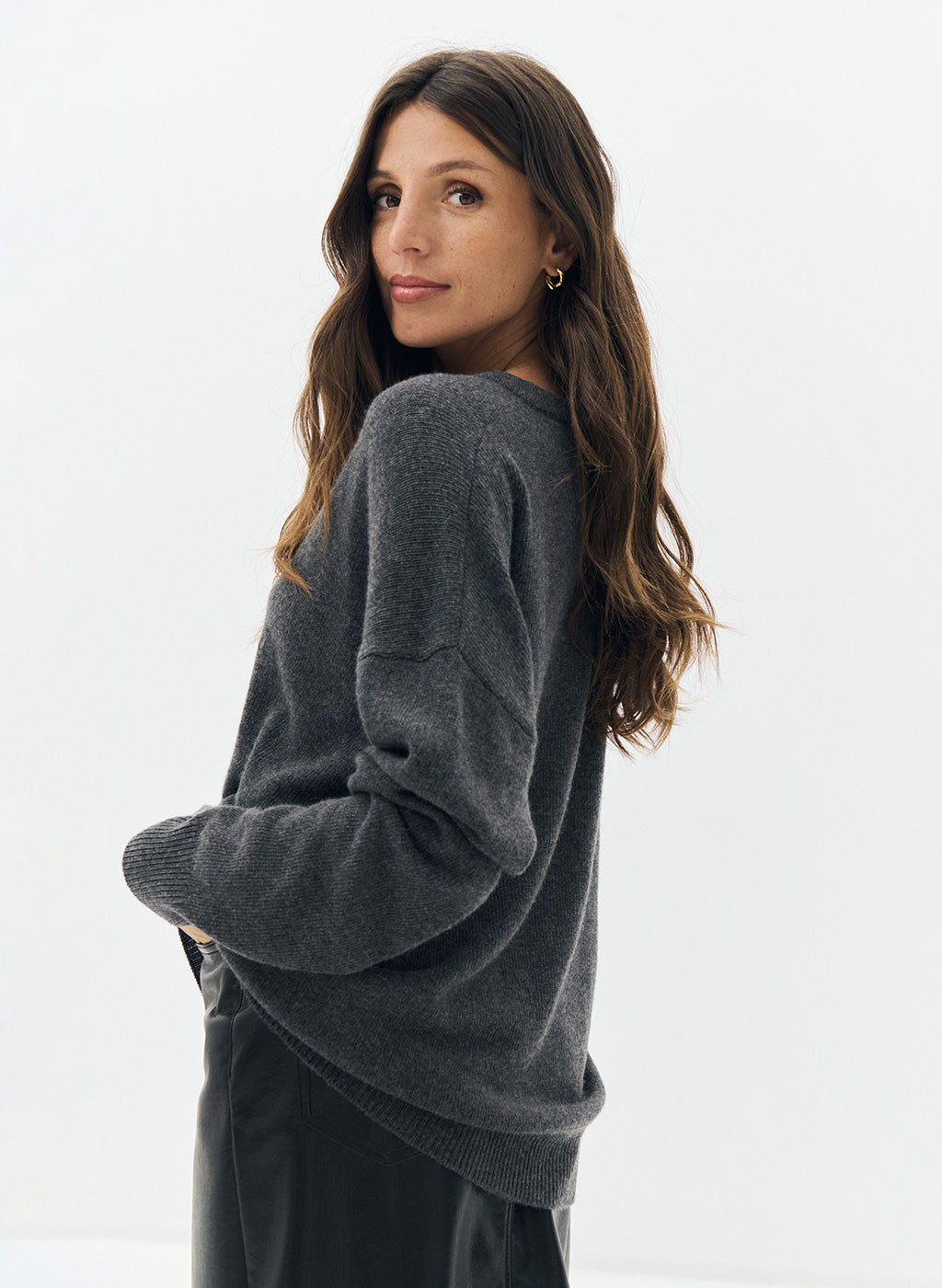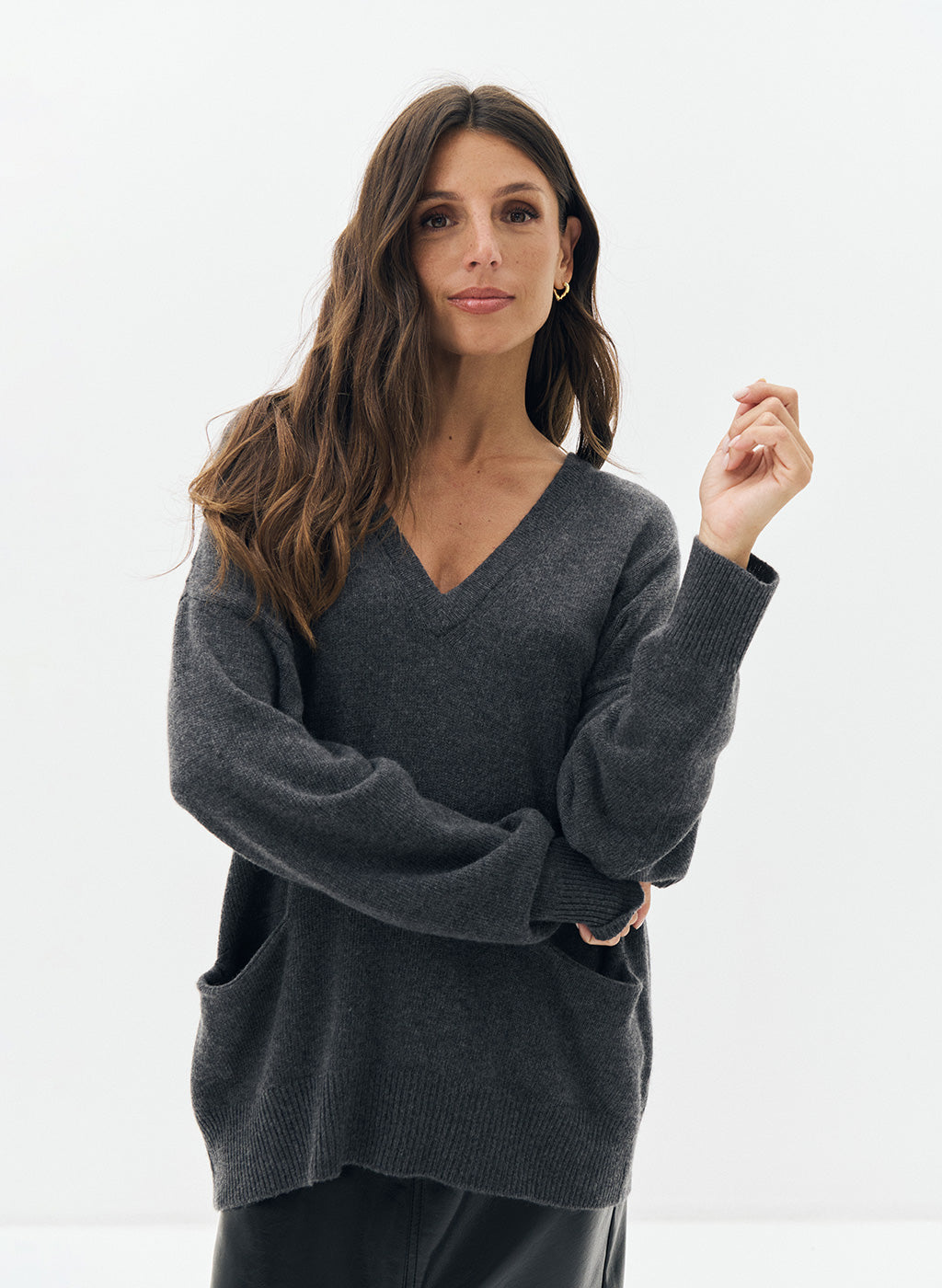 Le pull Misti en laine gris anthracite est un essentiel alliant confort et élégance. Son col en V, ses manches longues et ses deux poches plaquées à l'avant offrent une combinaison parfaite de chaleur et de praticité. Sa coupe loose et sa base droite assurent un look décontracté mais raffiné, idéal pour les journées froides.