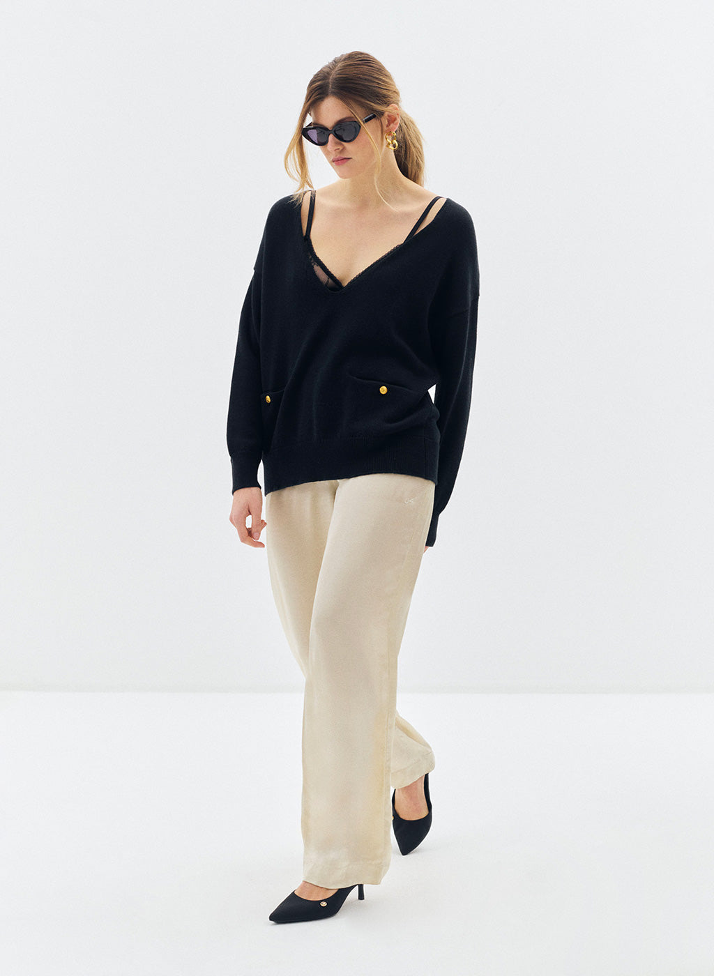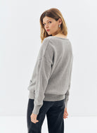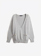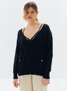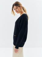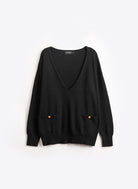 Le pull oversize Nacy noir se distingue par son col V plongeant et sa maille douce, offrant un équilibre parfait entre confort et élégance. Sa coupe ample et droite, associée à des emmanchures basses, dessine une silhouette fluide et décontractée. Les poignets côtelés et les deux poches plaquées ornées de boutons dorés gravés "JV" apportent une finition raffinée, signature discrète de la maison Jeanne Vouland.