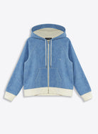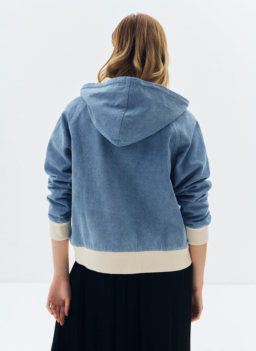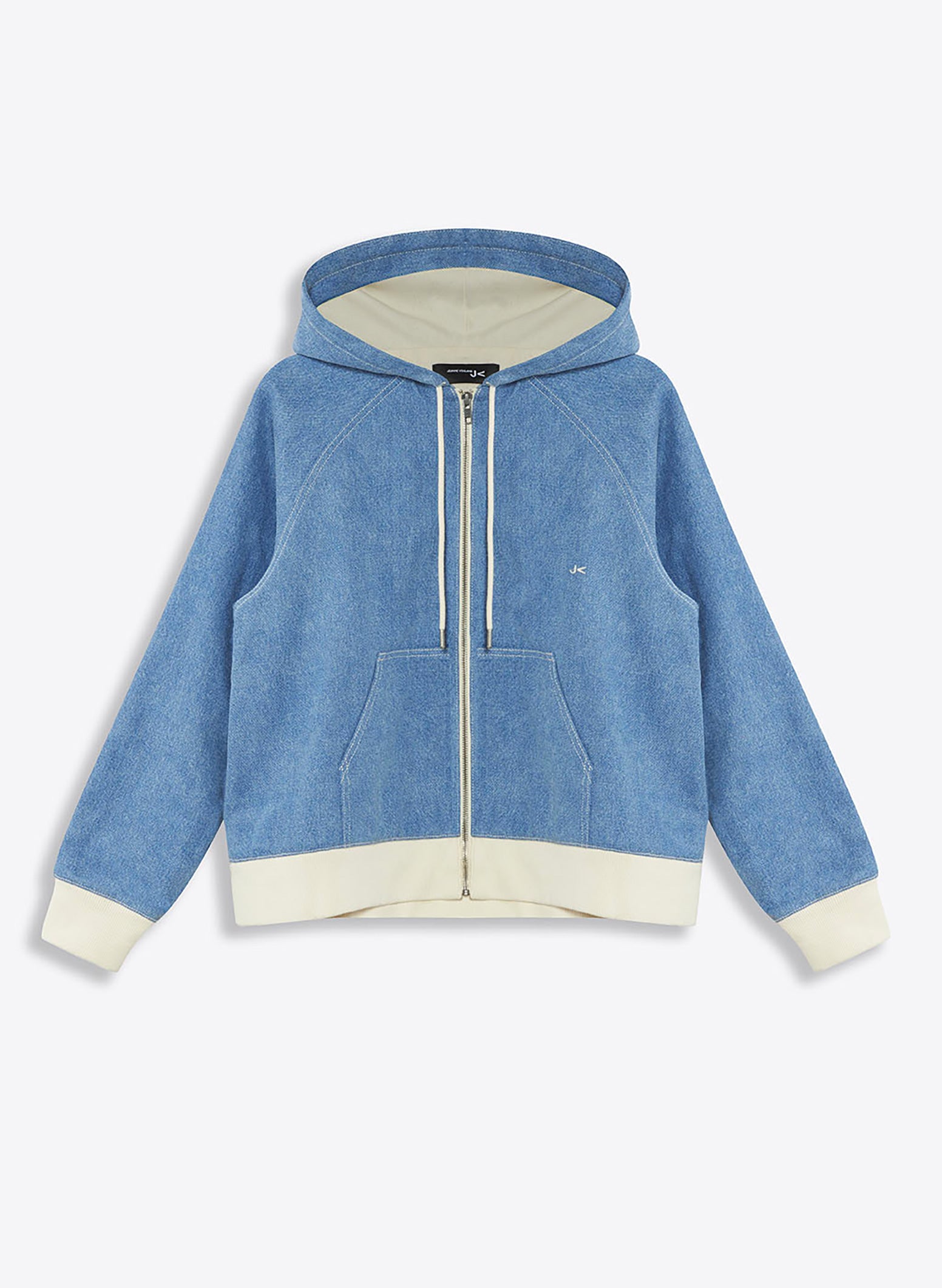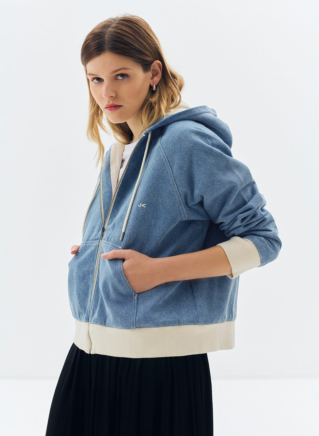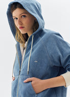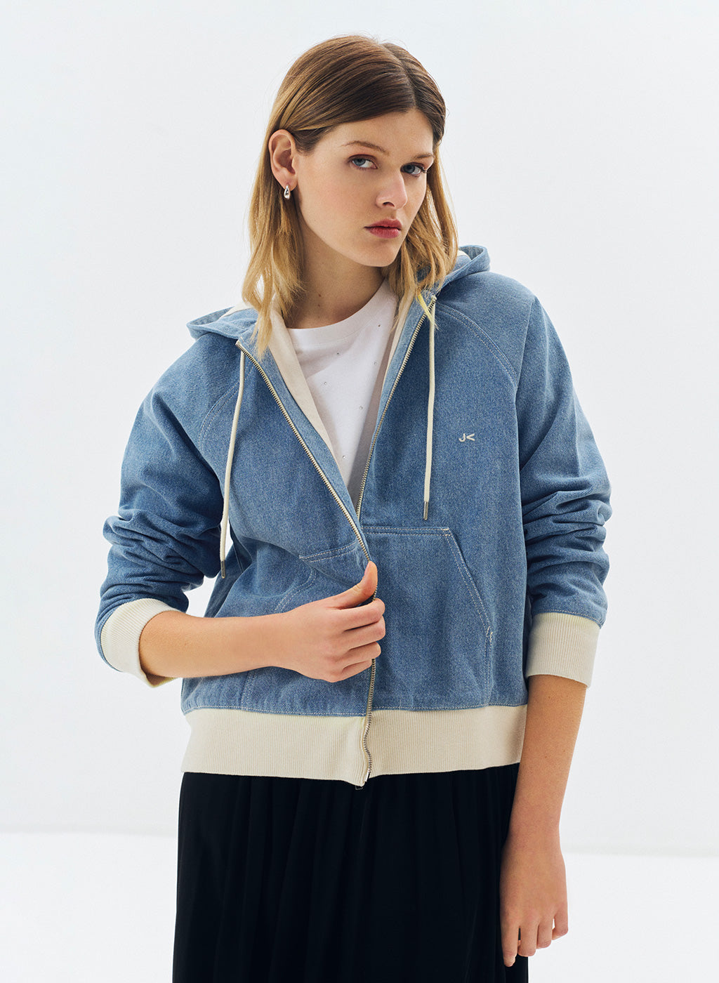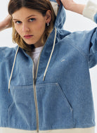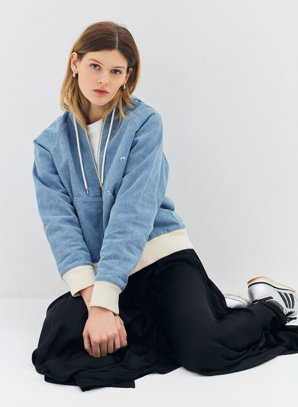 La veste Nanou en denim de coton bleu est un essentiel revisité, alliant confort et modernité. Sa coupe droite et oversize, ses manches longues à poignets côtelés blancs et sa base droite côtelée offrent une silhouette structurée et confortable. Le col montant zippé apporte une touche contemporaine, tandis que le logo JV brodé blanc sur la poitrine signe la pièce avec subtilité.