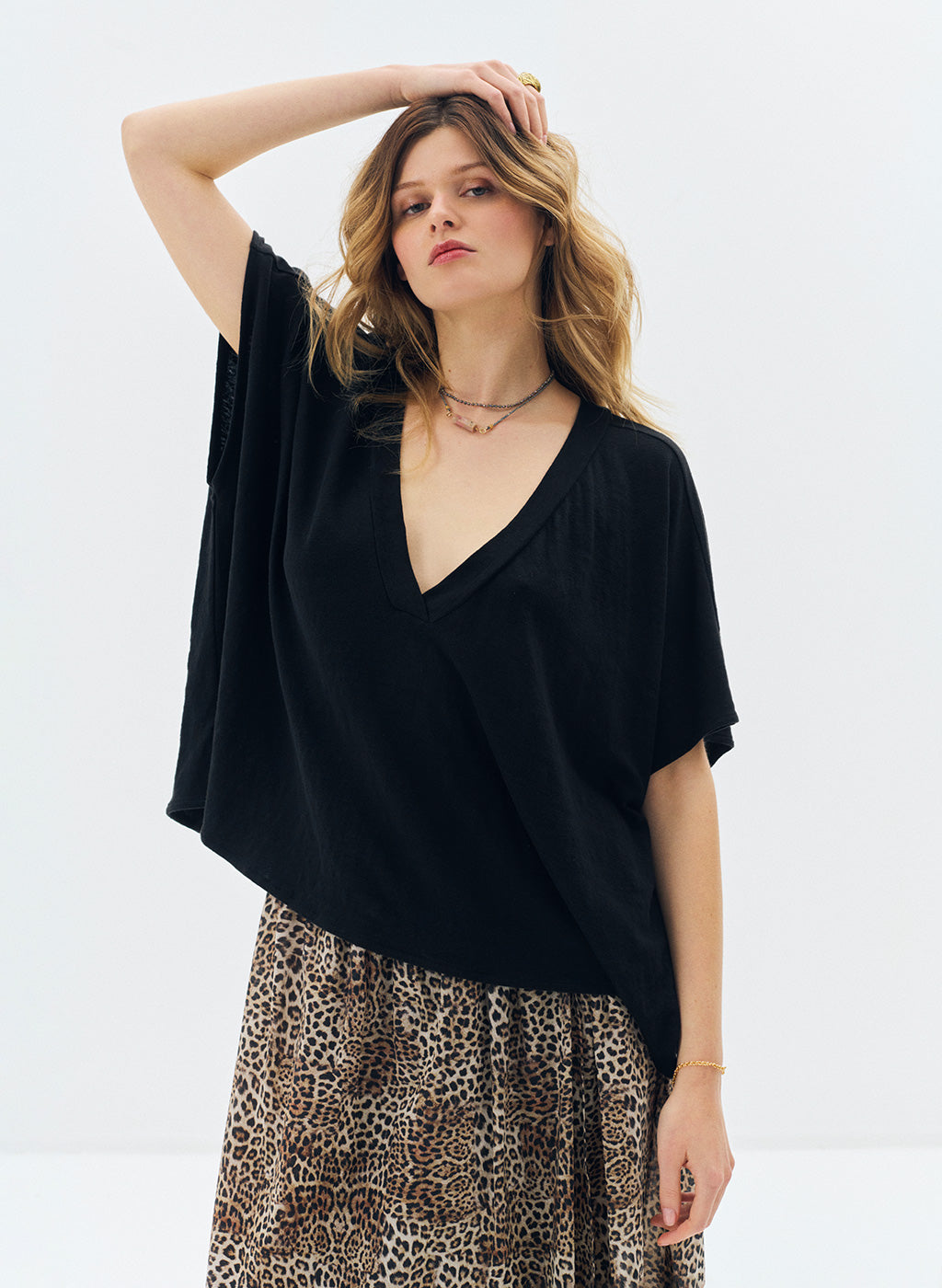 Confectionné en lin fin noir, le top oversize Nata allie confort et raffinement pour une silhouette fluide et aérienne. Son col V plongeant apporte une touche de féminité et de légèreté, tandis que ses manches courtes larges renforcent son allure décontractée et moderne. Grâce à sa coupe droite et ample, il assure un tombé fluide et élégant, idéal pour un look chic sans effort. Sa matière en lin procure une sensation de fraîcheur naturelle, parfaite pour les journées estivales.