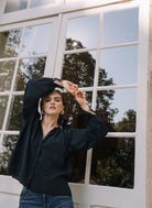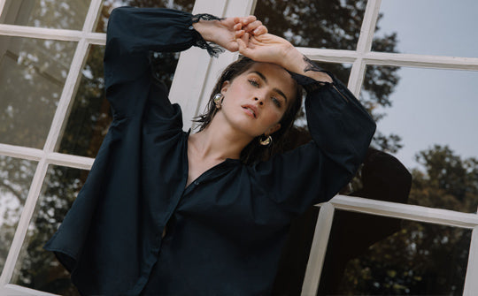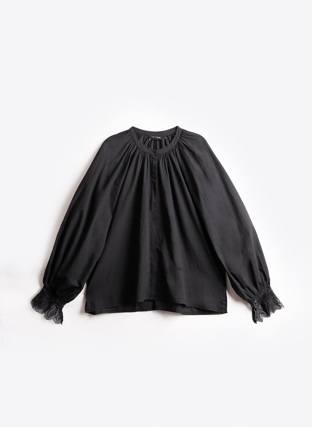 La blouse Nora en voile de coton noir semi-transparent conjugue légèreté et élégance. Son col rond délicatement plissé apporte une touche de sophistication subtile, tandis que ses manches longues, ornées de poignets boutonnés agrémentés de dentelle noire, ajoutent une note raffinement. Sa fermeture à boutons dissimulés assure une finition nette et épurée, renforçant son allure minimaliste et chic. Grâce à sa coupe ample, cette blouse offre un confort optimal tout en créant une silhouette fluide et féminine, idéale pour une tenue intemporelle et élégante.