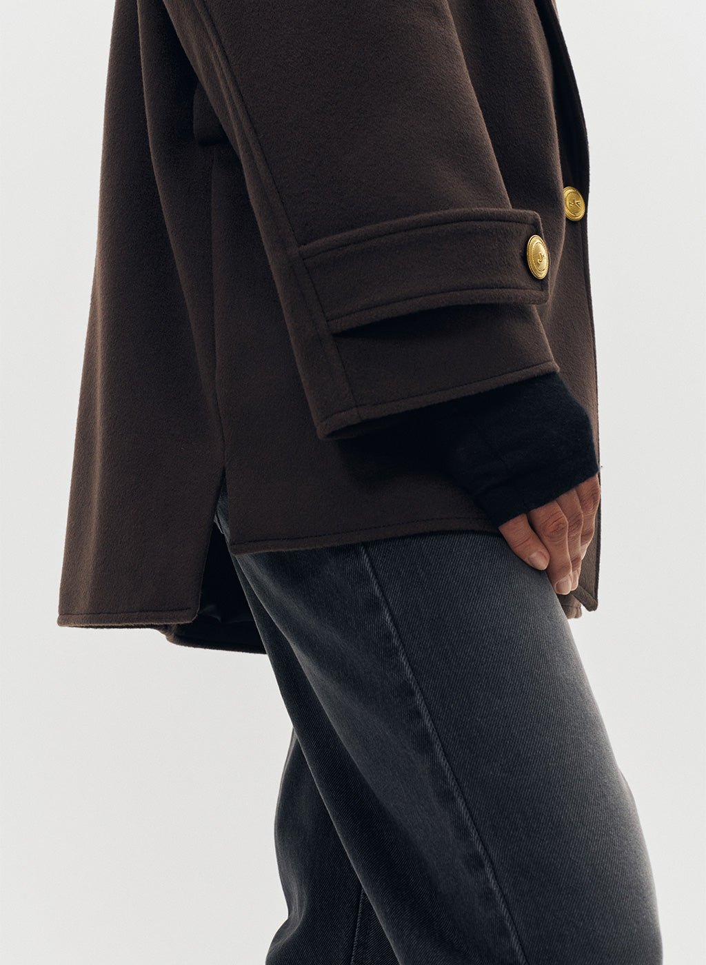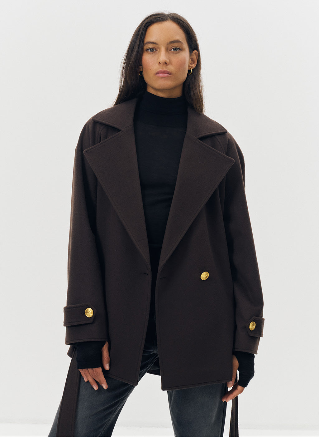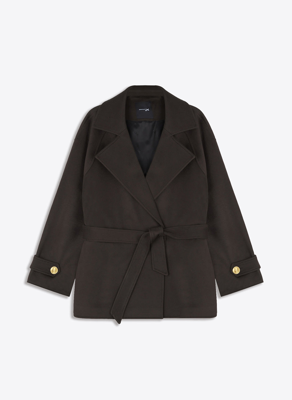 Le manteau court Odin affiche une coupe oversize à l’allure actuelle, mise en valeur par un grand col tailleur et une ceinture à nouer pour souligner la taille. Ses manches longues à emmanchures basses, ornées de pattes boutonnées dorées siglées "JV", ajoutent une note chic. Les fentes latérales offrent aisance et liberté de mouvement, tandis que la doublure intégrale en jacquard satiné logoté "JV" révèle un sens du détail raffiné.