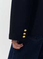 Le blazer oversize Olsen mise sur un double boutonnage à boutons dorés pour un effet lumineux et sophistiqué. Son col tailleur large apporte du caractère, tandis que les poches à rabat en biais structurent la silhouette avec dynamisme. Les fentes latérales offrent aisance et fluidité au mouvement. Entièrement doublé d’un jacquard ton sur ton signé "JV", il révèle un soin du détail et une finition haut de gamme.