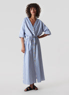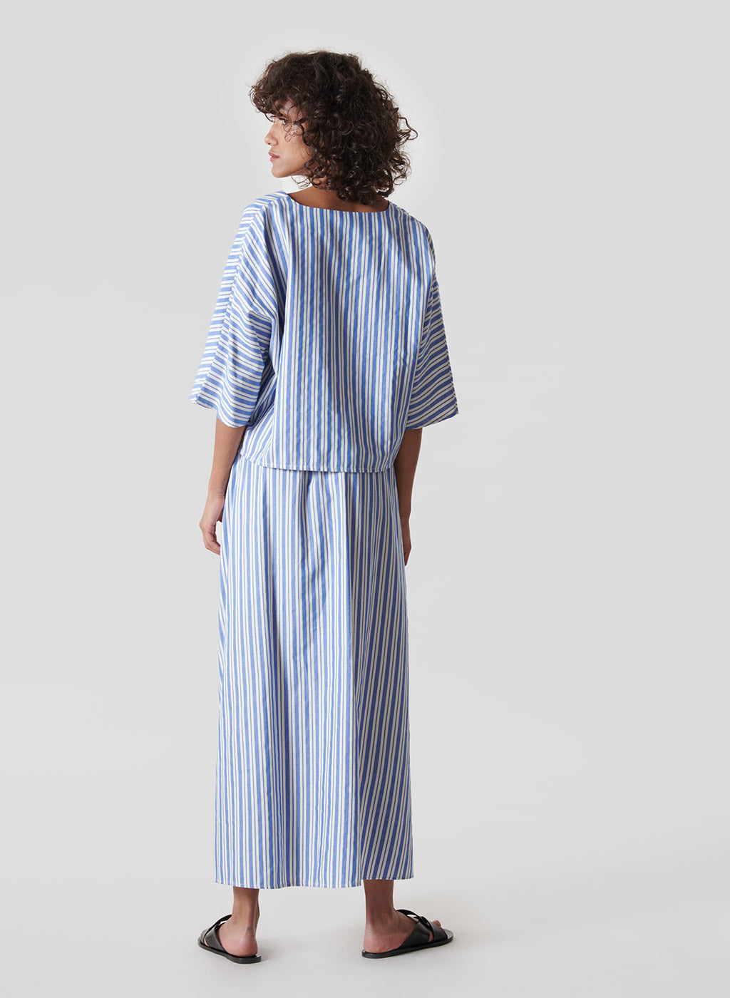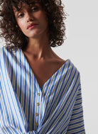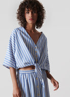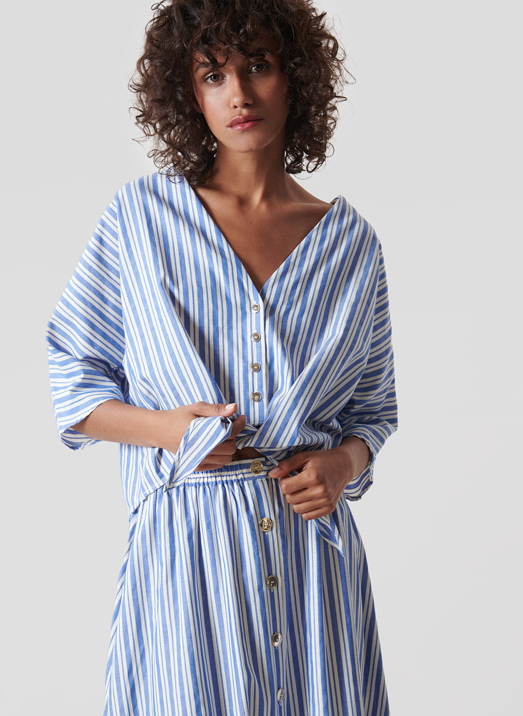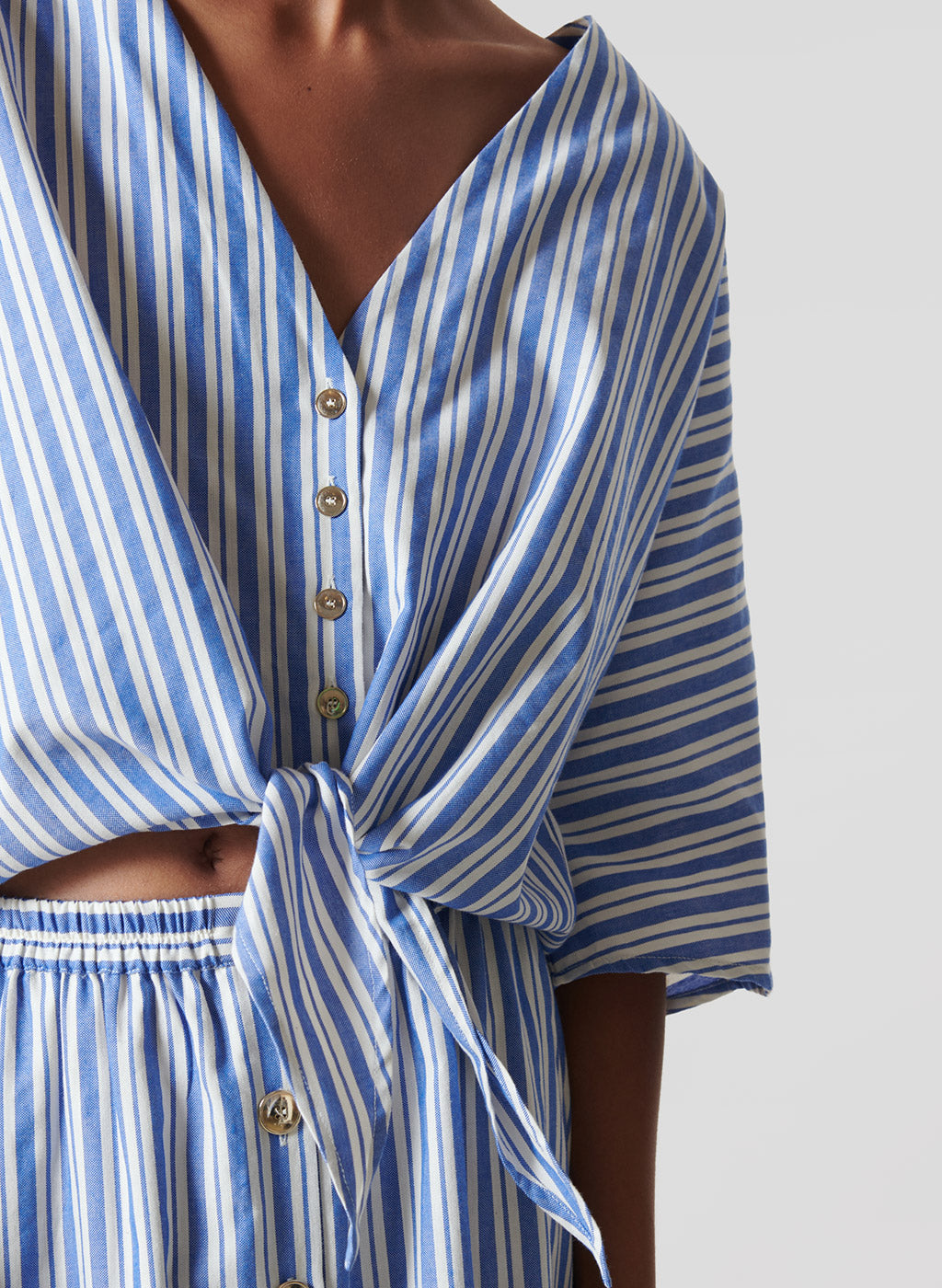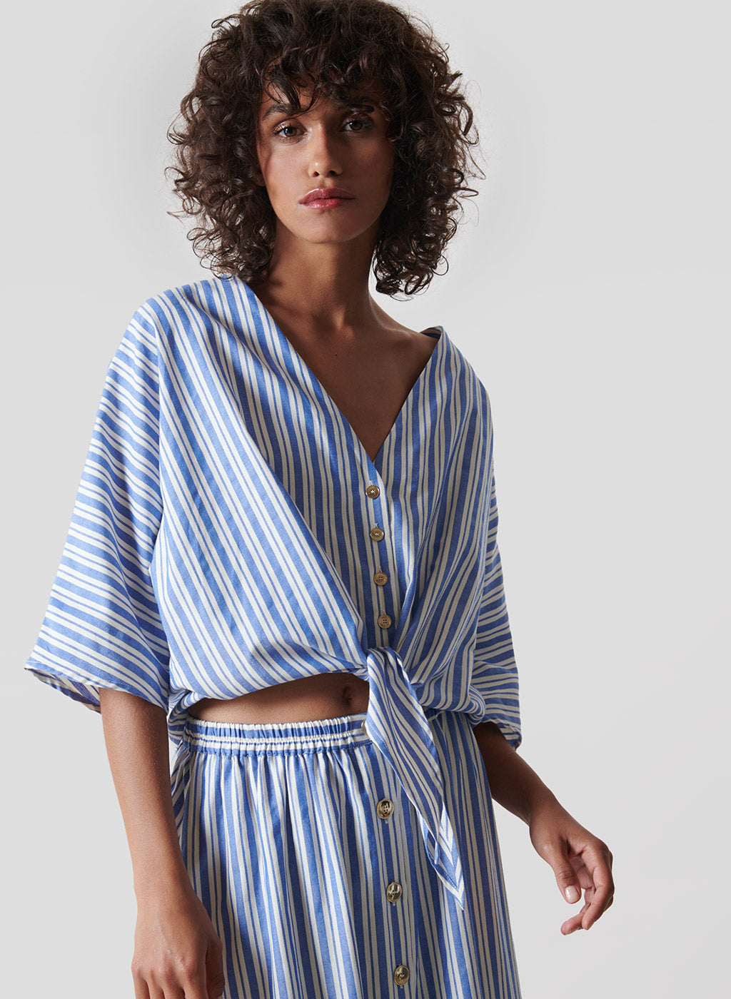 Le top Rivage en coton tissé blanc rayé bleu allie légèreté et élégance, idéal pour vos escapades estivales. Son tissage délicat apporte une texture raffinée tandis que sa coupe nouée à l’avant met joliment en valeur la silhouette. Doté d’une encolure en V féminine et de manchons chauve-souris, ce top offre une grande liberté de mouvement et un style décontracté-chic. La fermeture à l’avant est ornée de petits boutons dorés pour une touche subtile d’éclat. Sa coupe droite et sa base droite garantissent un porté confortable et polyvalent. Non doublé pour une sensation de légèreté optimale.